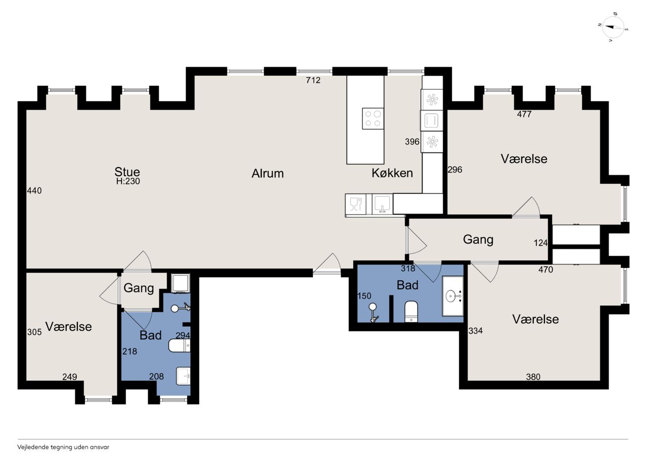 Denne lejlighed på Boyesgade 3, 1. tv., tilbyder 143 kvadratmeter fordelt på et rummeligt køkken-alrum, hvor lysindfaldet fra de store vinduer skaber et åbent og indbydende miljø. Herfra har du adgang til tre hyggelige værelser med garderaber, et privat badeværelse samt endnu et badeværelse med bruser og toilet.