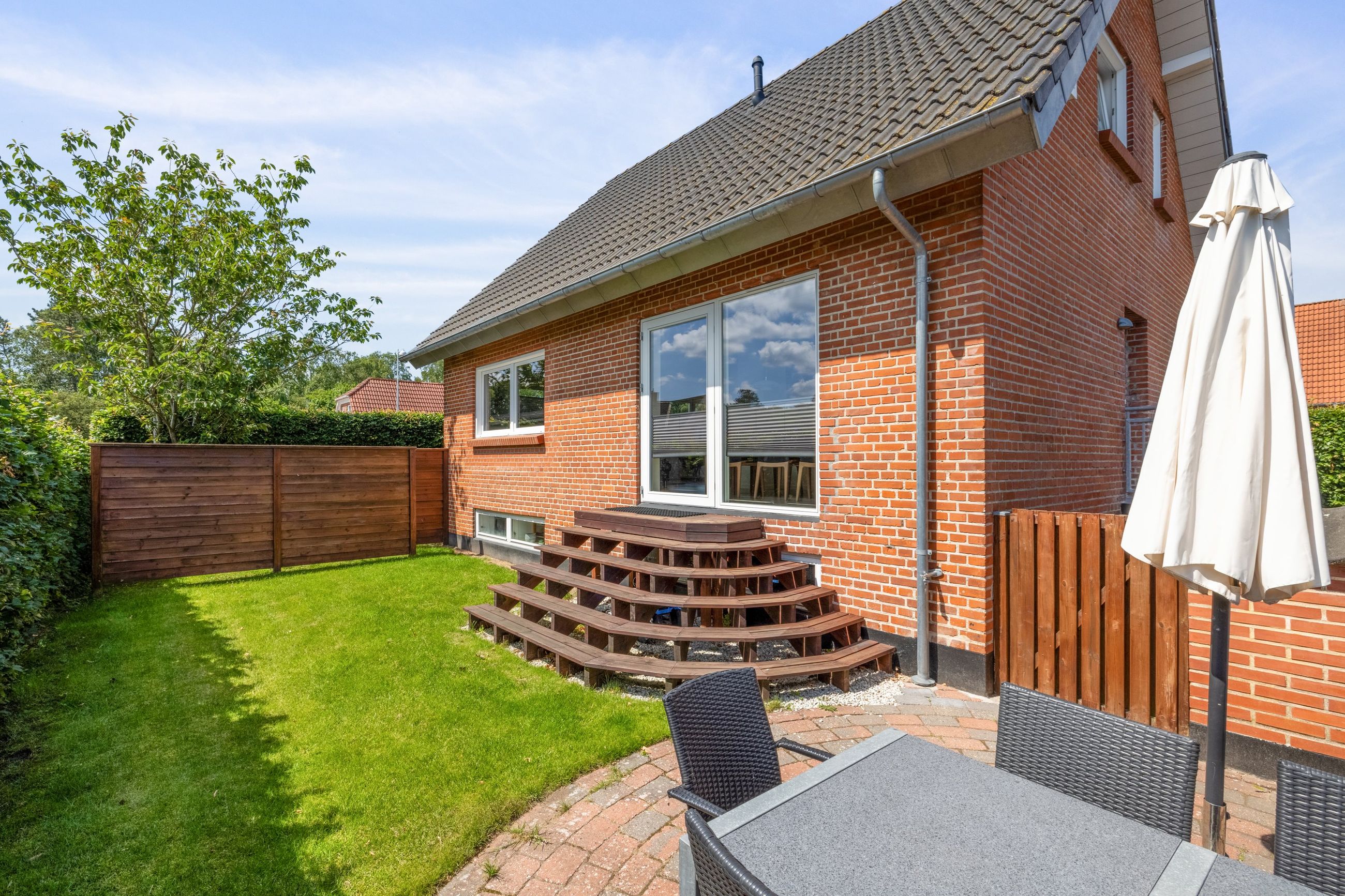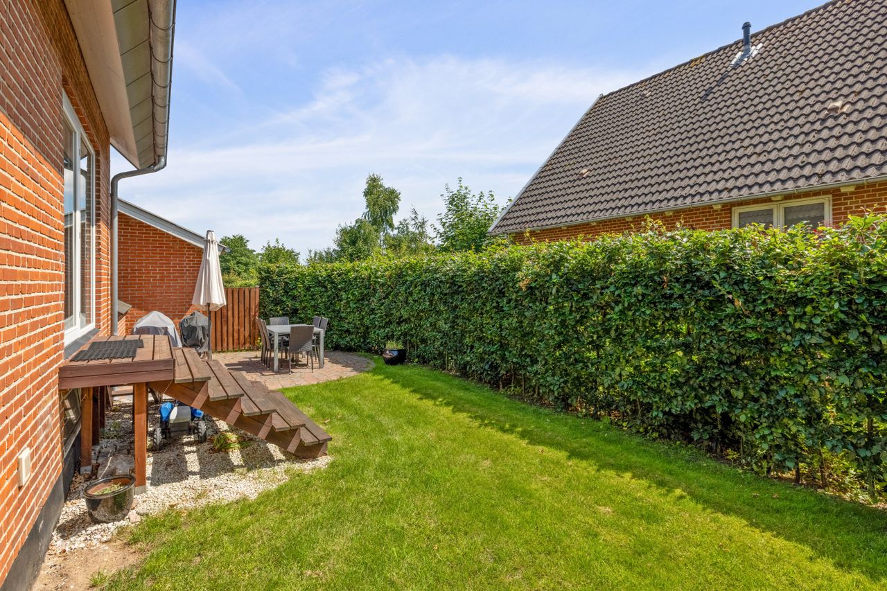 Haven er hyggelig og nem at holde med blomsterbede, græsplæne og en flot bøgehæk hele vejen rundt. Her er også en dejlig, lukket terrasse til udeliv og grillhygge.