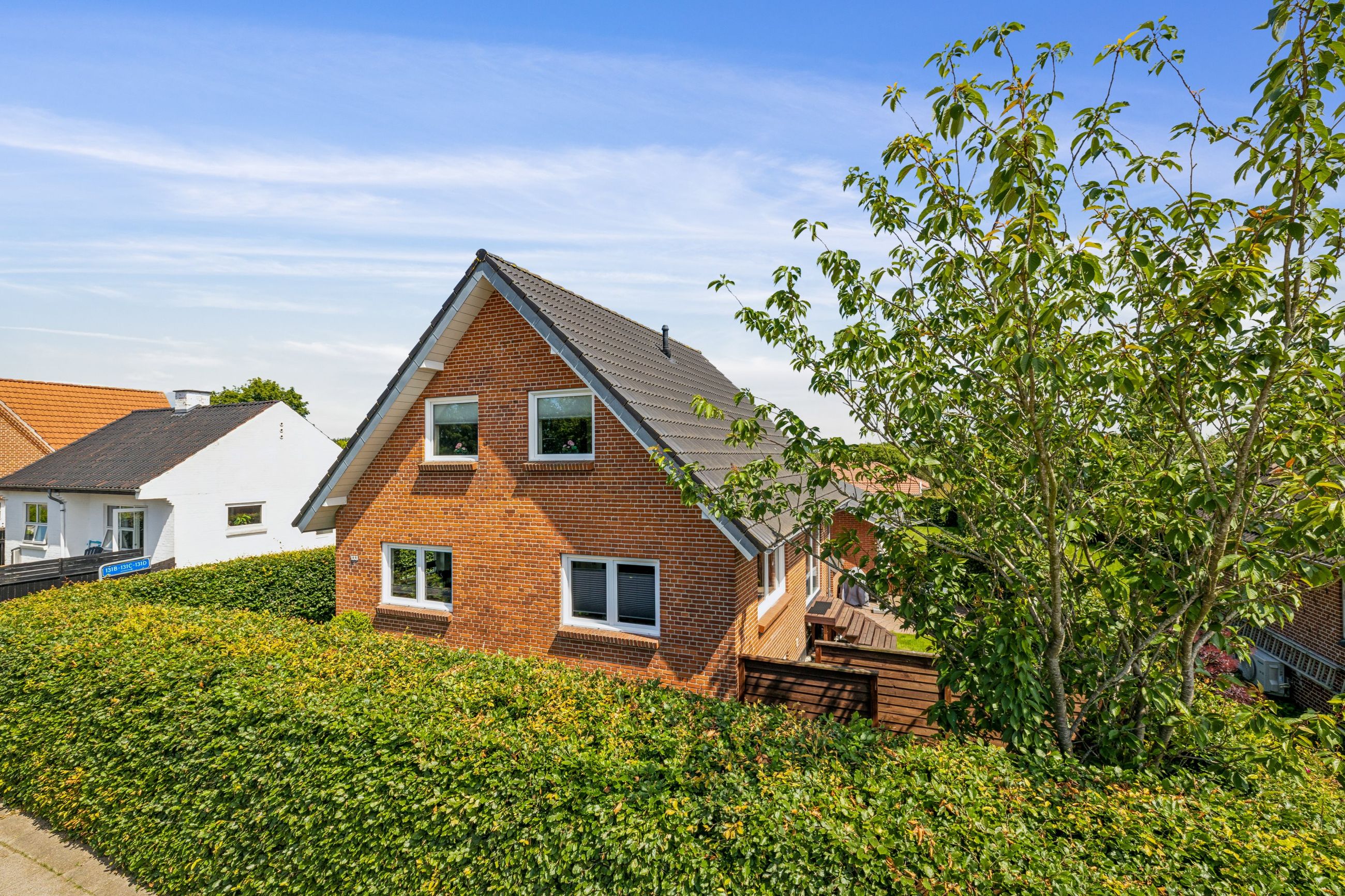 Hertil kommer en flisebelagt indkørsel og en stor, muret dobbeltgarage med el-porte og god plads til biler, værksted eller opbevaring.