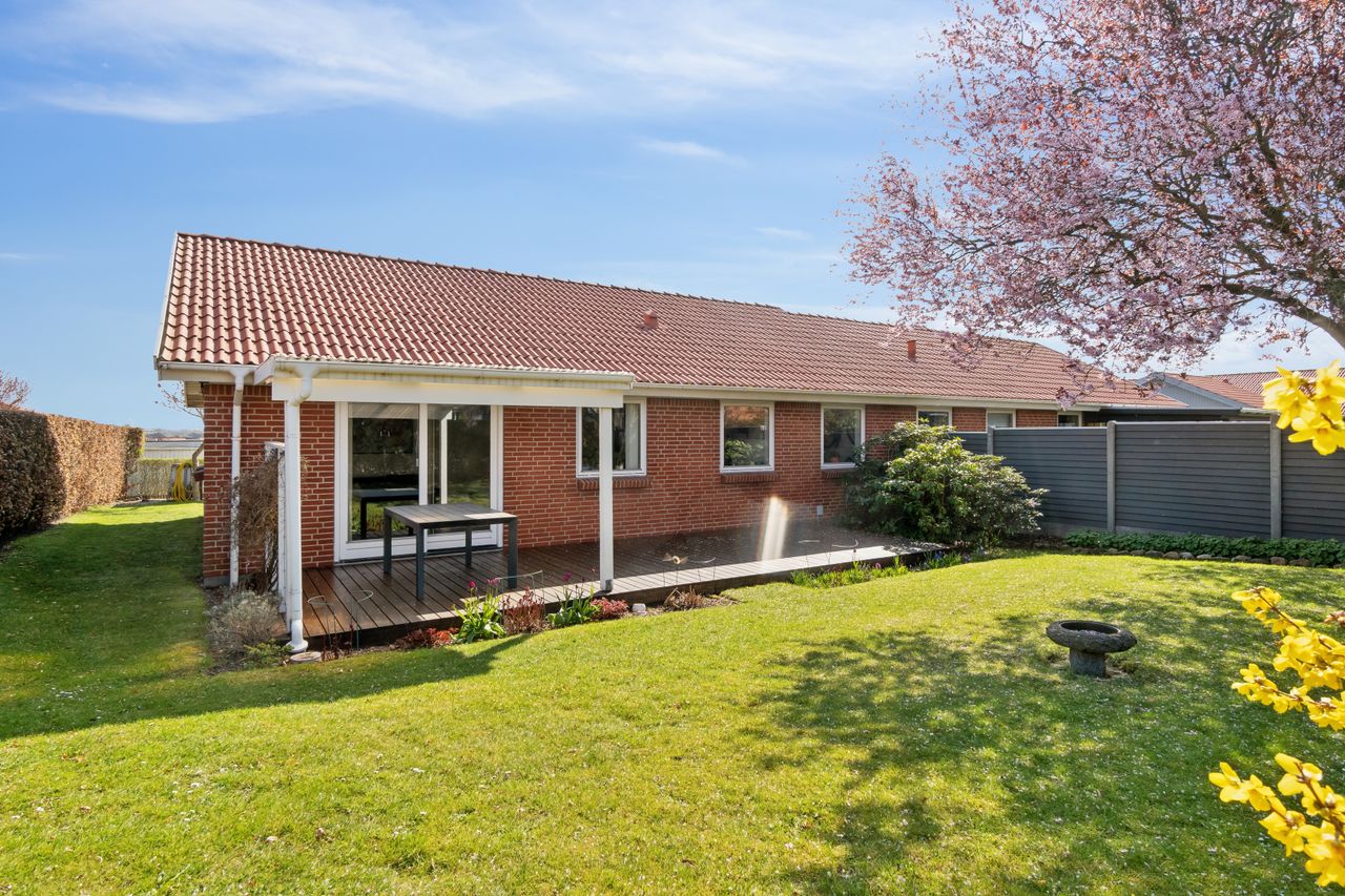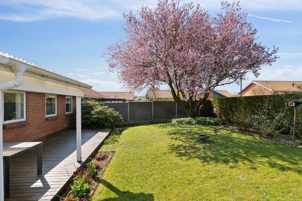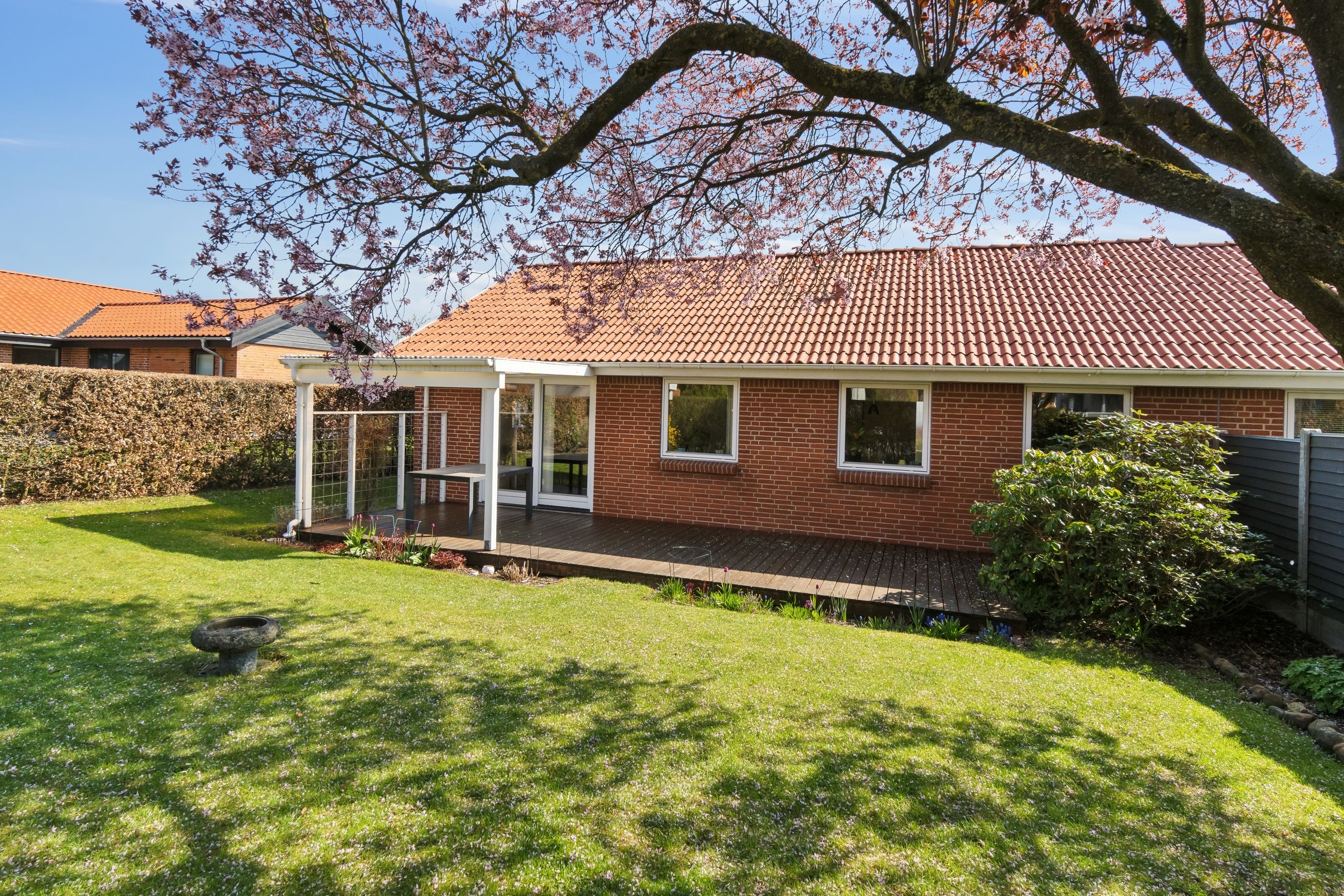 Udenfor får du glæde af en overskuelig have med græsplæne, terrasse og hæk omkring – perfekt til både afslapning og leg.