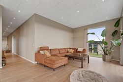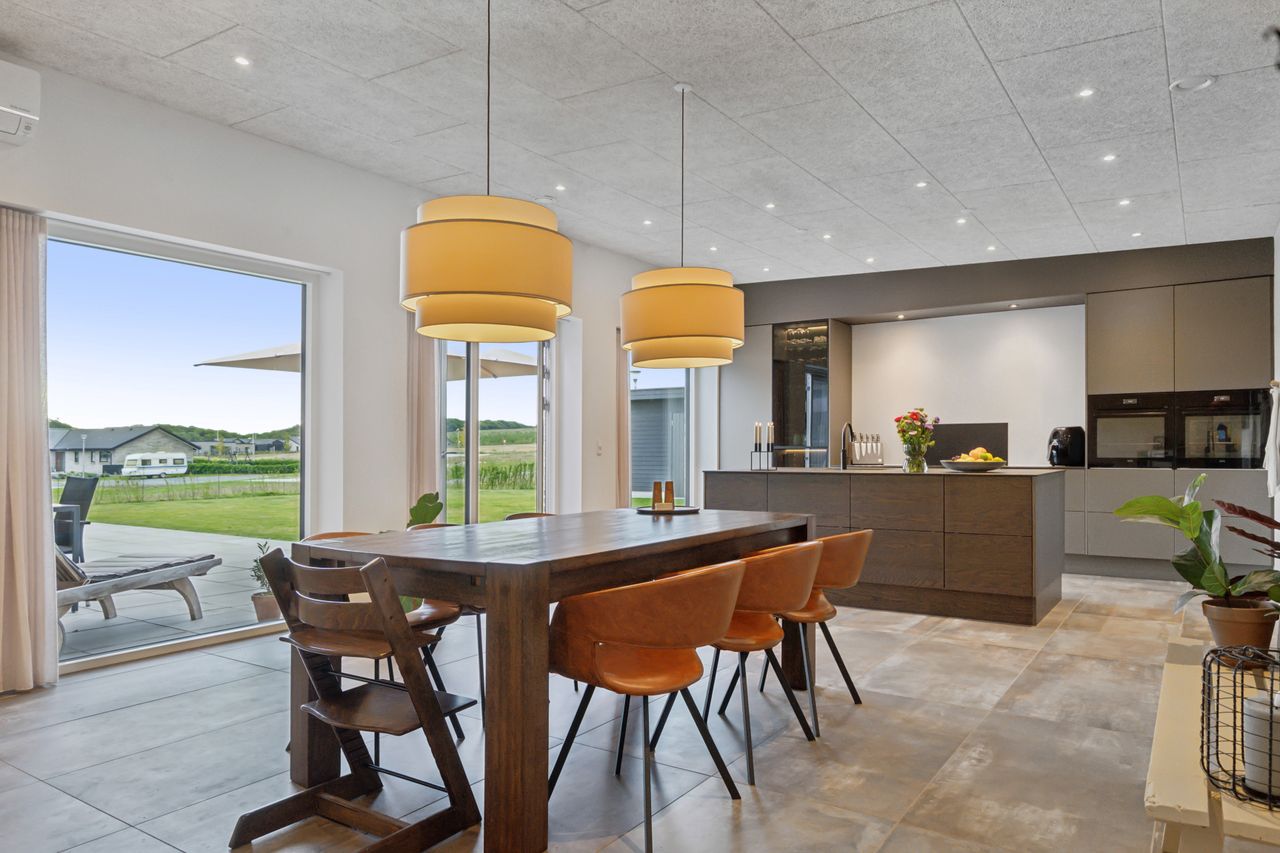 Planløsningen er både veldisponeret og familievenlig. Det store og åbne køkken-alrum fungerer som hjemmets naturlige samlingspunkt og indbyder til både madlavning, hyggelige stunder og samvær med familie og venner. Fra alrummet er der direkte udgang til en solrig terrasse og haven, som giver mulighed for udeliv i lækre rammer – perfekt til både afslapning og leg.