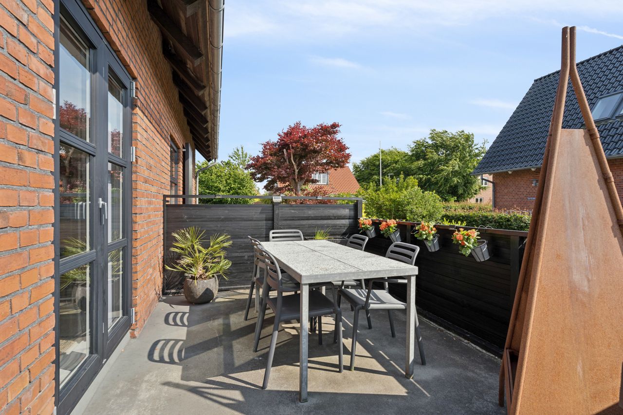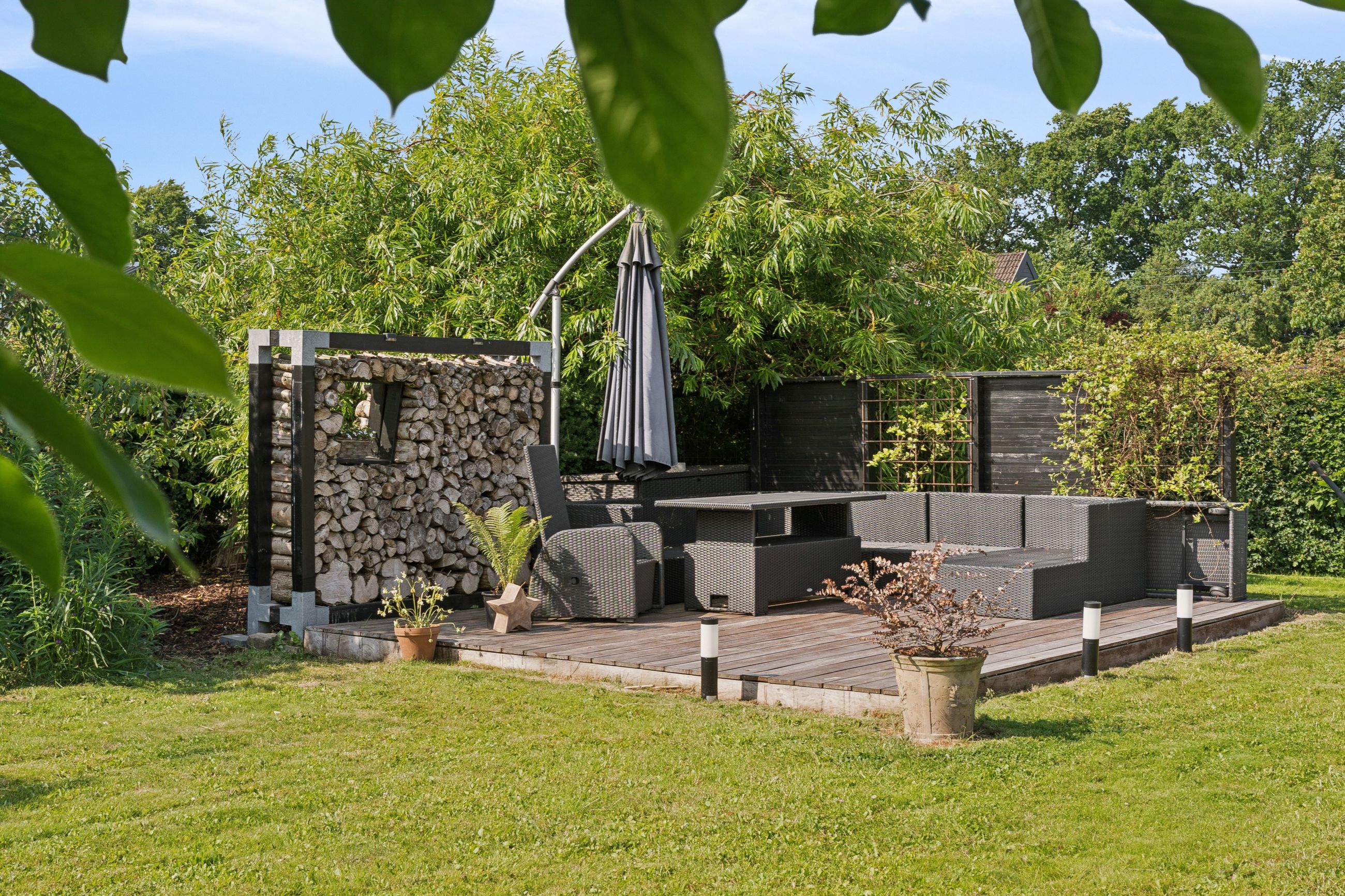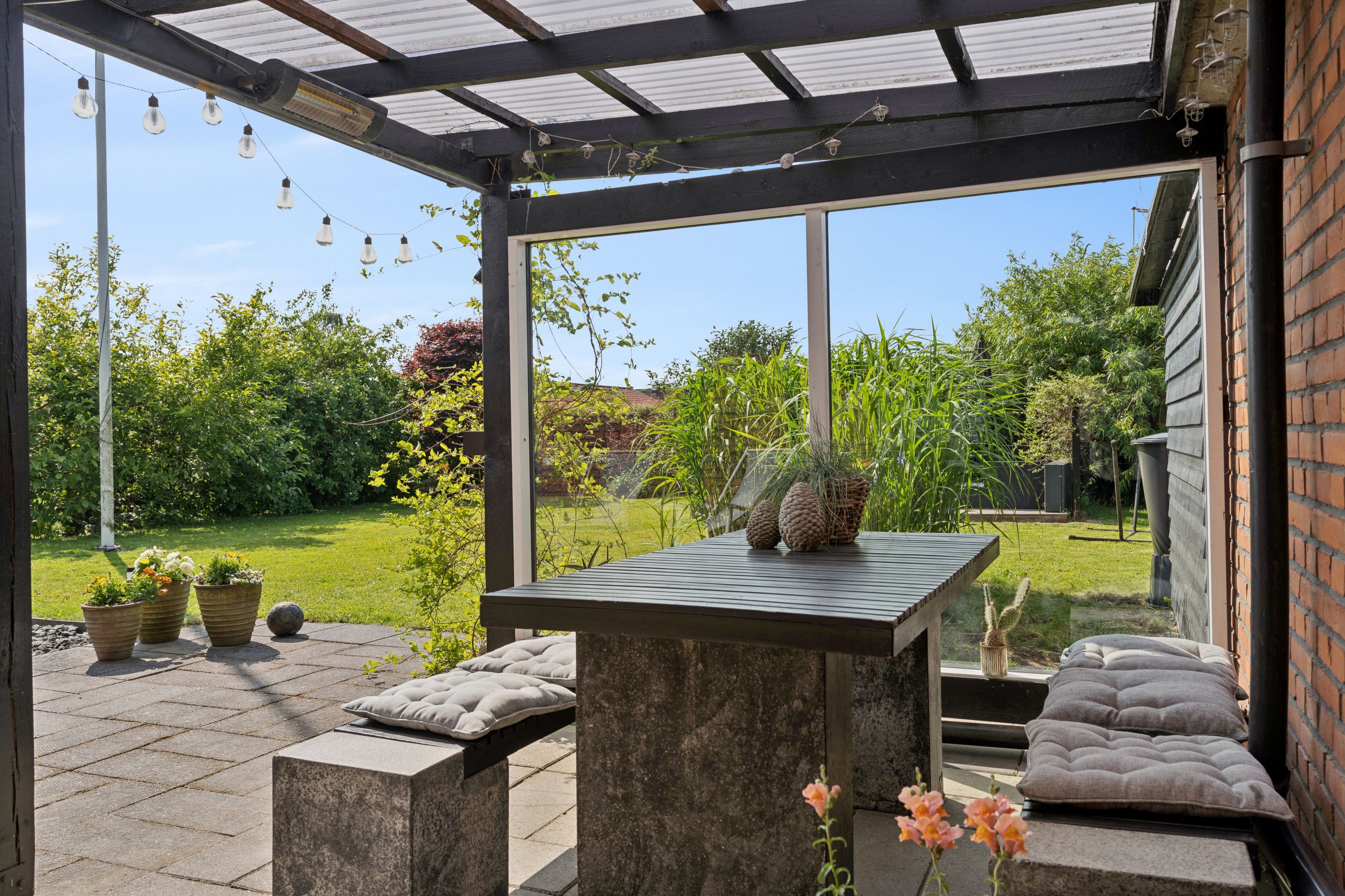 Udenfor finder du en hyggelig og overskuelig have, som indbyder til både afslapning og udendørs aktiviteter. Haven er omgivet af grønne rammer, der giver en rar og privat atmosfære, og med gode solforhold kan du nyde udelivet det meste af dagen.