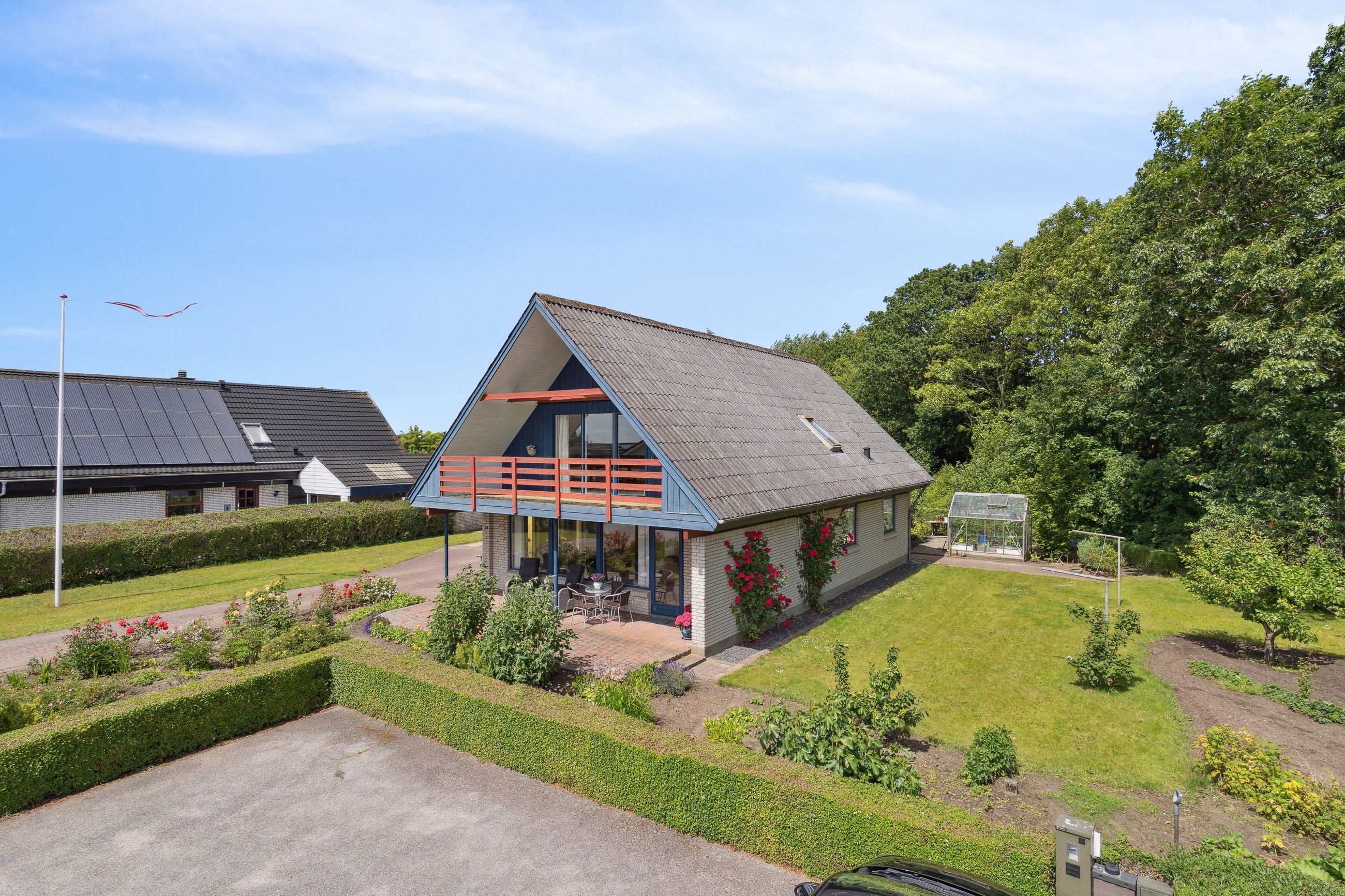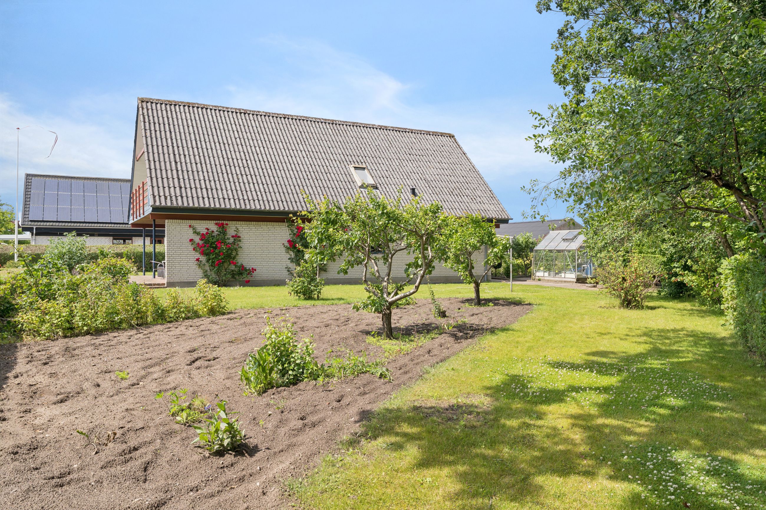 Udenfor venter en skøn, opvokset have med solrige terrasser, grønne arealer og en rolig atmosfære – ideel til både leg, afslapning og hyggelige stunder med familie og venner. Til ejendommen hører også en rummelig garage og gode opbevaringsmuligheder.