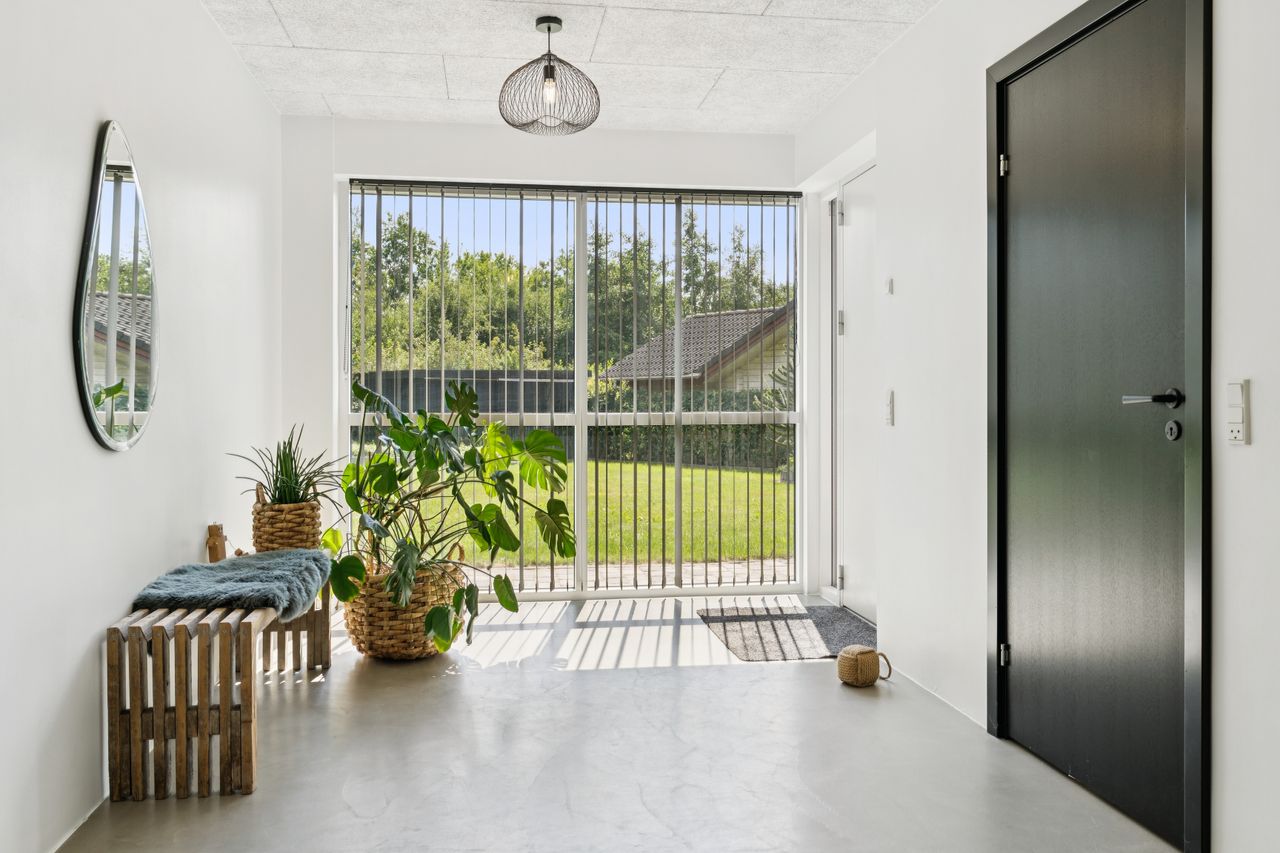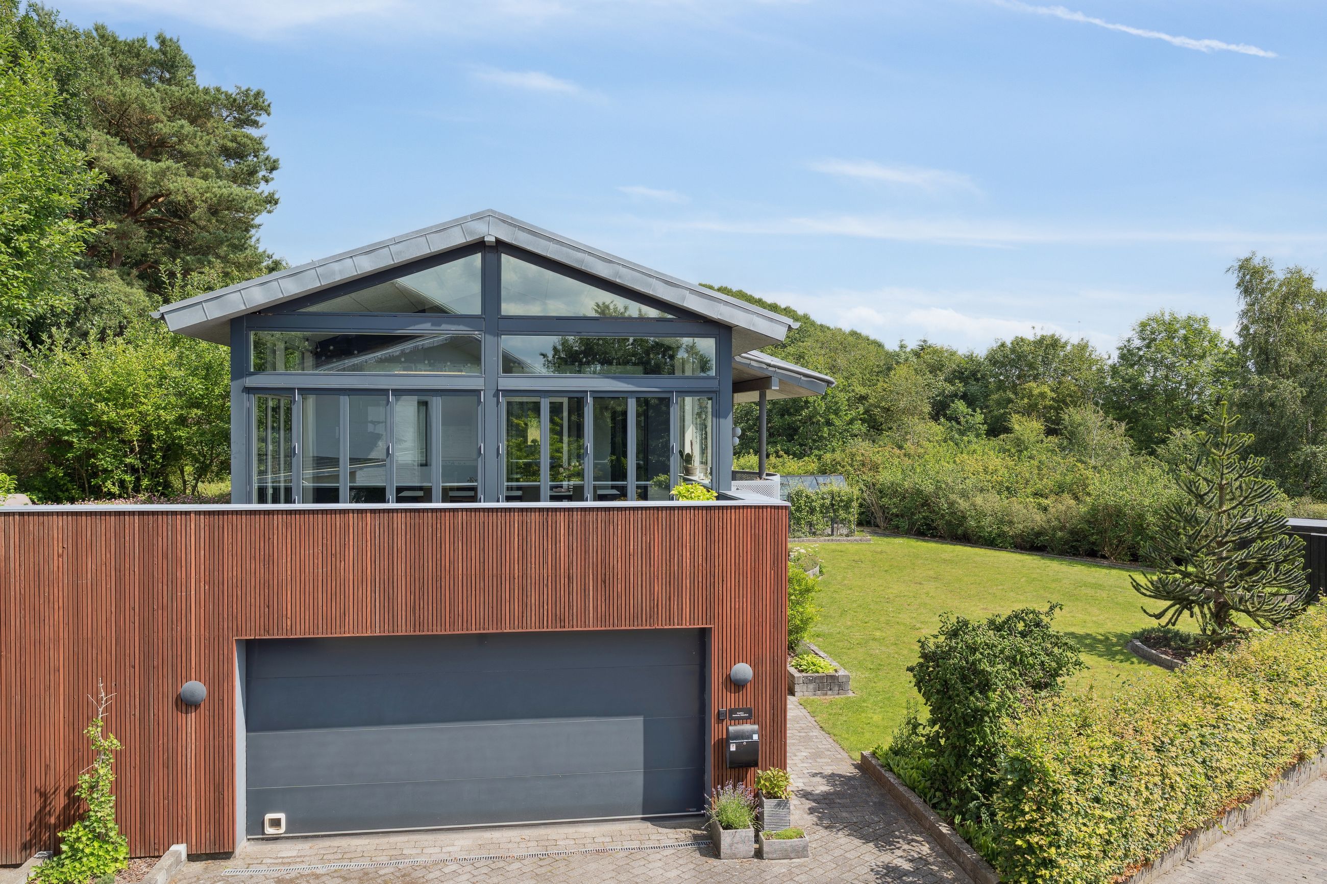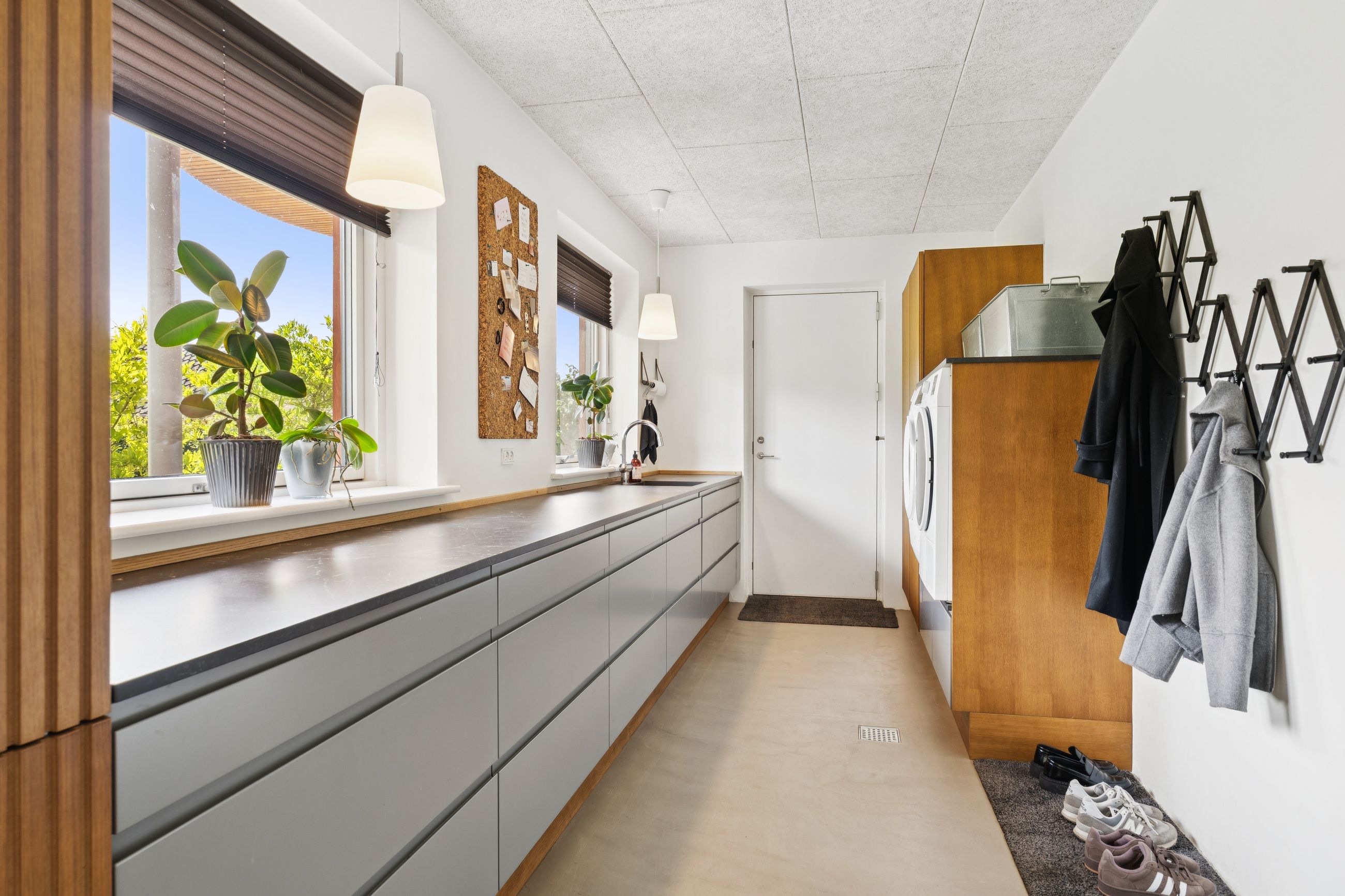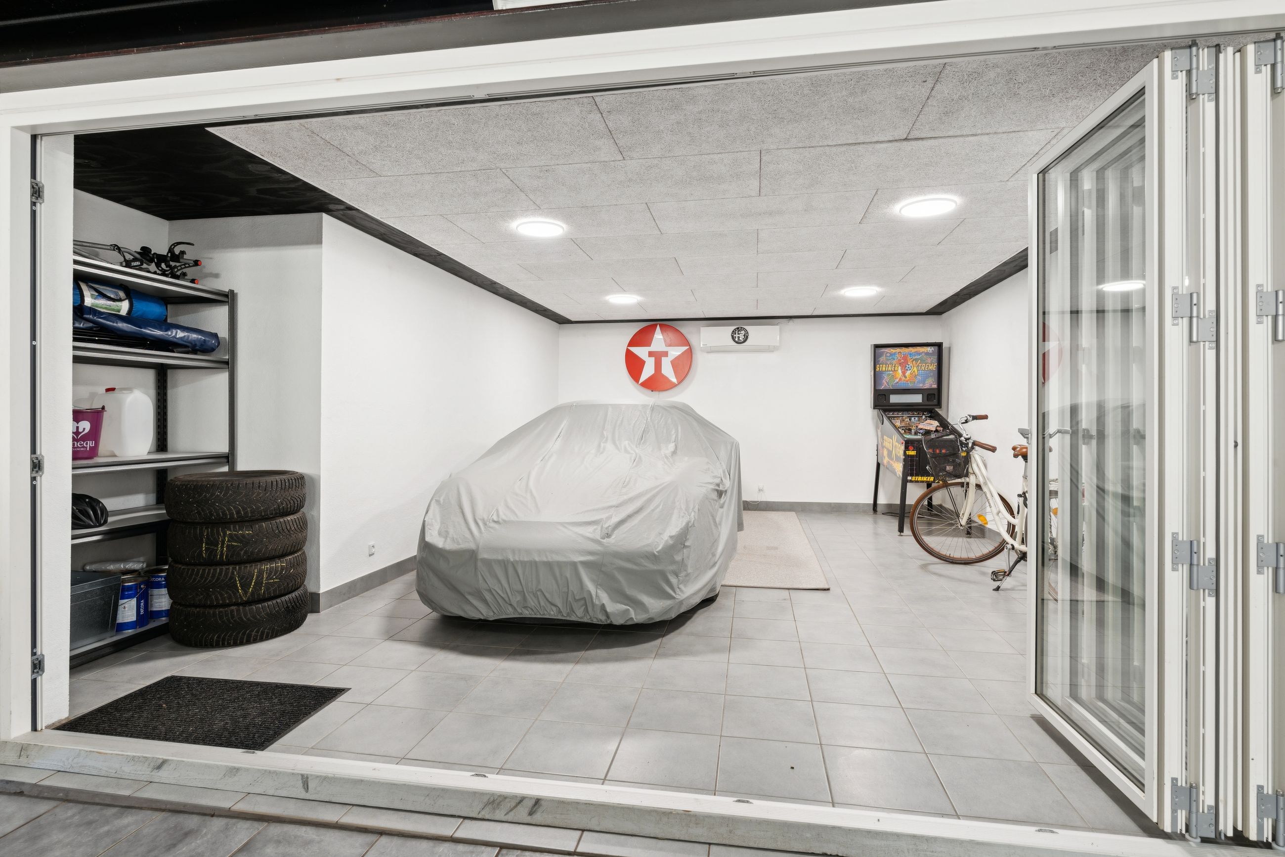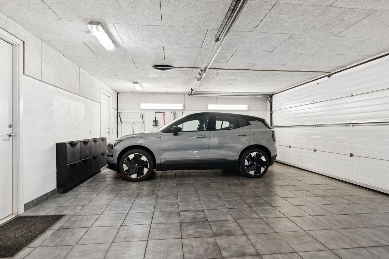 Et af husets store plusser er den imponerende garage med plads til hele fire biler – en sjælden luksus, der både giver praktiske muligheder og ekstra opbevaringsplads. Garagen er integreret i helheden og fuldender det moderne udtryk, som huset i øvrigt fremstår med.