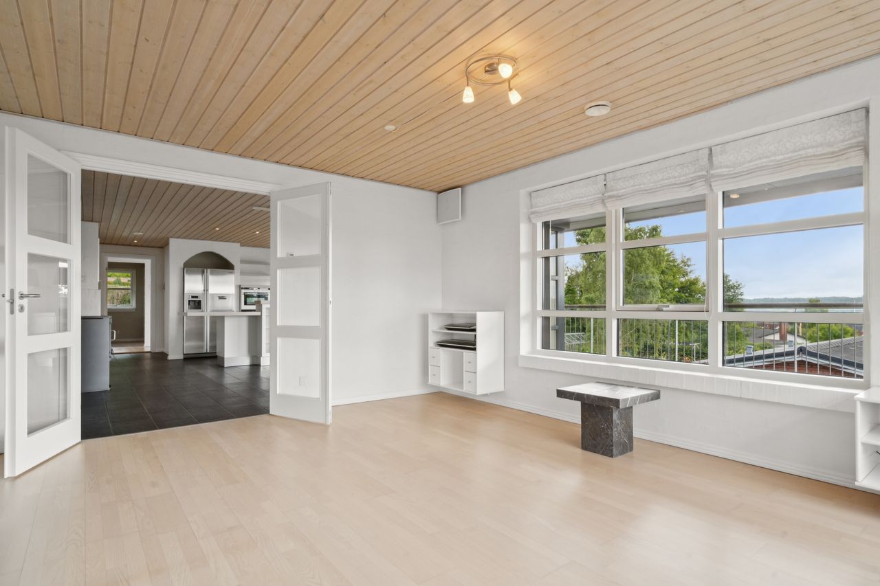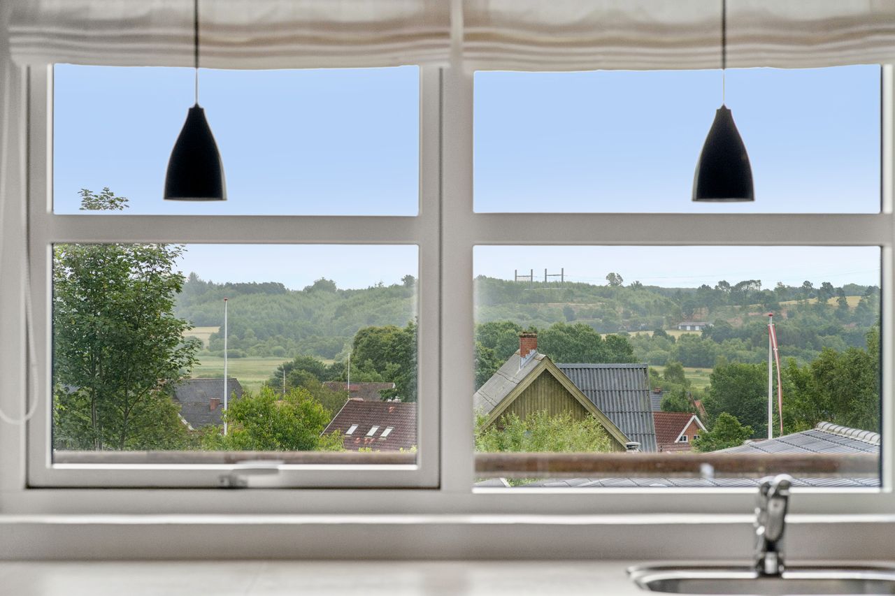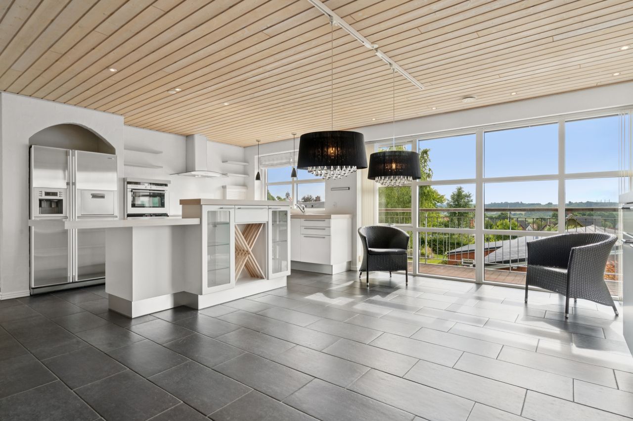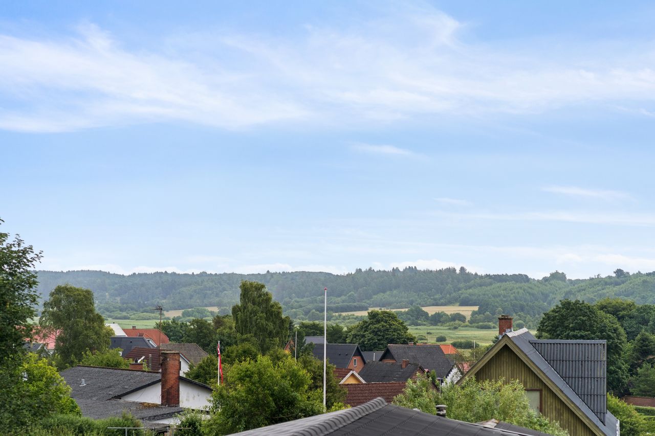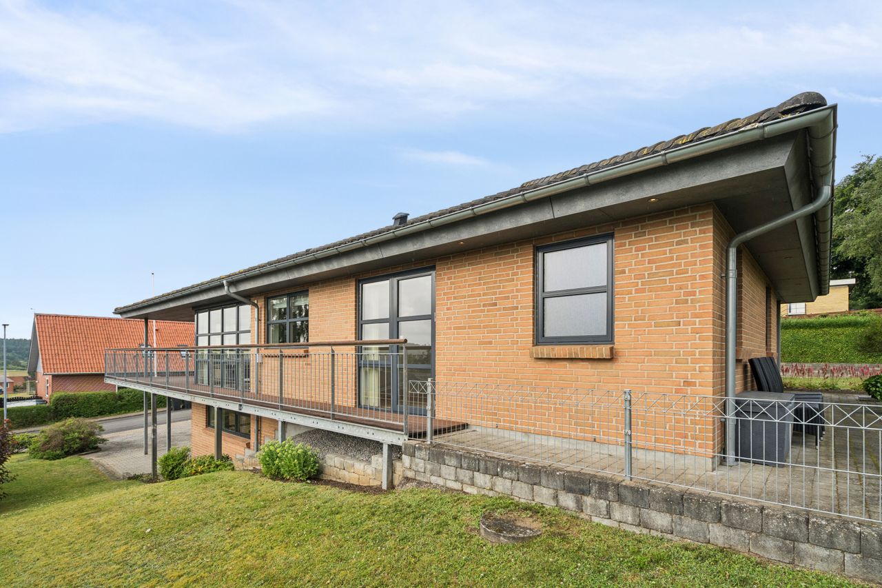 Boligen byder på god plads og en veldisponeret planløsning med hele 4 værelser, 2 badeværelser samt store, lyse opholdsrum. Hjemmets naturlige samlingspunkt er det åbne køkken-alrum og stueområde, hvorfra der er udgang til en sydvendt terrasse – perfekt placeret til sol det meste af dagen og med frit udsyn over dalen. Her er plads til både loungemøbler og spiseplads, og den private beliggenhed gør udelivet ekstra attraktivt.