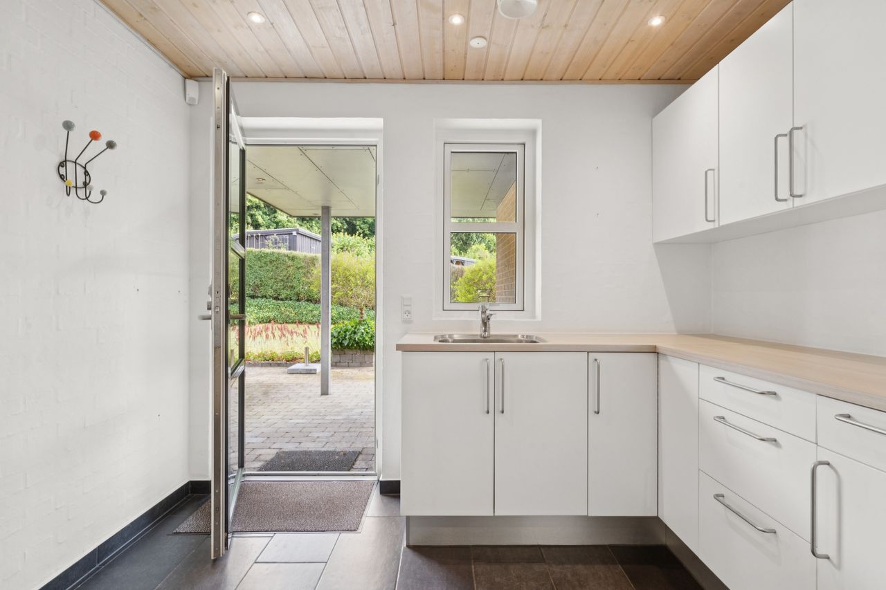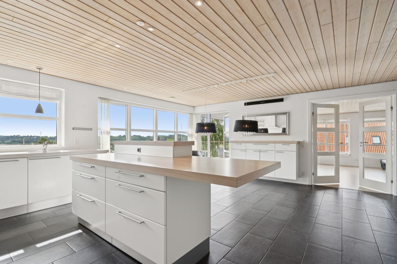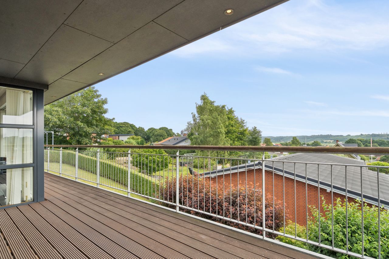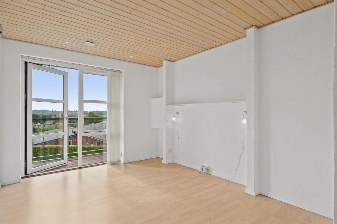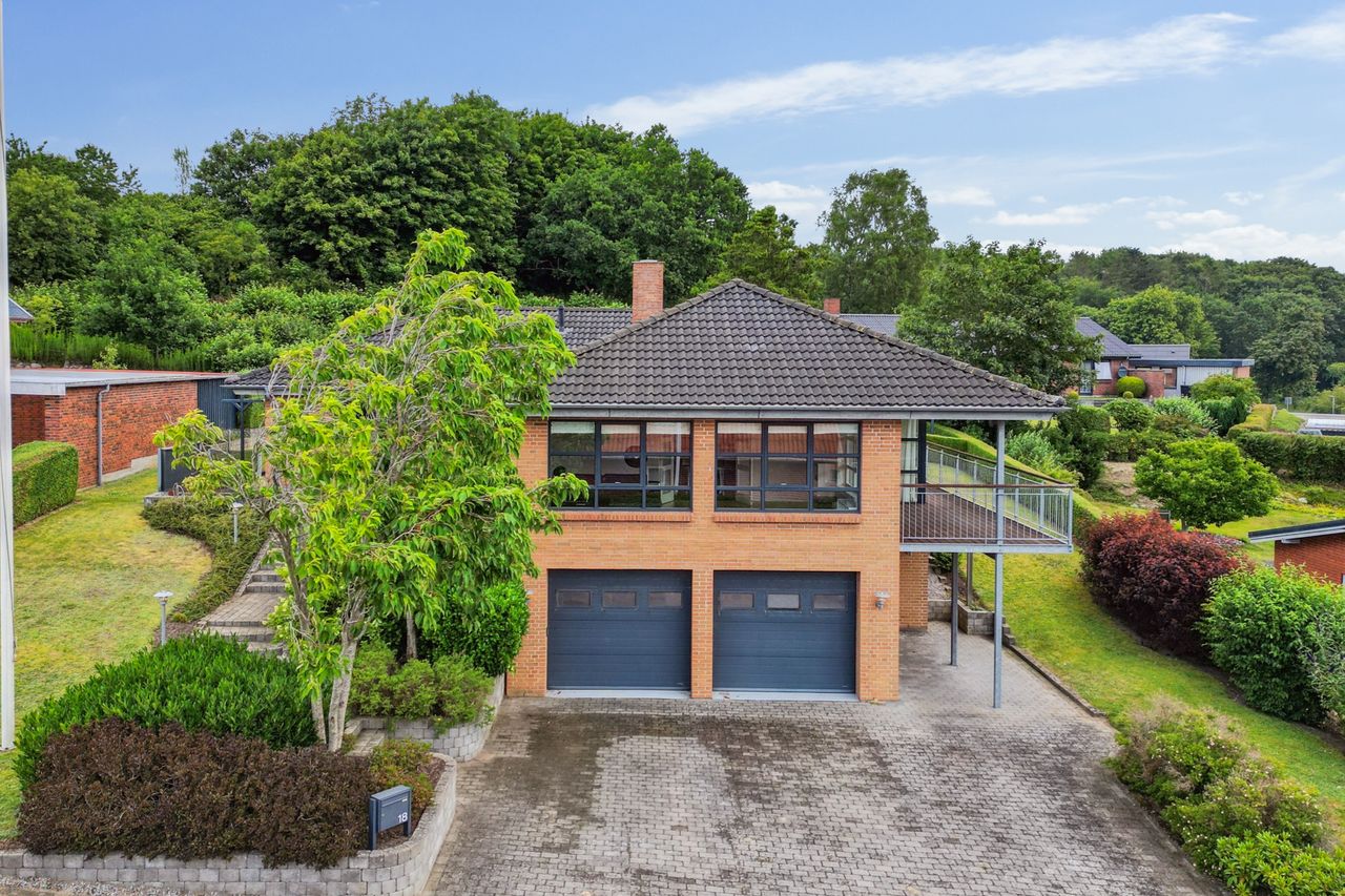 Boligen byder på god plads og en veldisponeret planløsning med hele 4 værelser, 2 badeværelser samt store, lyse opholdsrum. Hjemmets naturlige samlingspunkt er det åbne køkken-alrum og stueområde, hvorfra der er udgang til en sydvendt terrasse – perfekt placeret til sol det meste af dagen og med frit udsyn over dalen. Her er plads til både loungemøbler og spiseplads, og den private beliggenhed gør udelivet ekstra attraktivt.