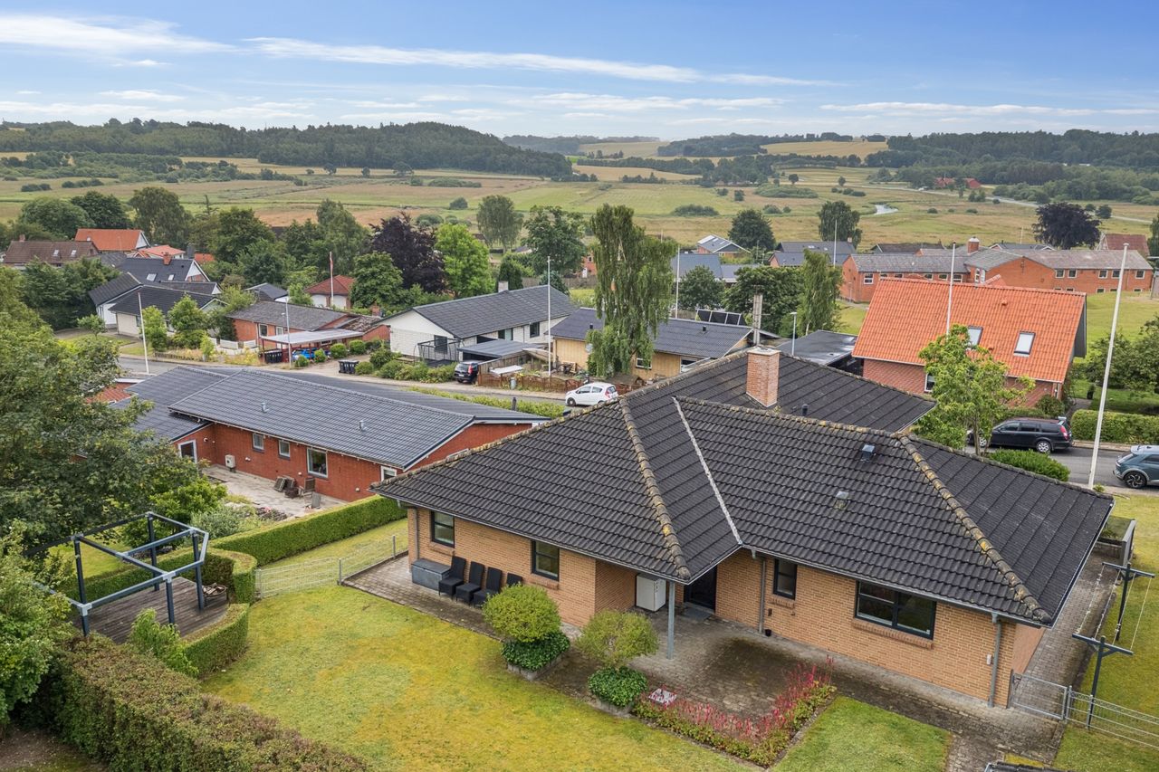 Velkommen til Skolvangen 18 – en velholdt og fuldmuret villa fra 2006, beliggende i rolige og naturskønne omgivelser i Vejrumbro. Her får du en sjældent ugenert beliggenhed med en enestående udsigt over det smukke landskab i Nørreådalen – direkte fra både stue, terrasse og have.