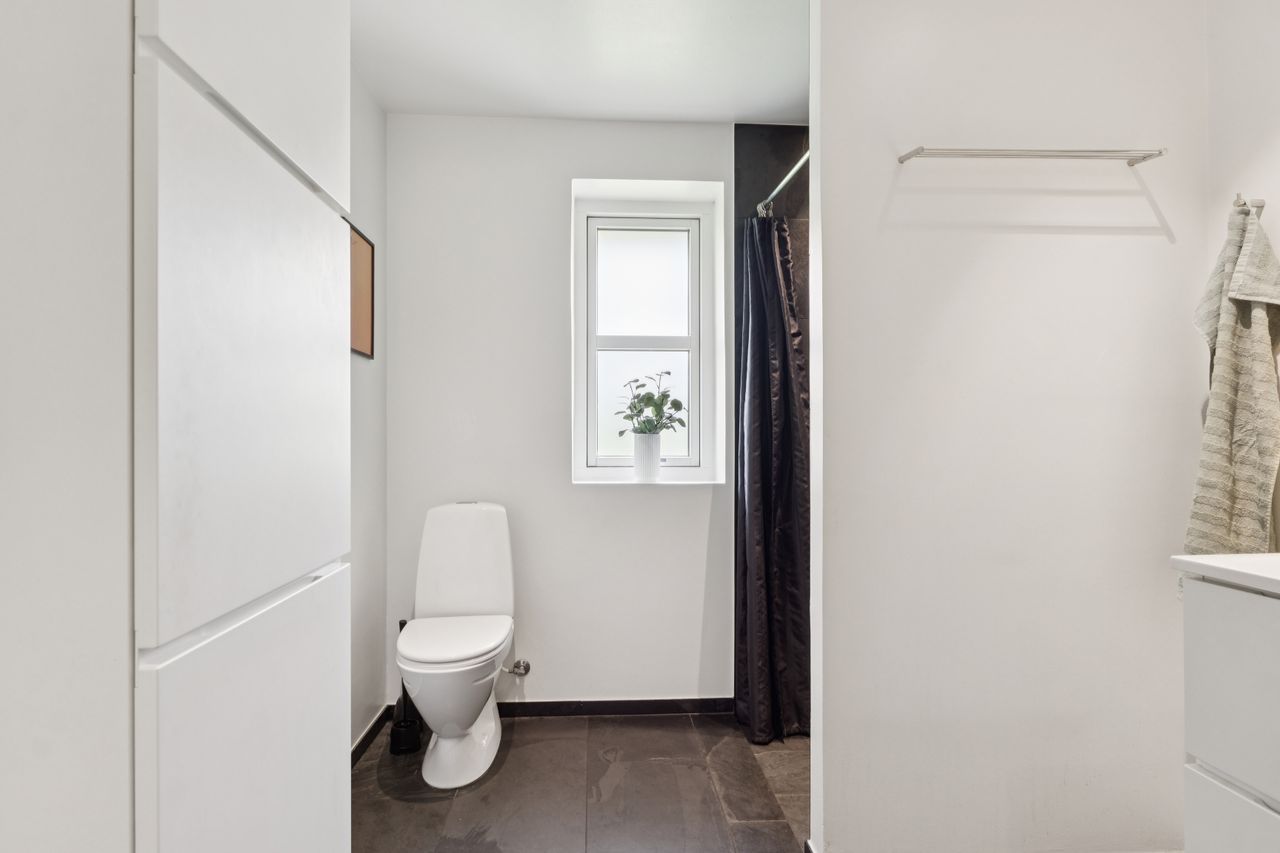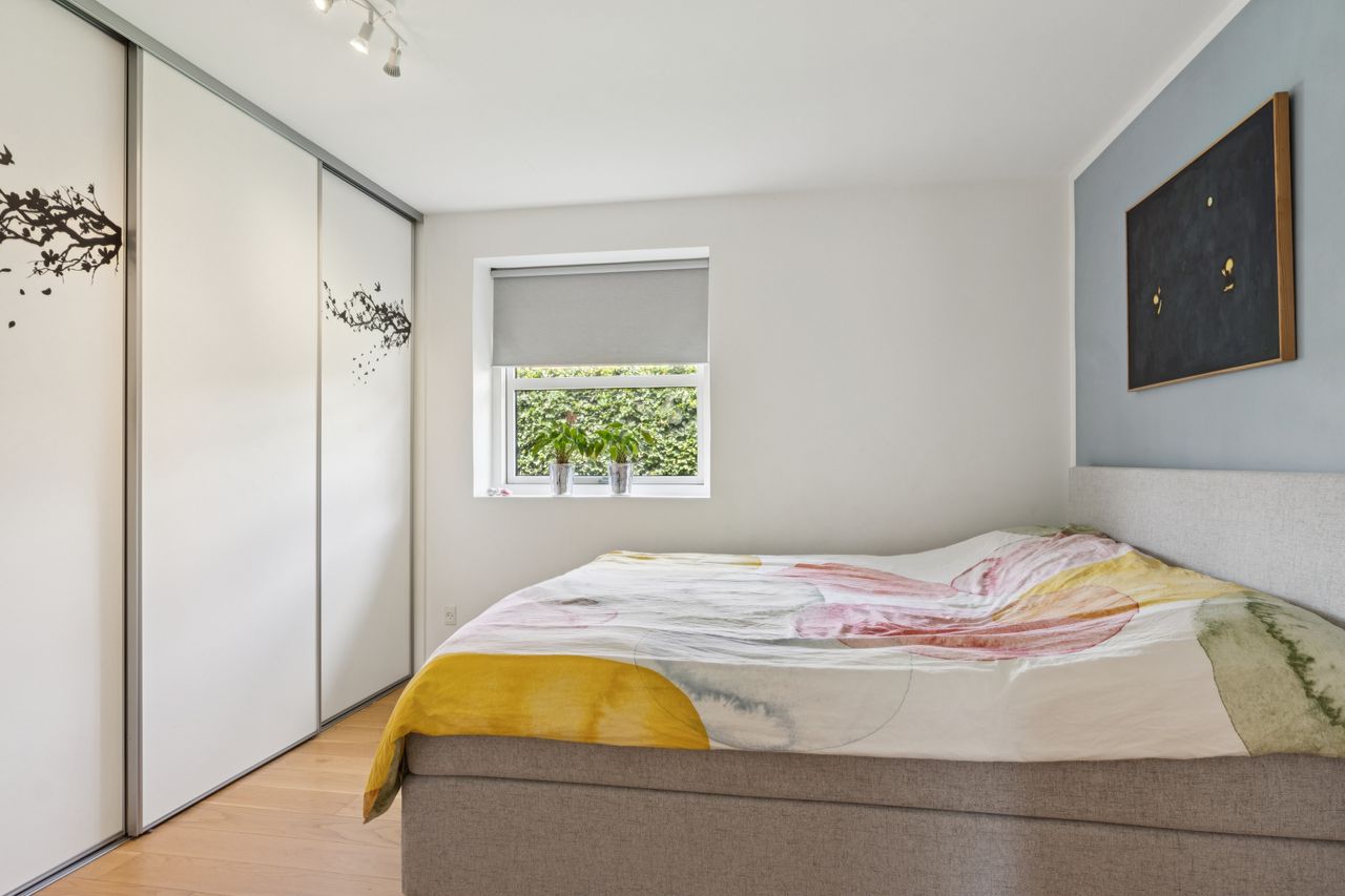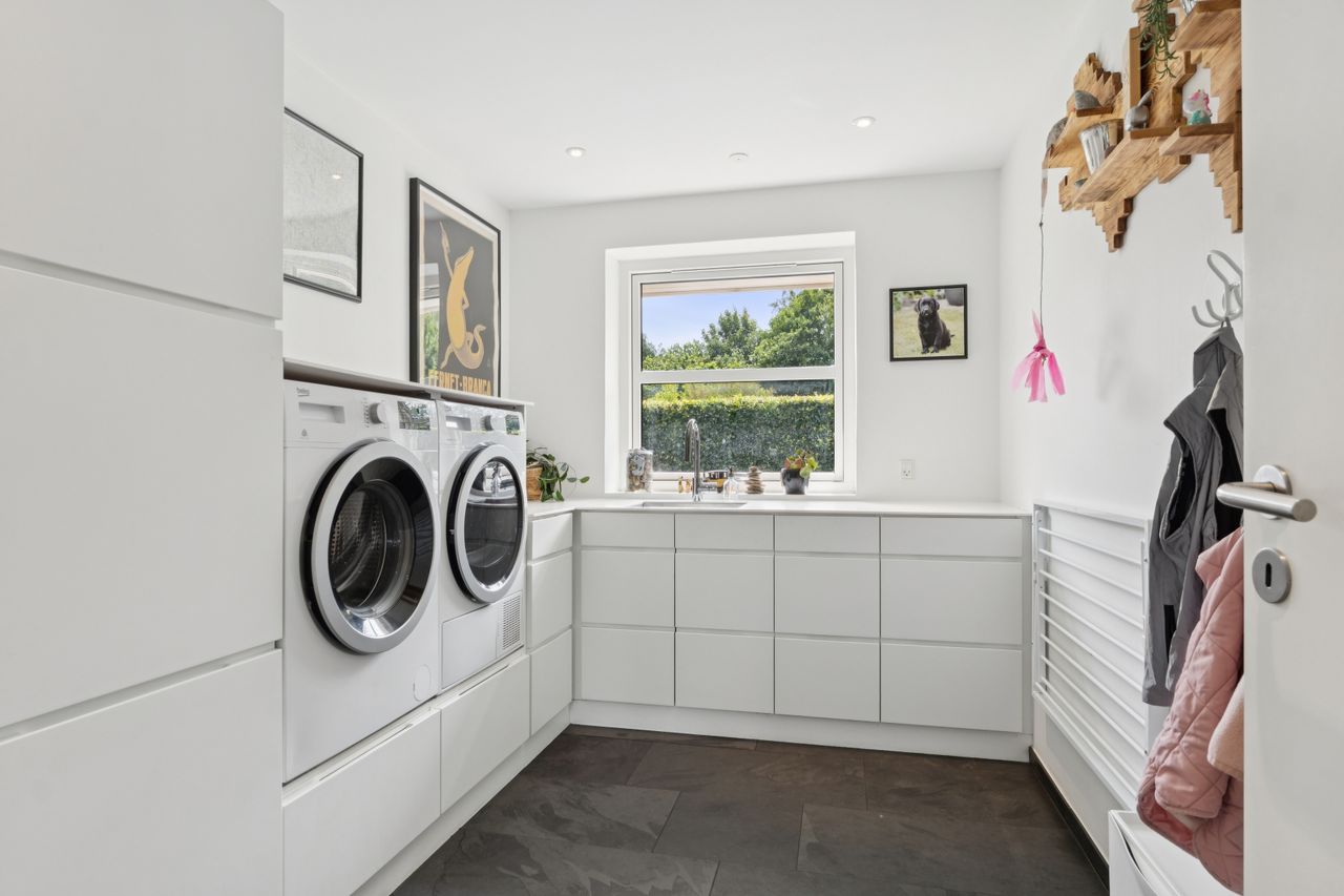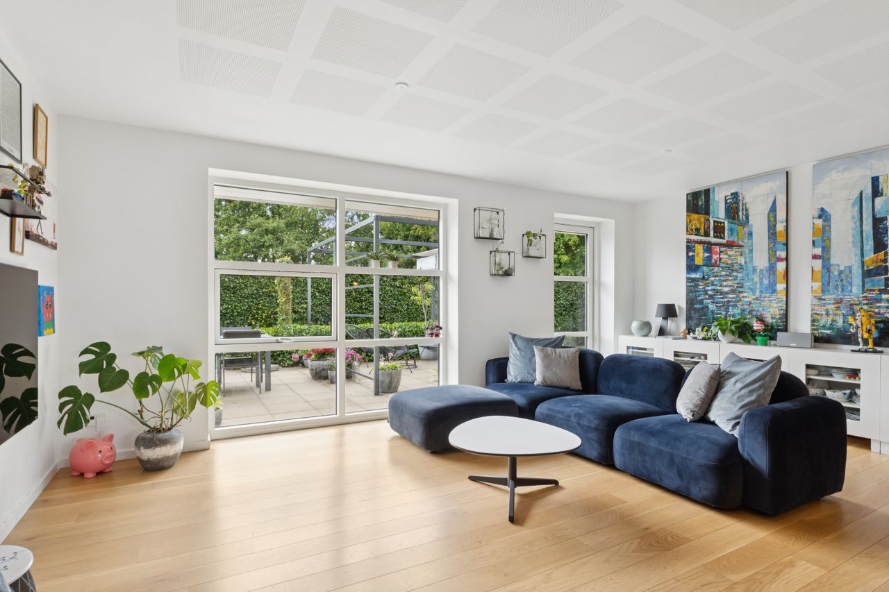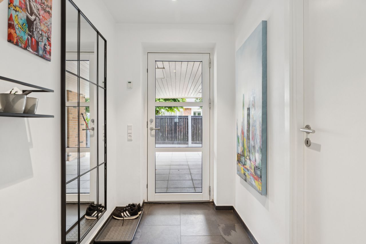 Boligen er opført med fokus på komfort og æstetik. Indenfor mødes du af lyse og indbydende rum med gipslofter og lydfelter, som skaber en behagelig akustik og en rolig atmosfære. Gulvene er en elegant kombination af natur skifer og smukke trægulve, som giver hjemmet et varmt og eksklusivt udtryk.