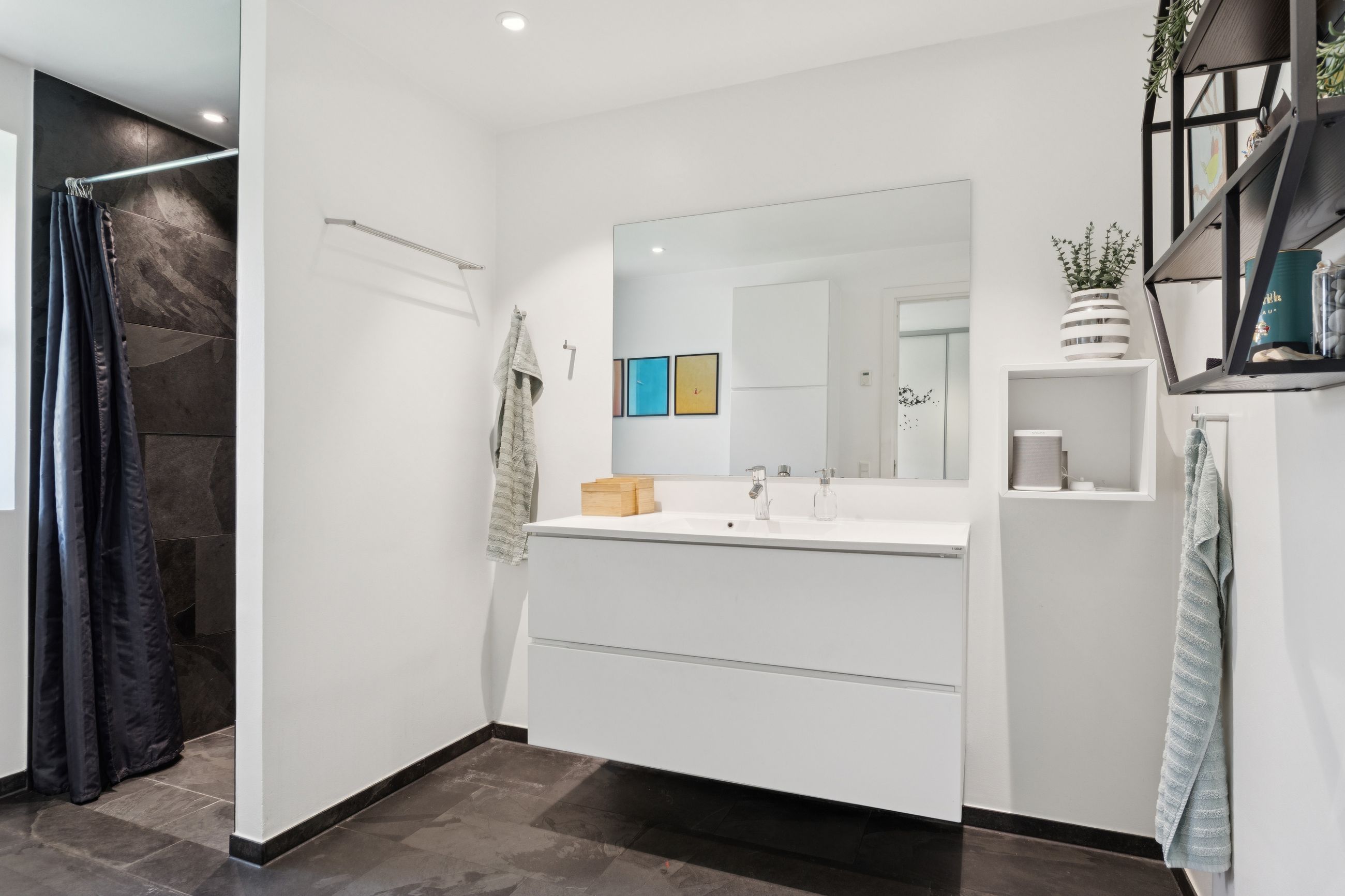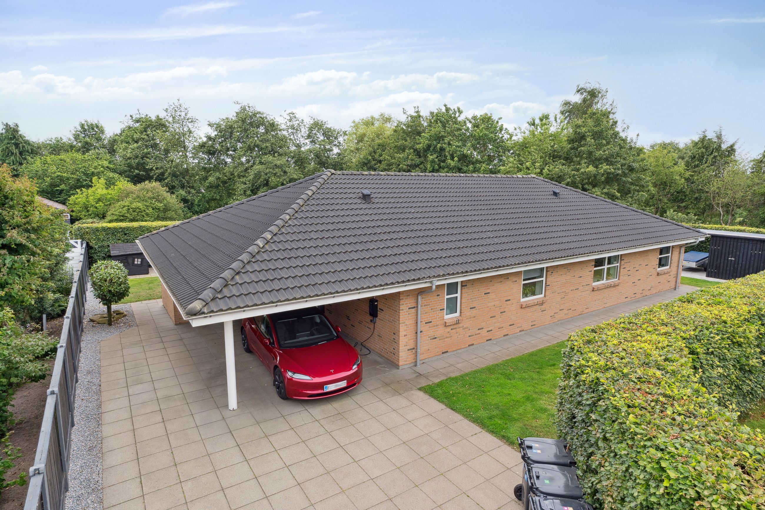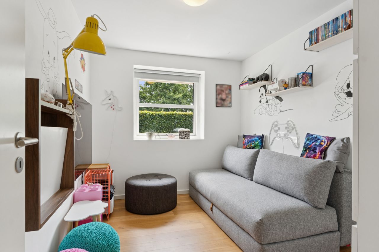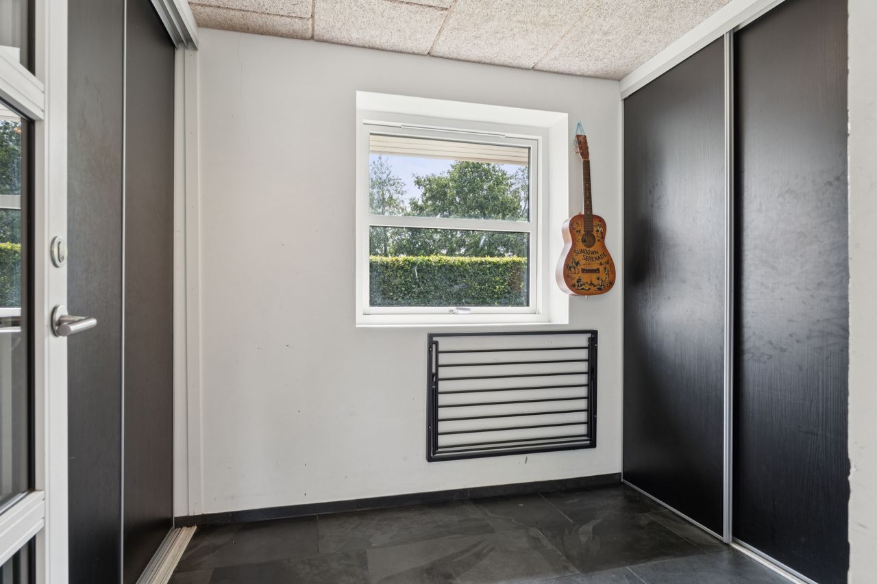 Boligen er opført med fokus på komfort og æstetik. Indenfor mødes du af lyse og indbydende rum med gipslofter og lydfelter, som skaber en behagelig akustik og en rolig atmosfære. Gulvene er en elegant kombination af natur skifer og smukke trægulve, som giver hjemmet et varmt og eksklusivt udtryk.