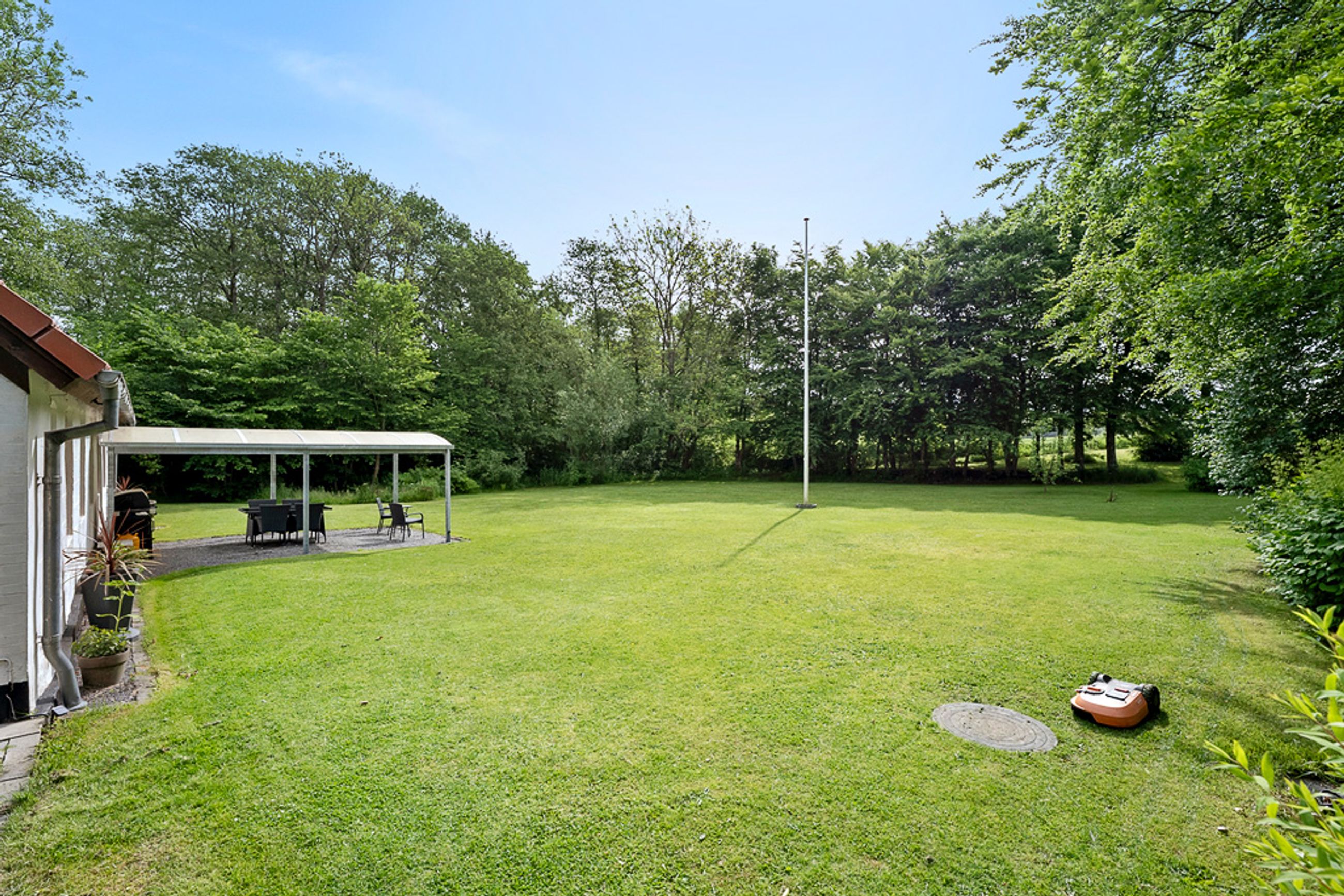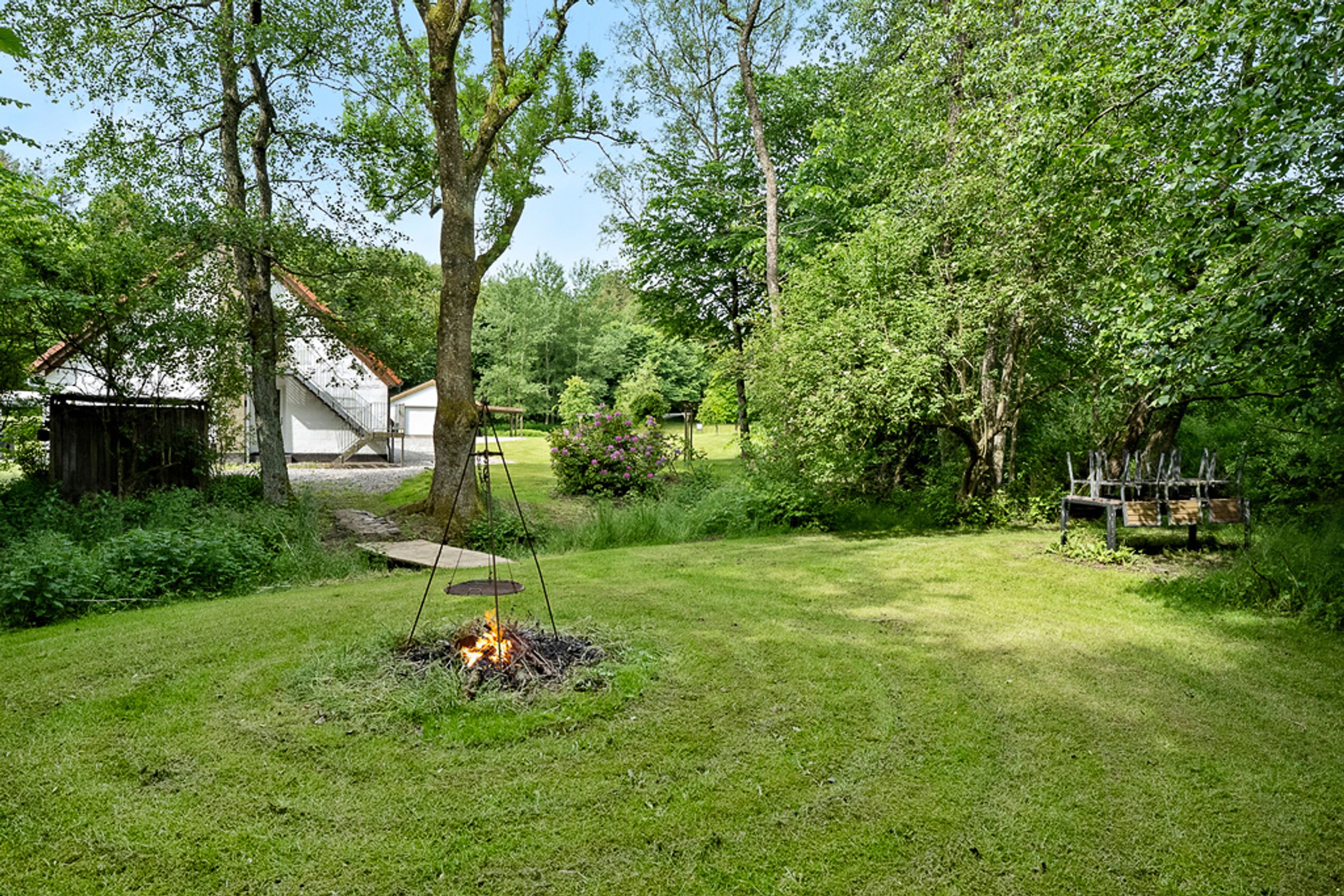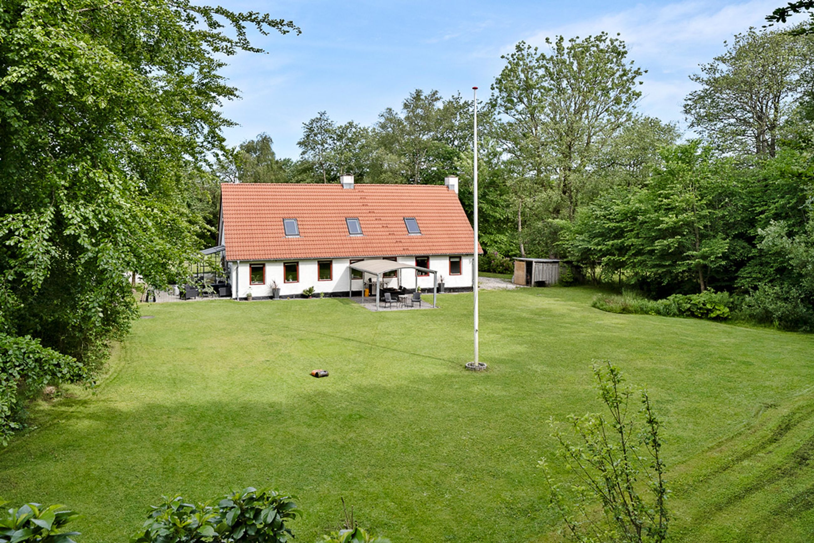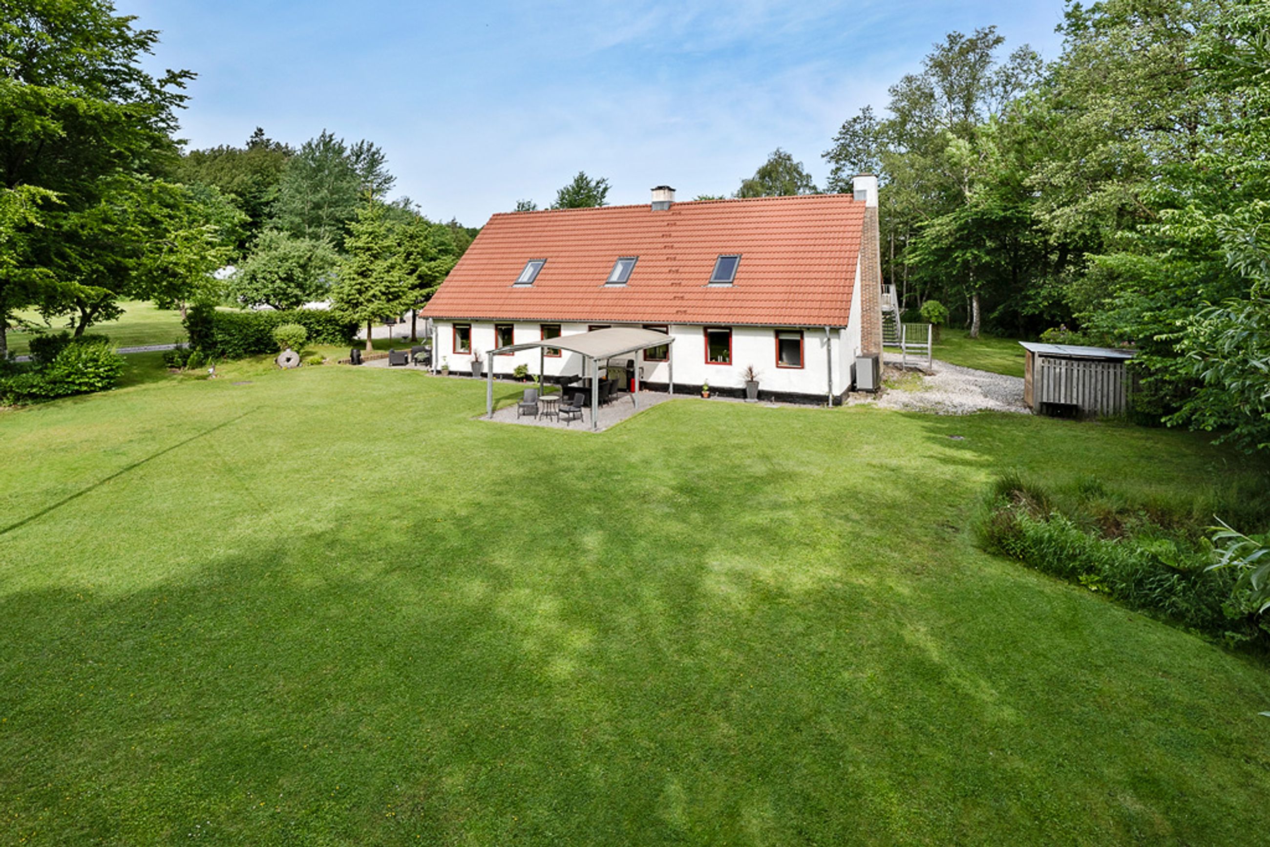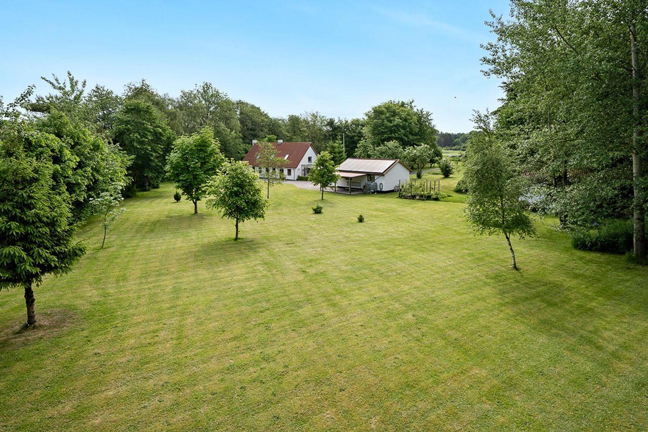 Ejendommen er smukt placeret på en over 8.000 m2 stor grund med den naturskønne Skravad Bæk løbende gennem haven – det skaber en helt særlig stemning, som både giver ro og fornemmelsen af at være tæt på naturen. Her er rig mulighed for at skabe en frodig have, holde dyr eller bare nyde den åbne himmel og fuglenes sang. Med energimærke A og moderne opvarmning via luft-til-vand varmepumpe er boligen også både økonomisk og komfortabel at bo i.