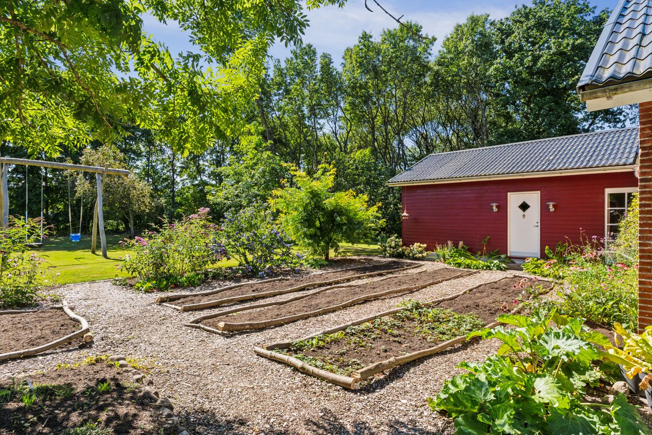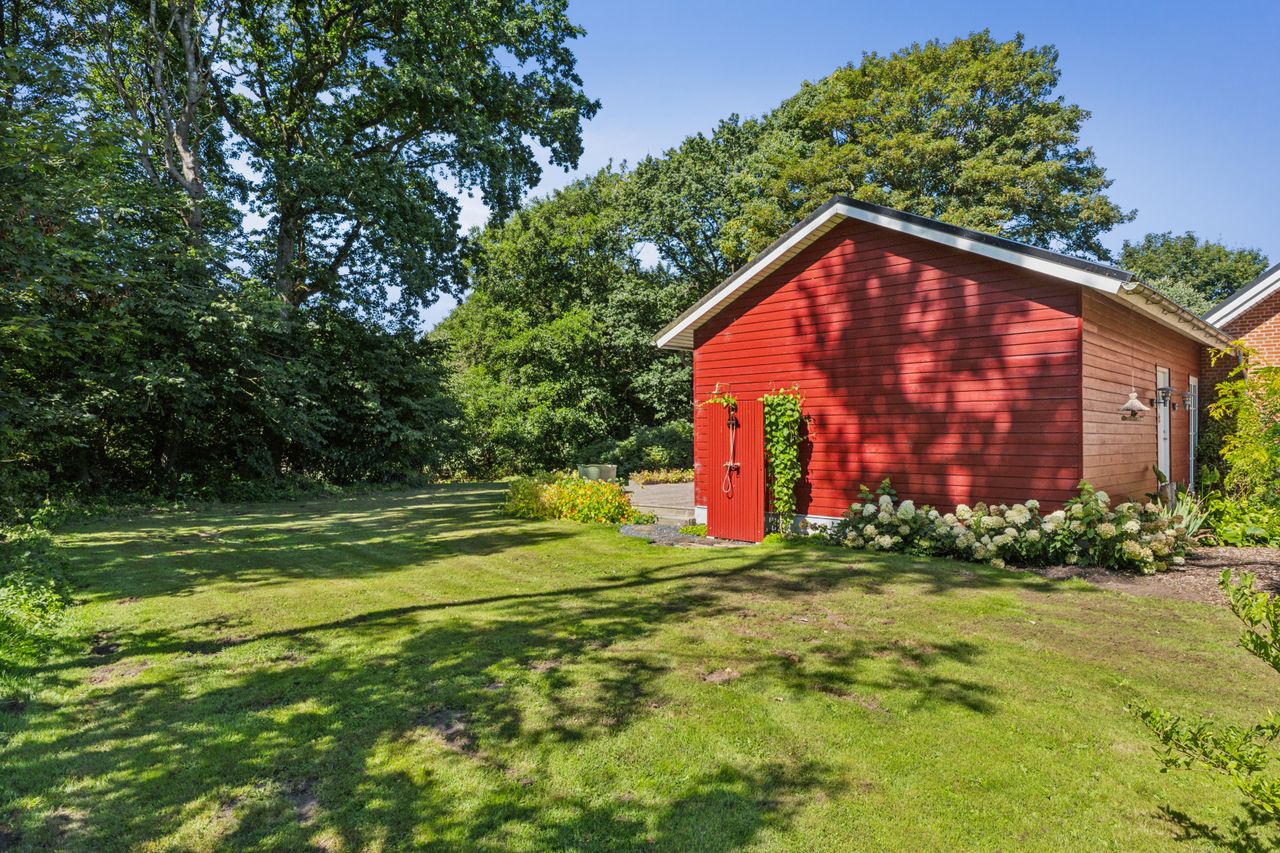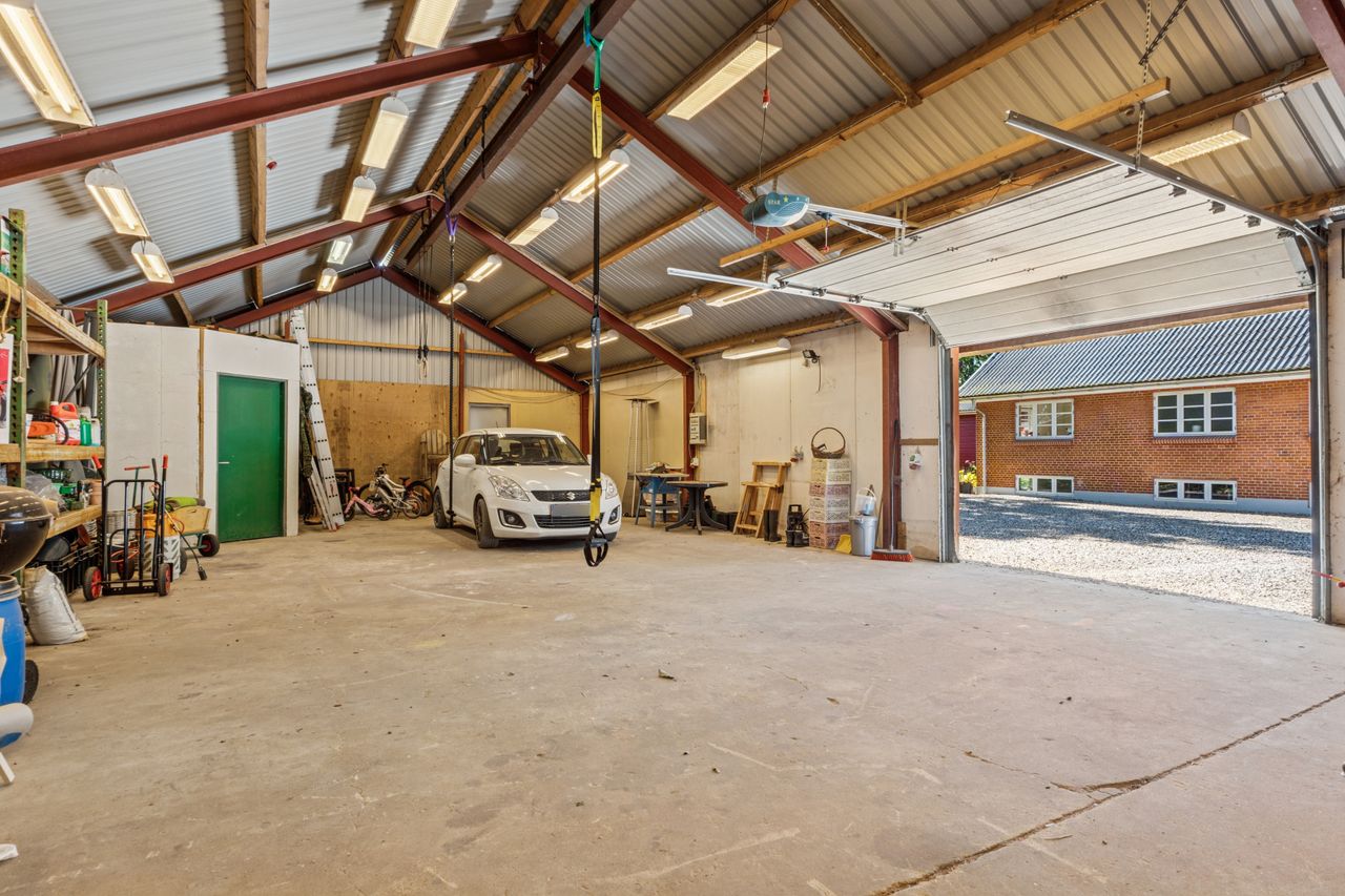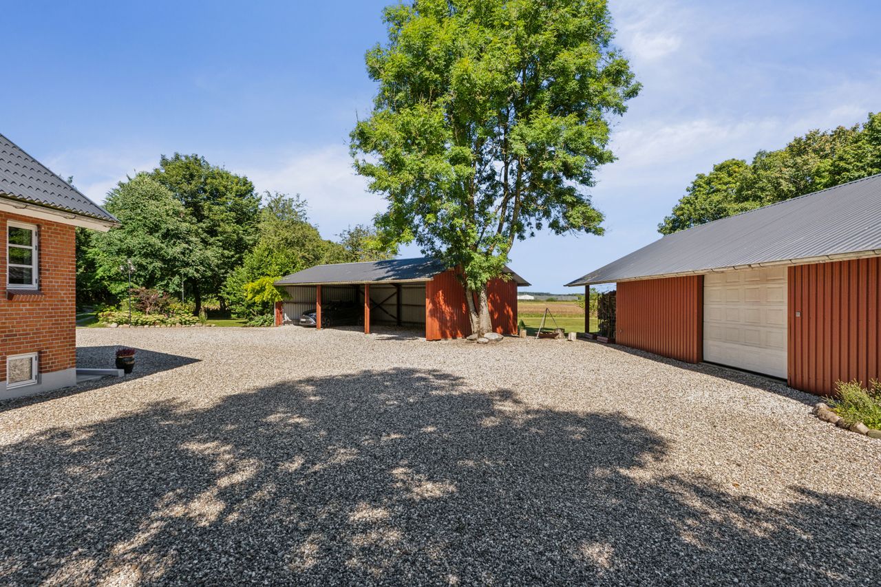 Ejendommen rummer solide og anvendelige udbygninger, der åbner op for mange muligheder – uanset om det er til hobby, opbevaring eller mindre erhverv. Hertil kommer en rummelig tredobbelt carport, hvor både biler, trailer og maskiner kan stå godt beskyttet.