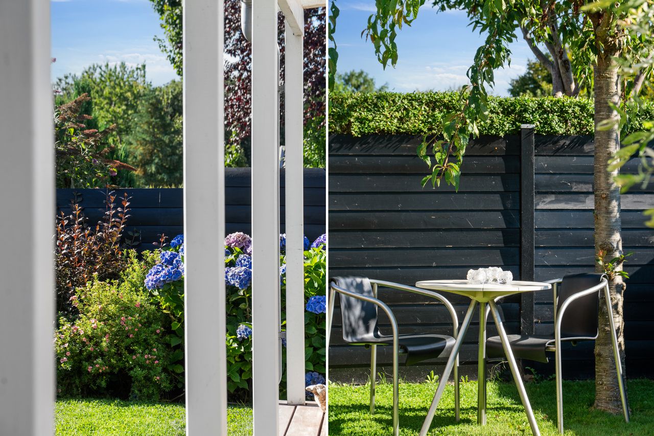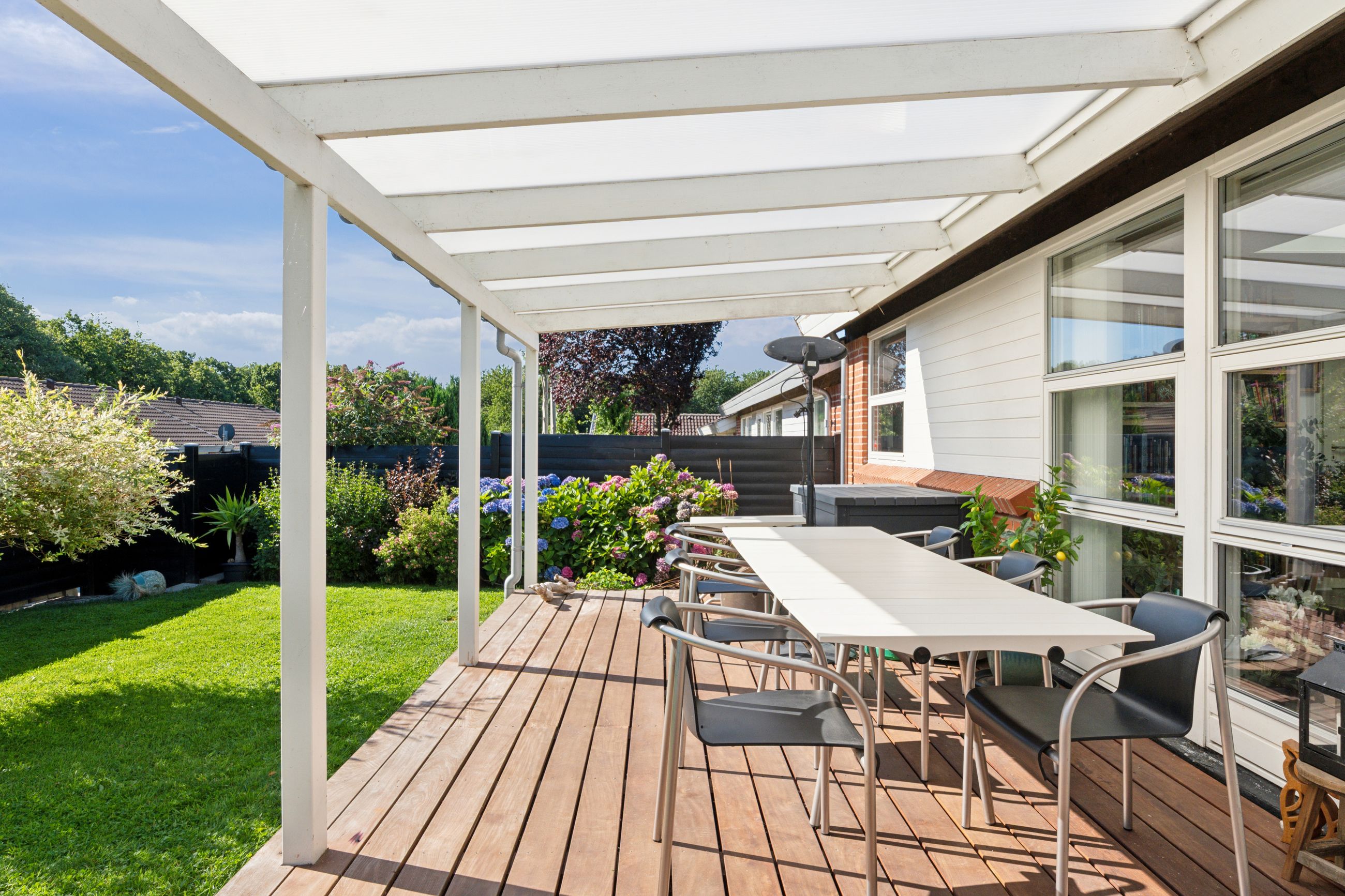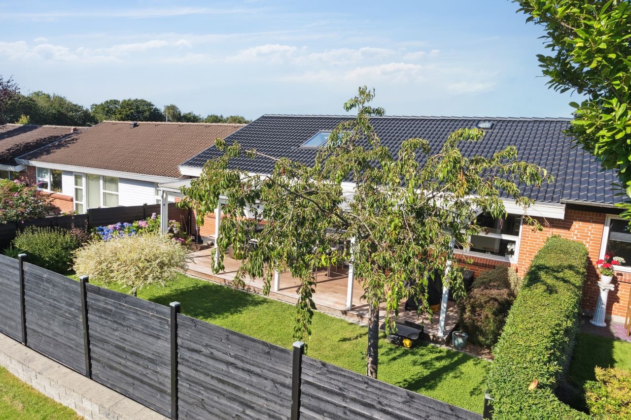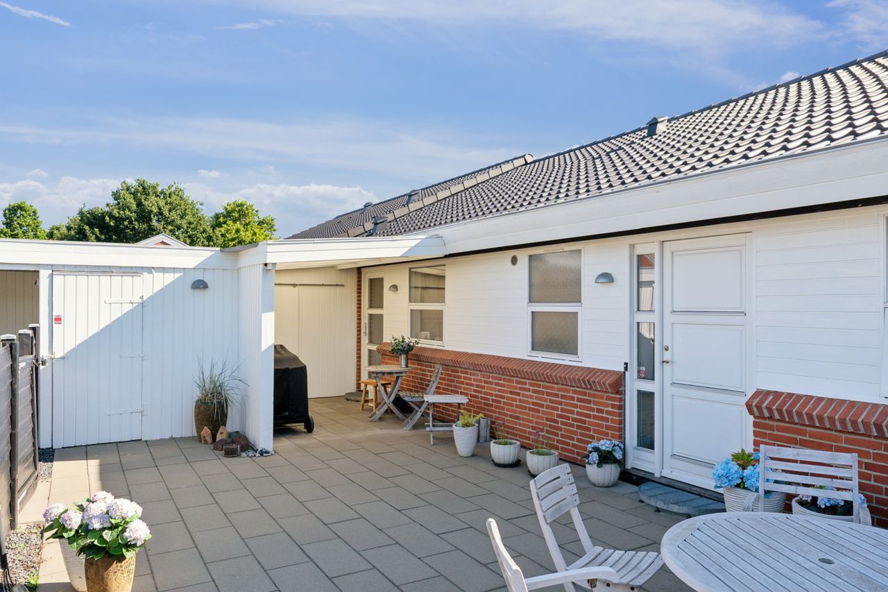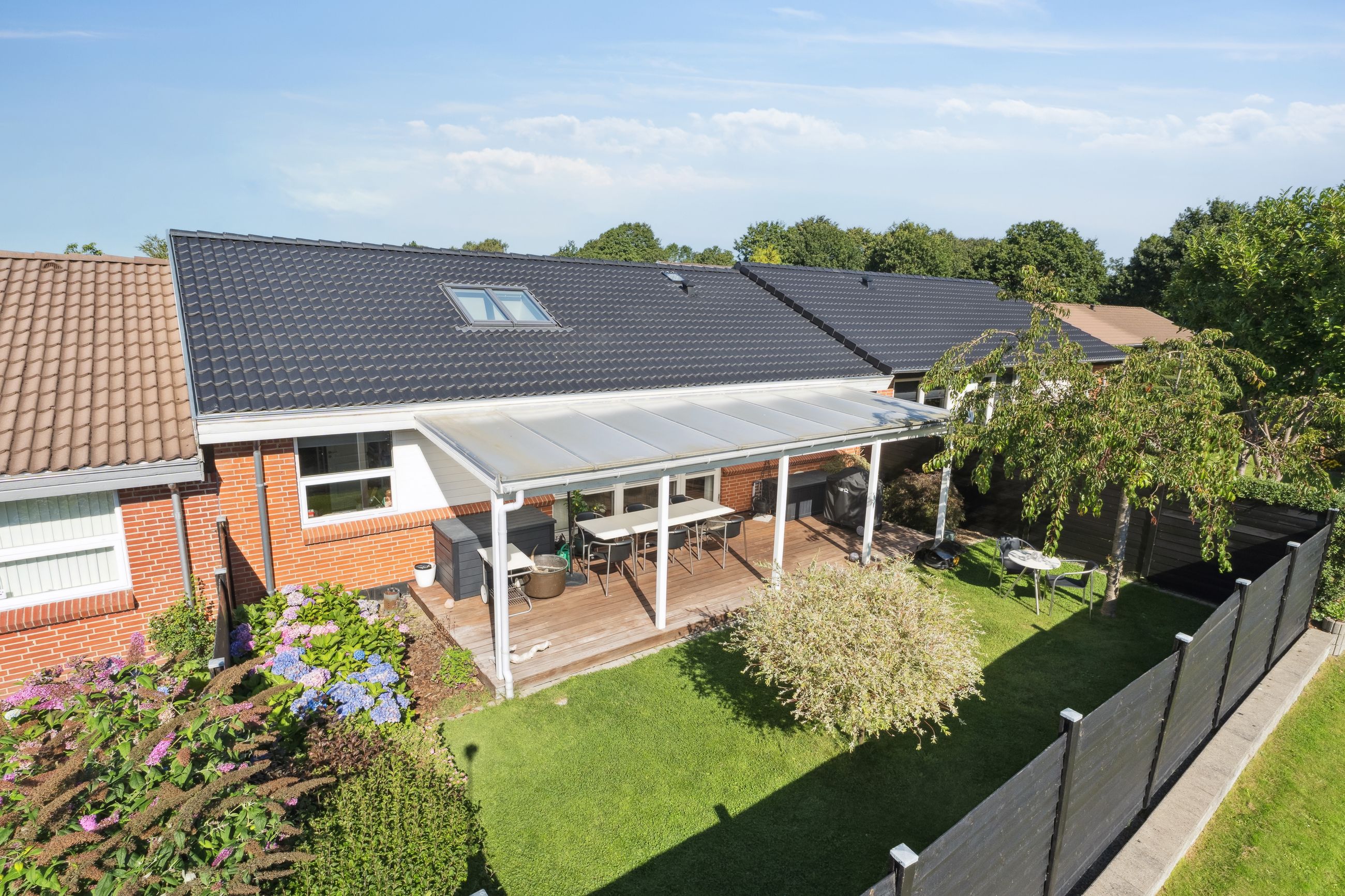 Udenfor finder du en skøn, overdækket terrasse – perfekt til morgenkaffe eller middag i skyggen. Haven er nem at holde med en lille græsplæne, og når solen skinner, er der sol på grunden hele dagen – så der er rig mulighed for at nyde udelivet i fulde drag. Til boligen hører også en carport, og der er gode muligheder for gæsteparkering lige ved huset på den fællesparkering.