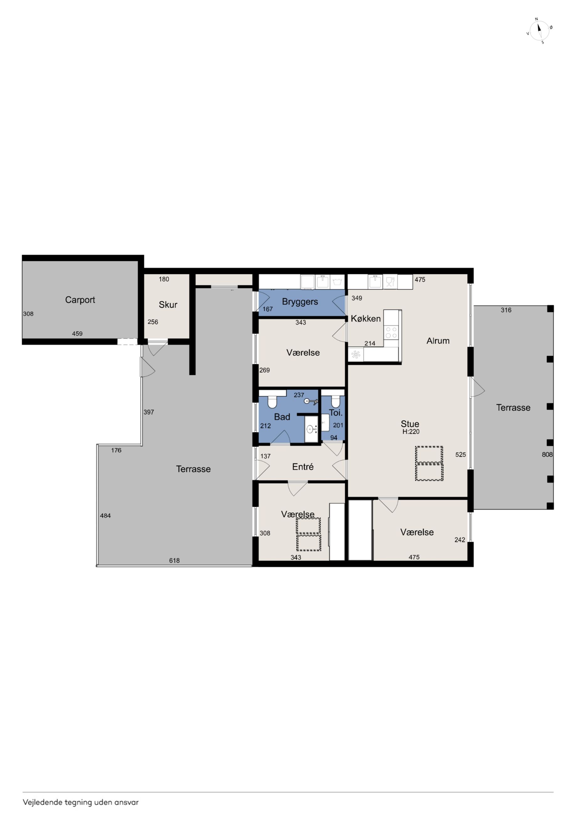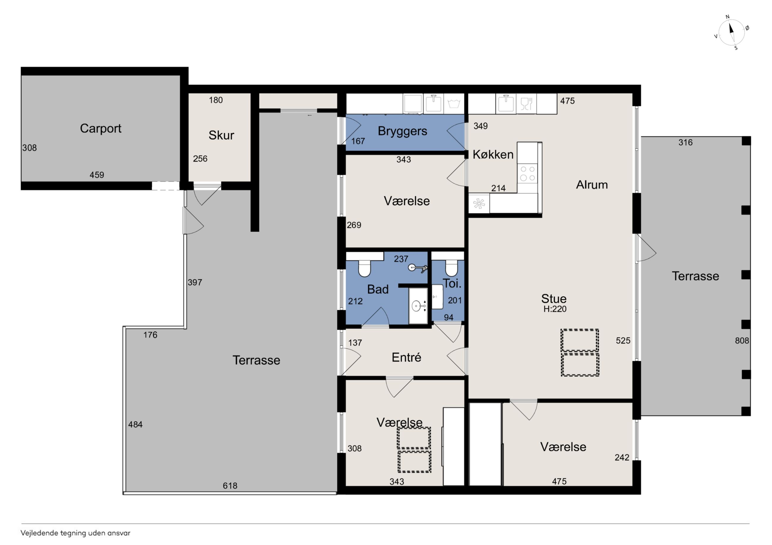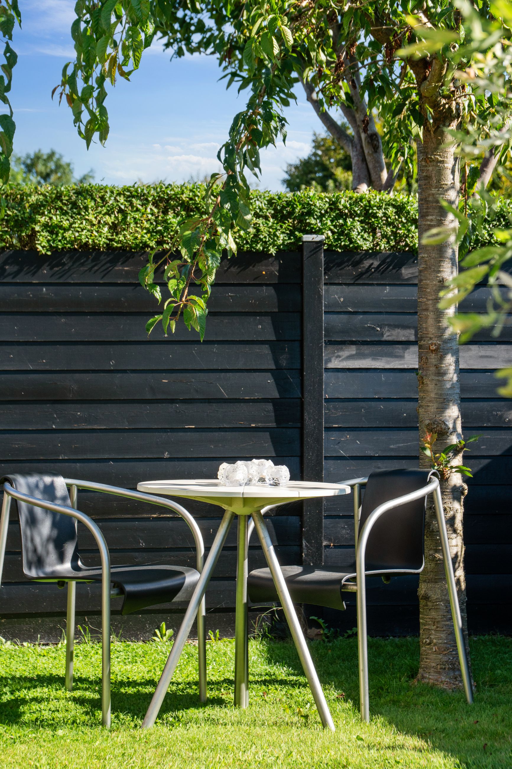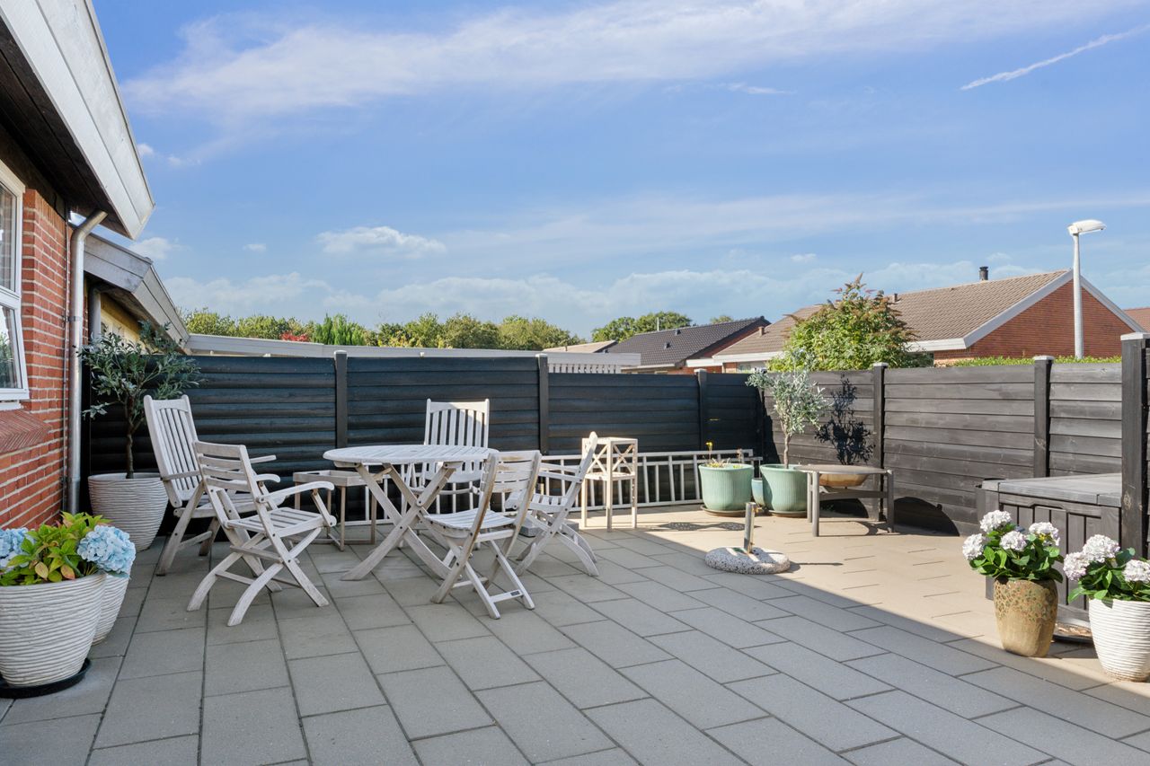 Udenfor finder du en skøn, overdækket terrasse – perfekt til morgenkaffe eller middag i skyggen. Haven er nem at holde med en lille græsplæne, og når solen skinner, er der sol på grunden hele dagen – så der er rig mulighed for at nyde udelivet i fulde drag. Til boligen hører også en carport, og der er gode muligheder for gæsteparkering lige ved huset på den fællesparkering.