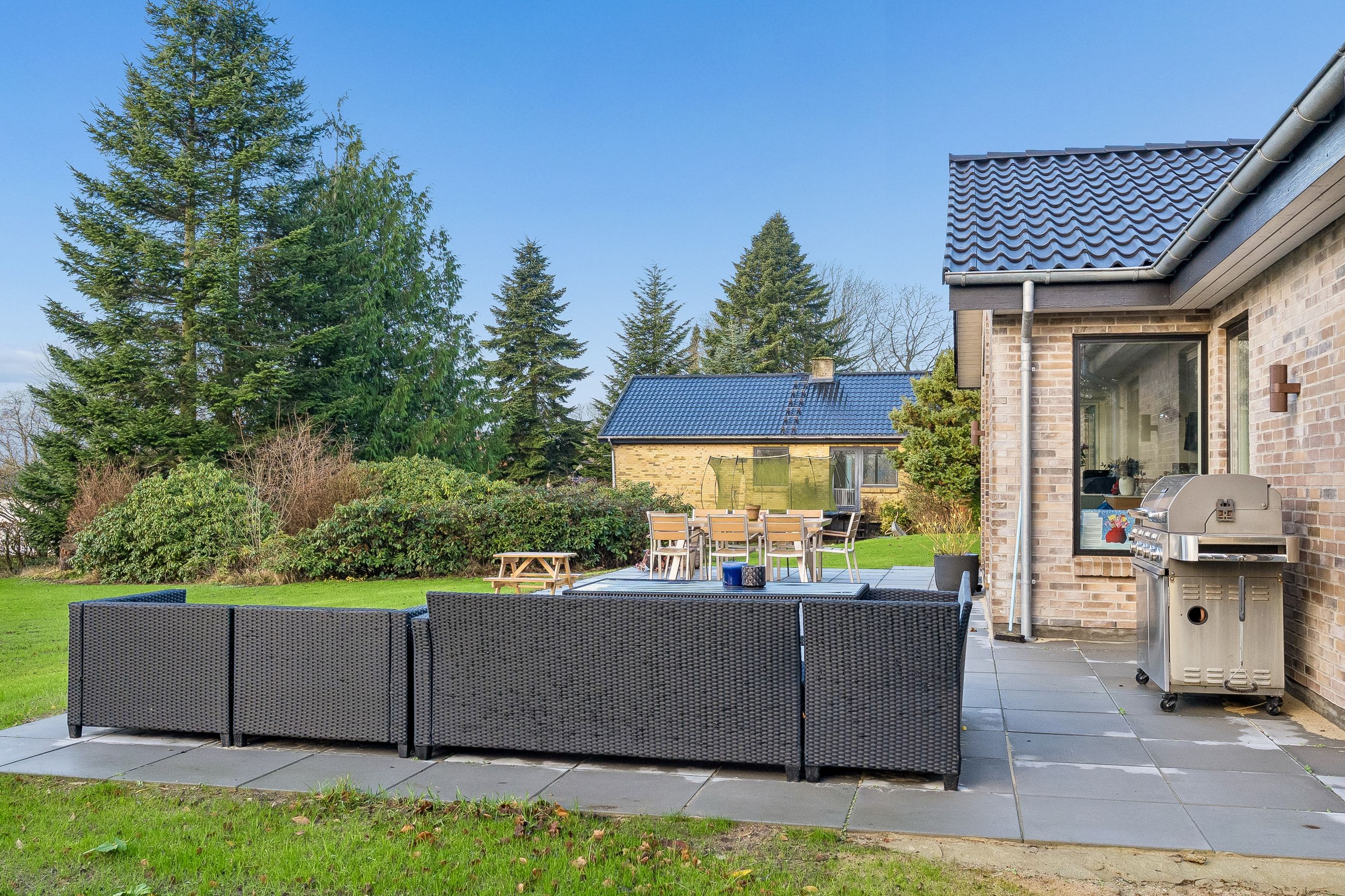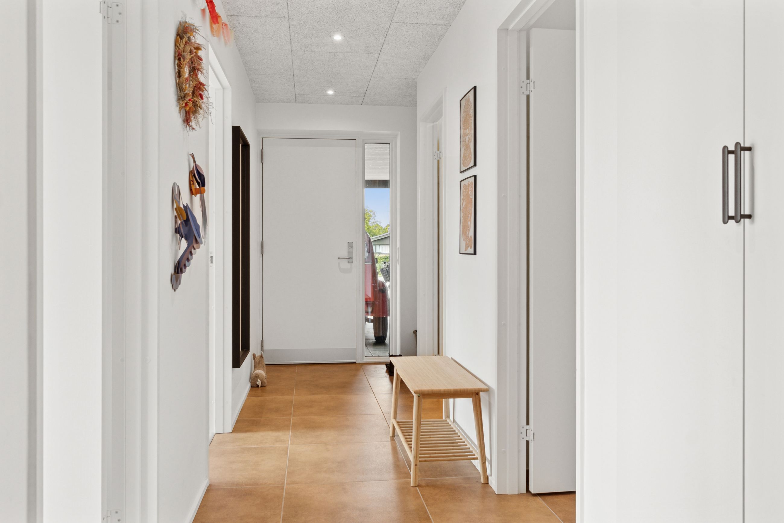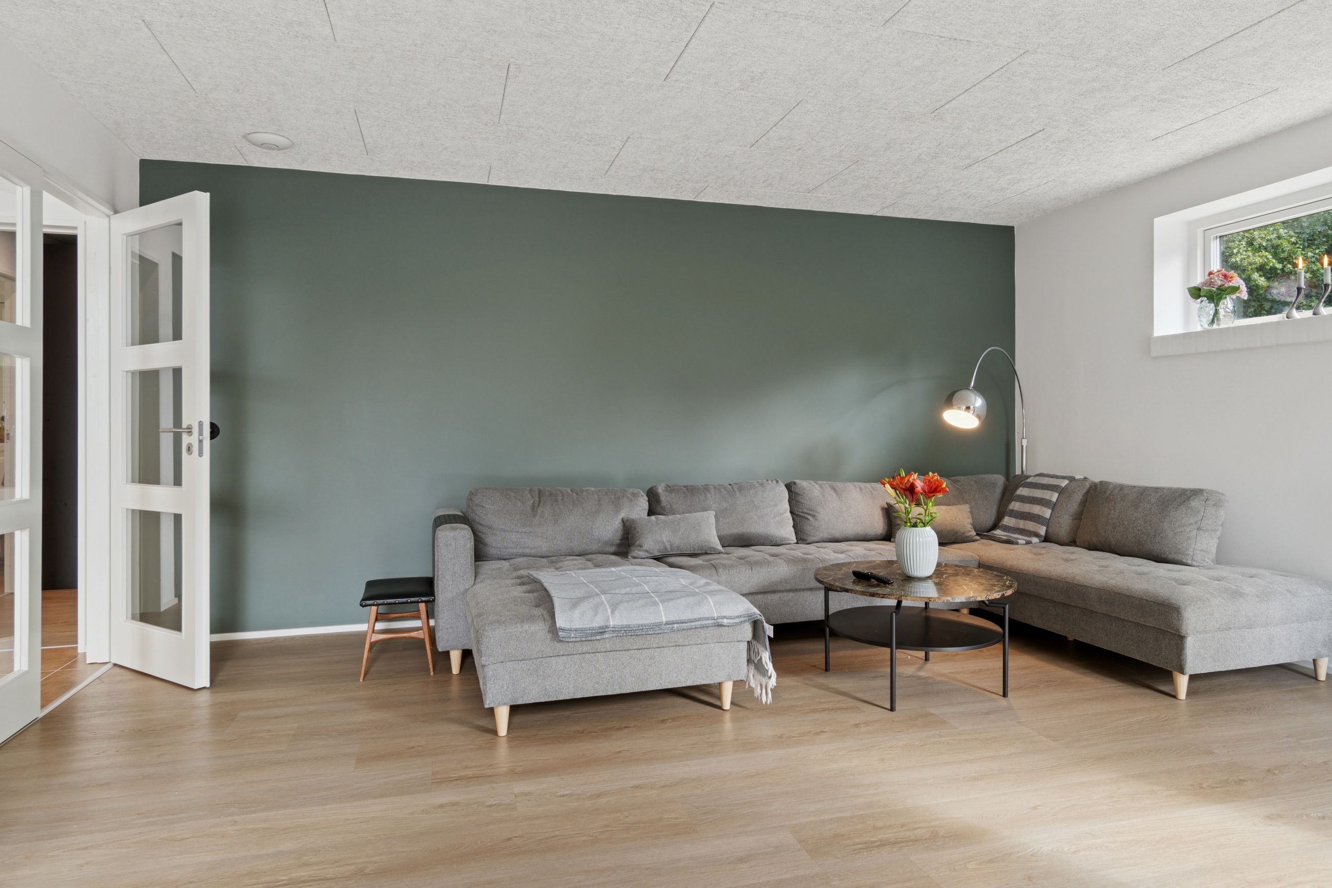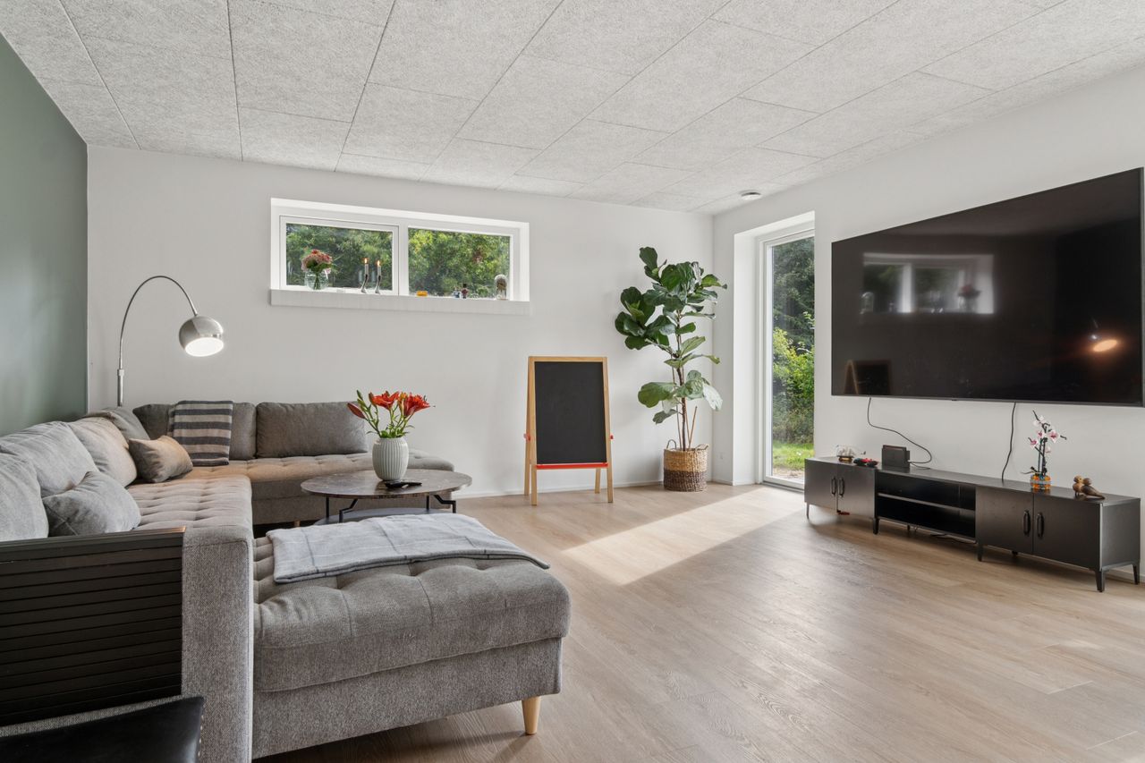 I forlængelse af alrummet finder du en hyggelig stue med direkte udgang til terrasse. Den udendørs tilknytning gør det let at flytte den sociale aktivitet udenfor – perfekt til sommeraftener, grill og udendørs måltider. Stuen har store vinduer, der giver et gennemgående og venligt lysindfald og skaber en følelse af rummelighed.
