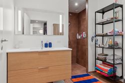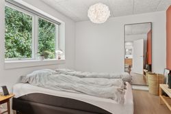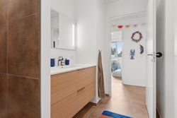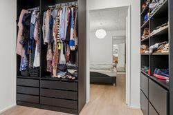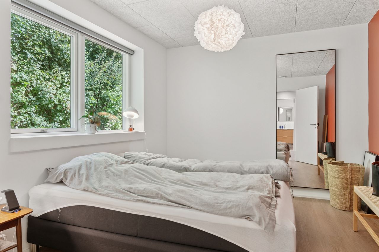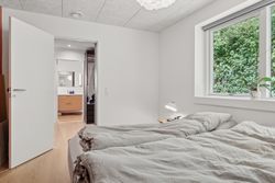 Soveværelse walk-in-closet og eget badeværelse, hvilket giver ekstra privatliv og bekvemmelighed. Det stilfulde badeværelse tilknyttet soveværelset er udstyret med moderne sanitærudstyr, rummelig bruseniche og kvalitetsmaterialer, der bidrager til en kølig og behagelig atmosfære. Walk-in muliggør en velorganiseret garderobe samt en stille og privat soveafdeling.