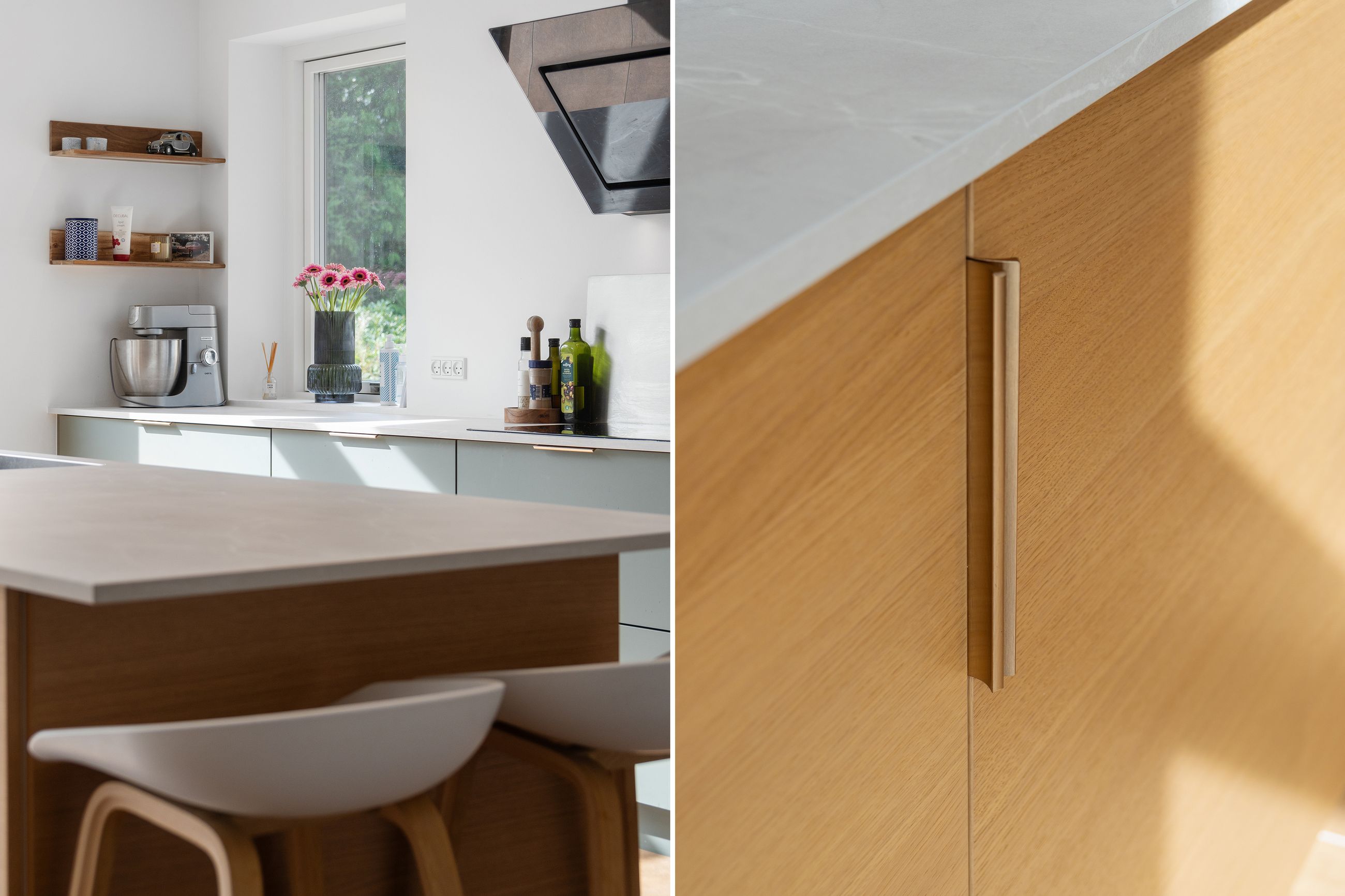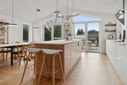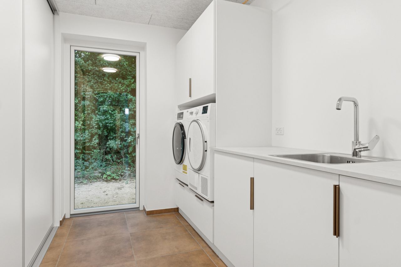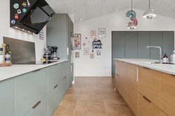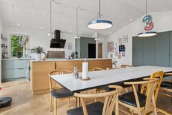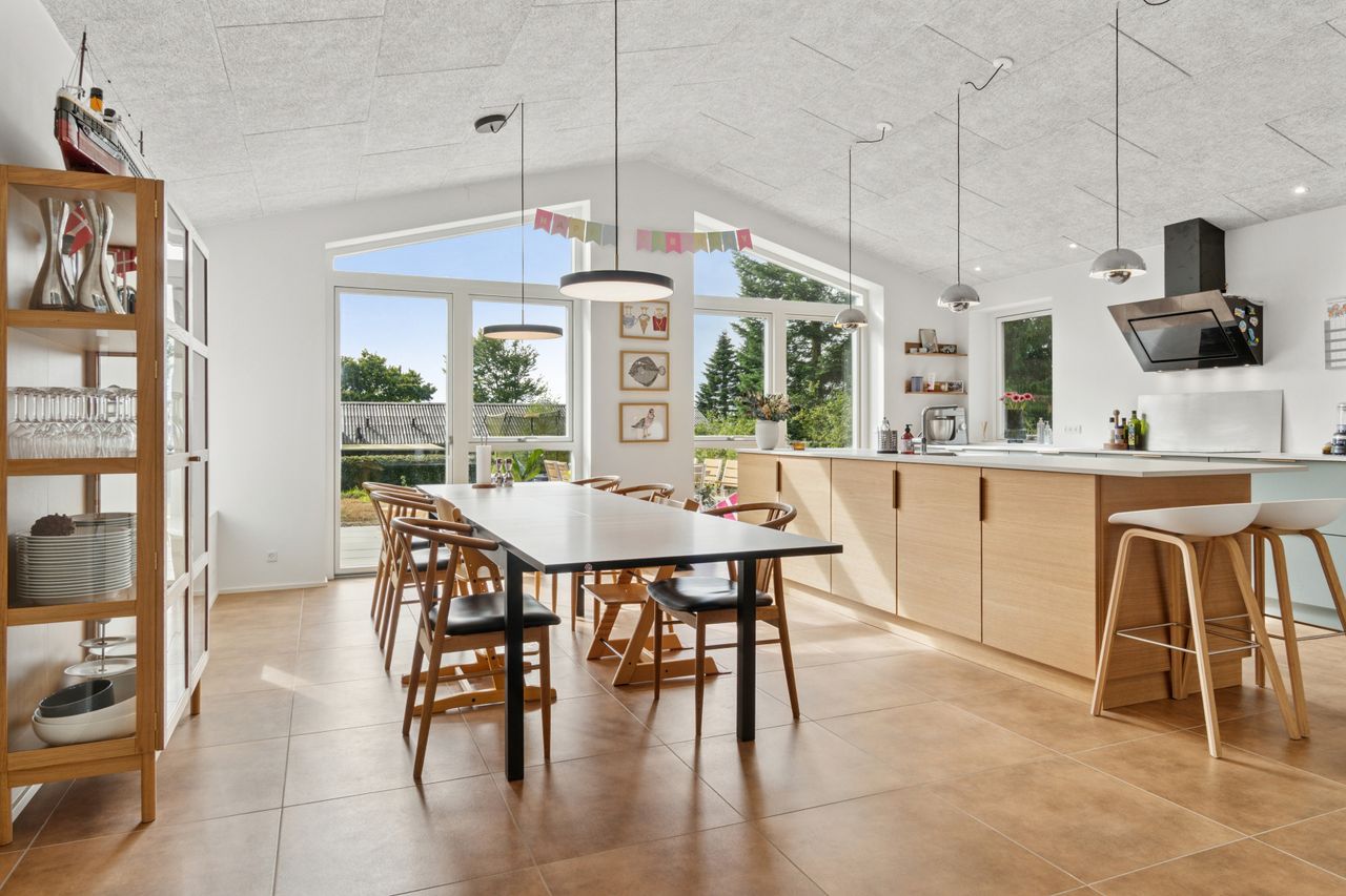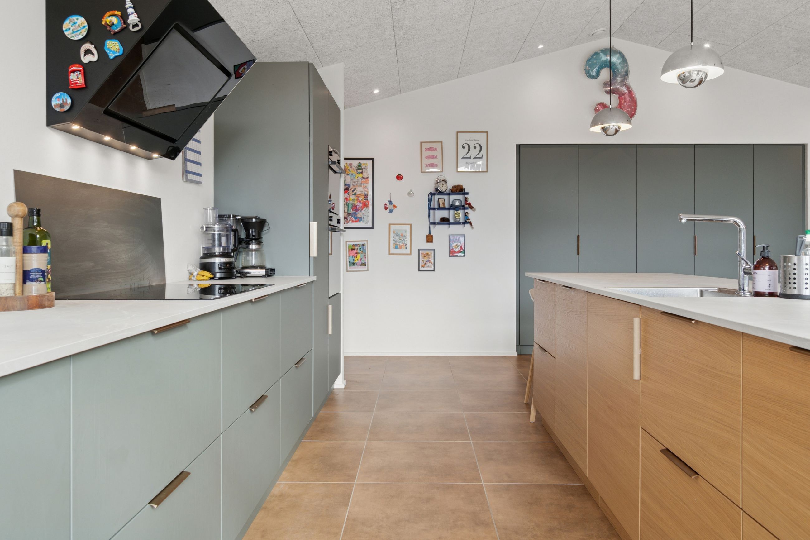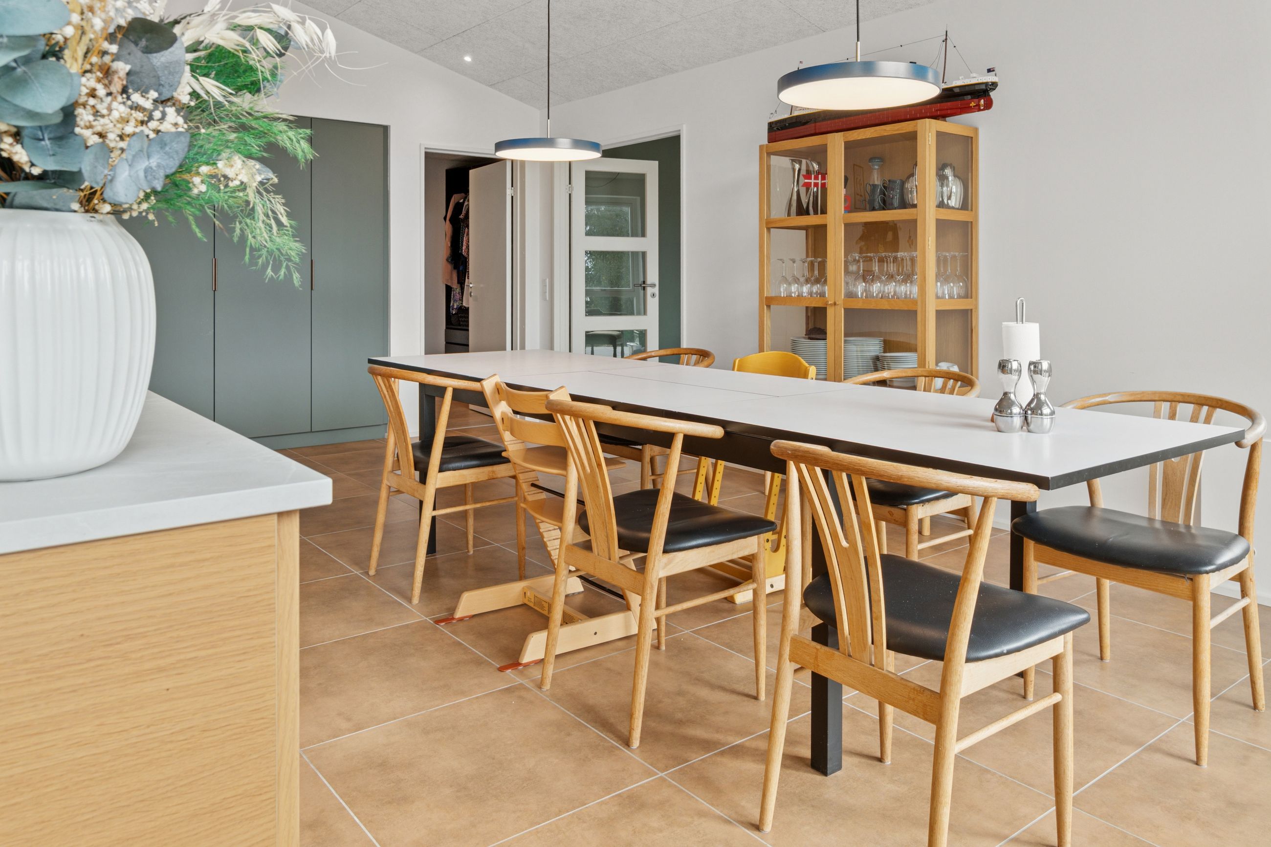 Køkken-alrummet står som husets hjerte: rummeligt, med god ventilation og masser af dagslys fra store vinduer. Køkkenet har stilrene, mørke fronter og indbygget kvalitetsudstyr, hvilket gør madlavning og sociale stunder til en fornøjelse. En stor praktisk køkken-ø fungerer som arbejdsområde og hyggelig samlingsplads til snak, børnenes lektier og lette måltider. Alrummet er perfekt til både hverdagsluncher og større sammenkomster.