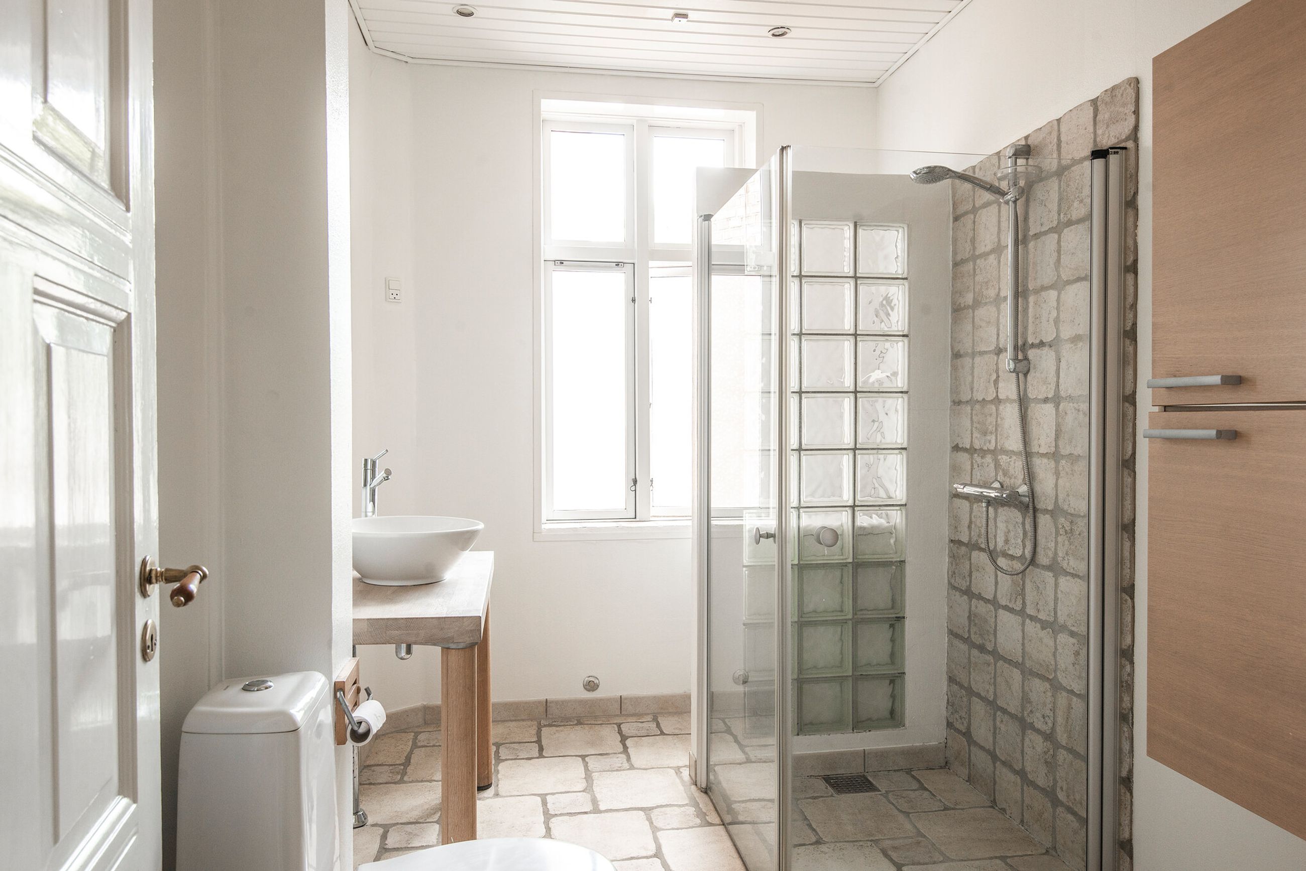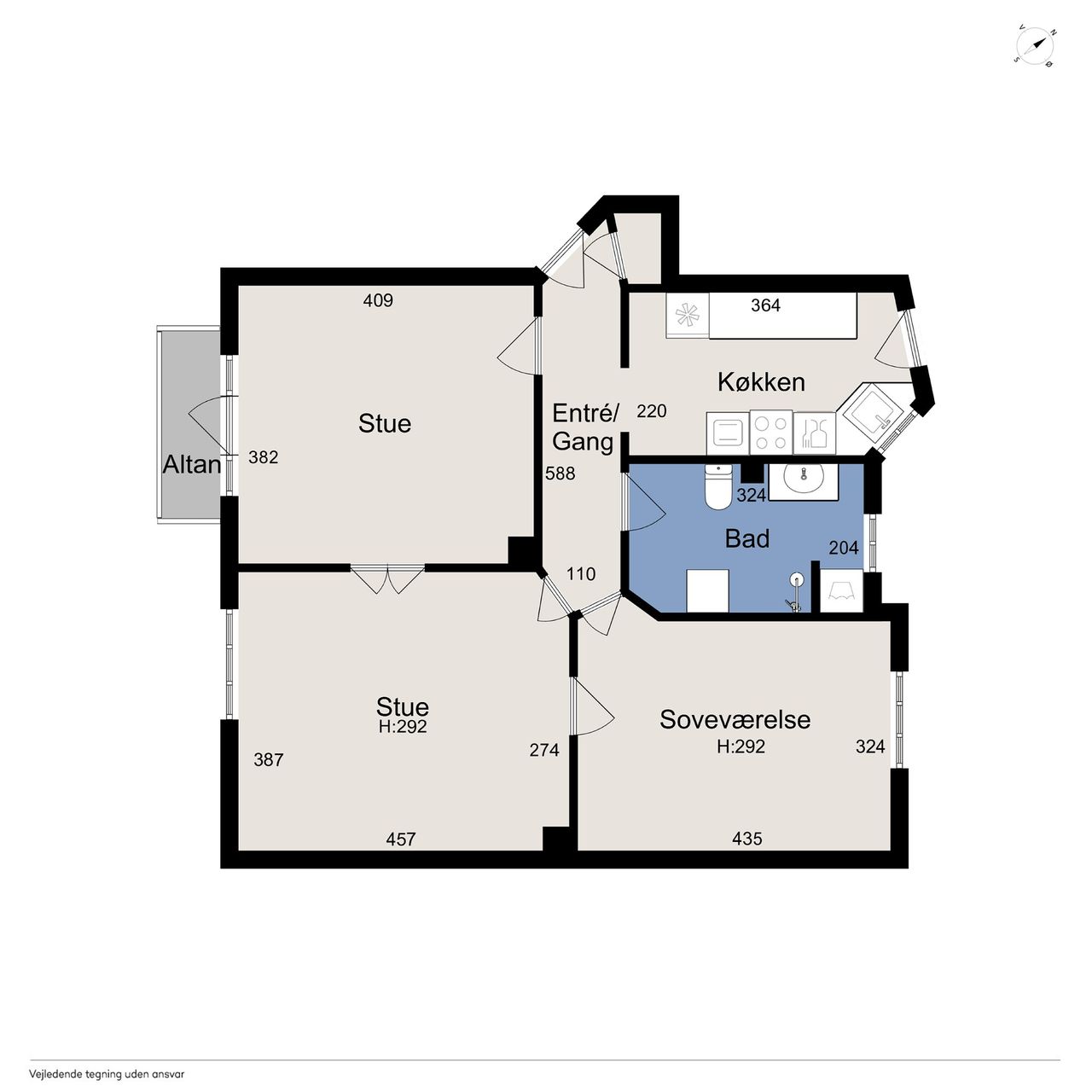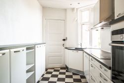 Boligen rummer derudover et godt soveværelse, et selvstændigt køkken samt et badeværelse med toilet. Planløsningen er klassisk og velfungerende, og lejligheden fremstår i pæn og velholdt stand, hvor den oprindelige stil er bevaret med respekt for ejendommens historie.