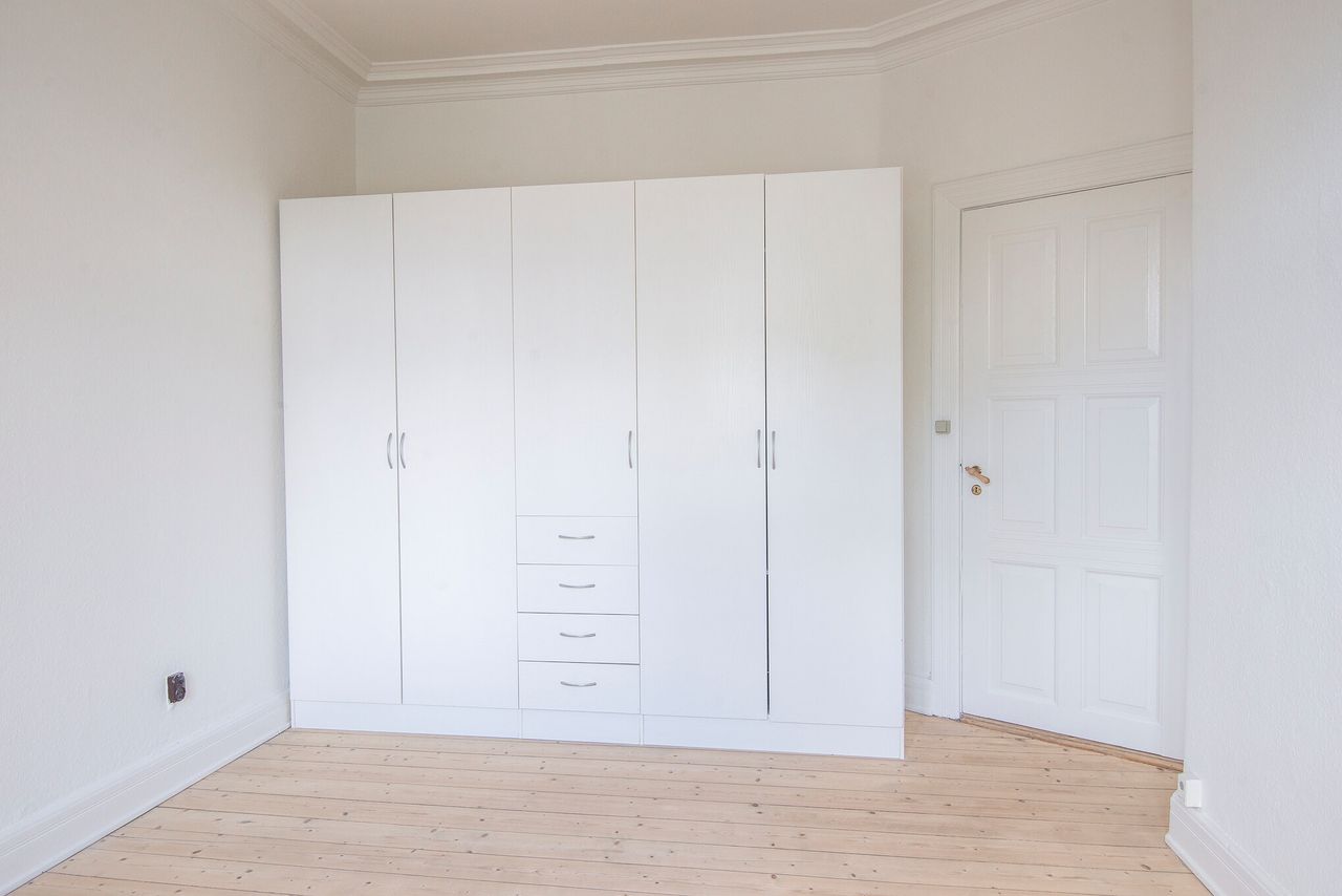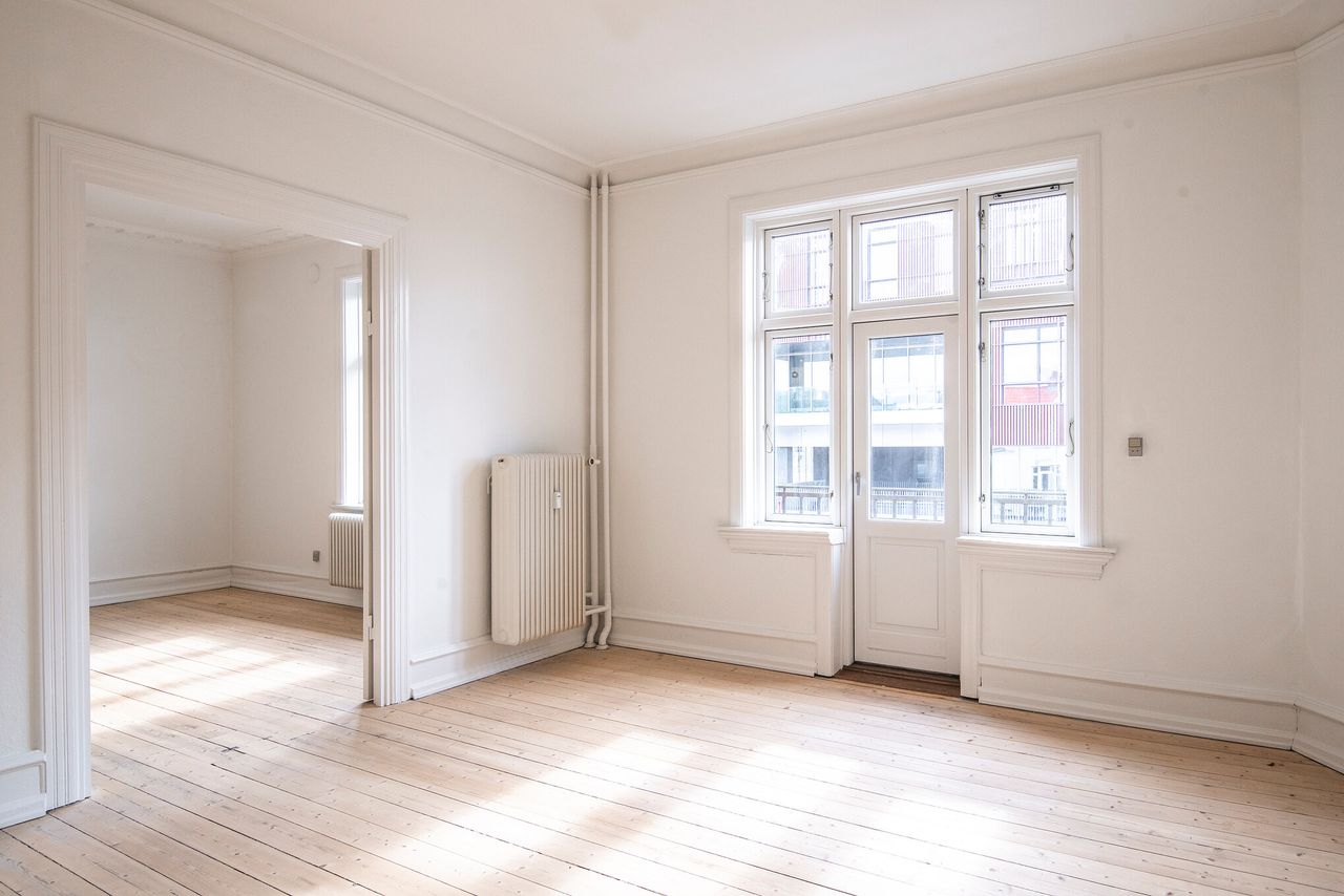 Lejligheden er en stor og indbydende 3-værelses, der emmer af herskabelig stemning. Her bydes du velkommen af højt til loftet, smukke stukdetaljer og to elegante stuer en suite, som giver et fantastisk lysindfald og skaber ideelle rammer for både ophold, spisestue og gæstebesøg.