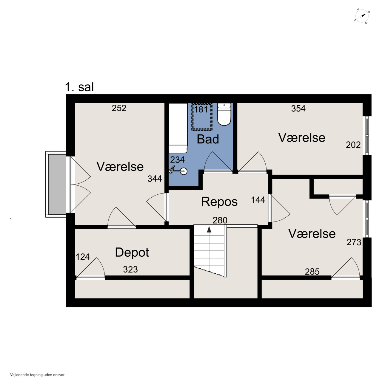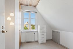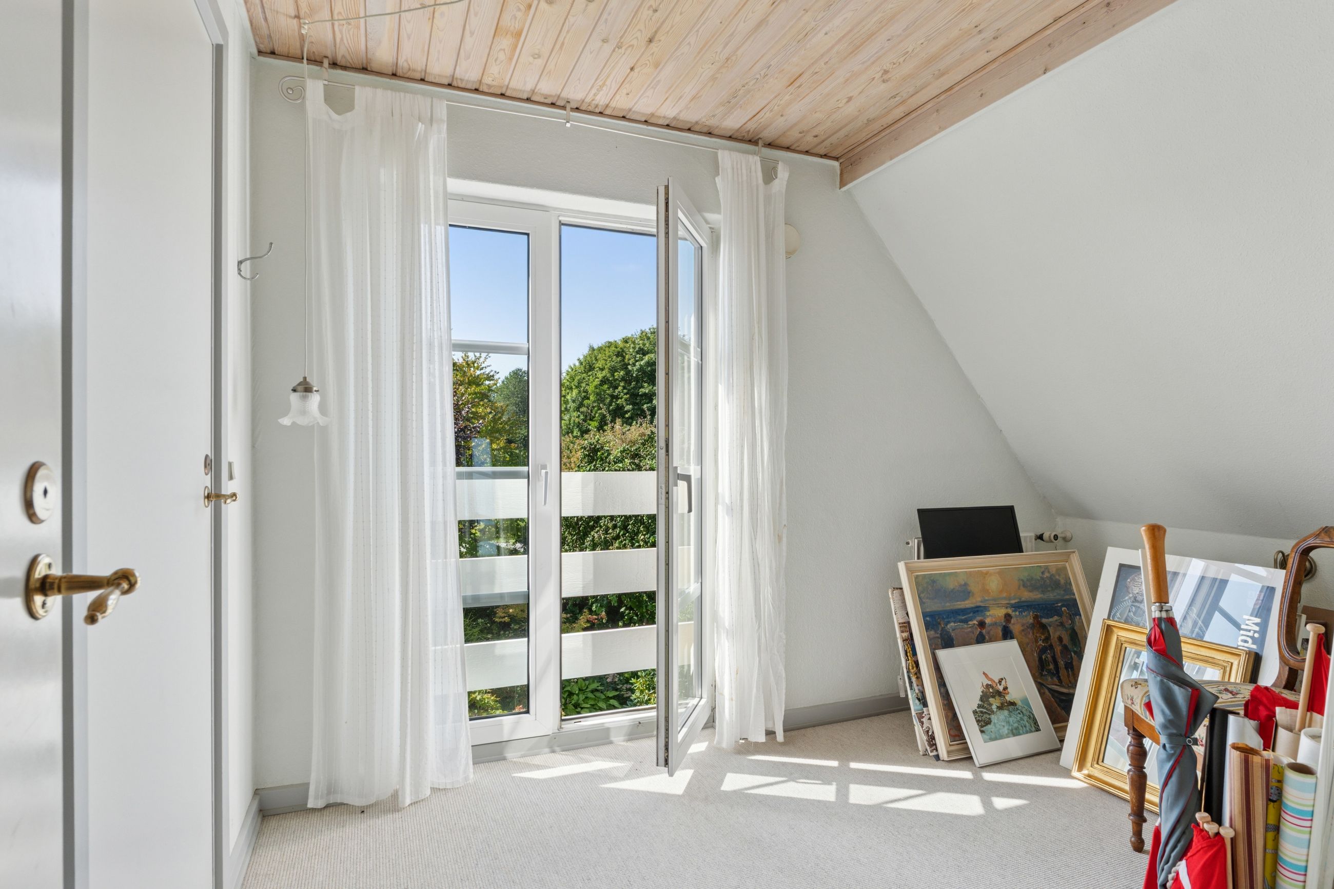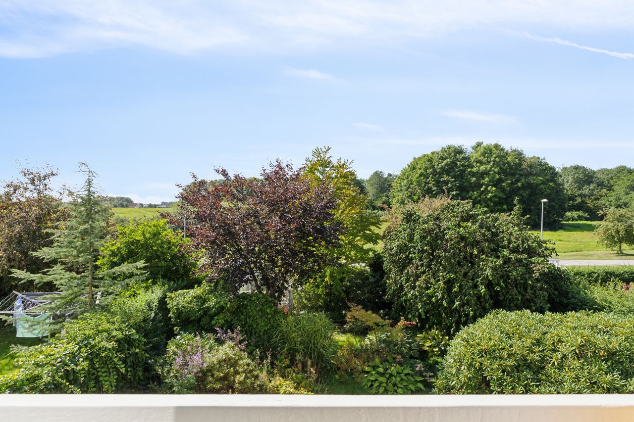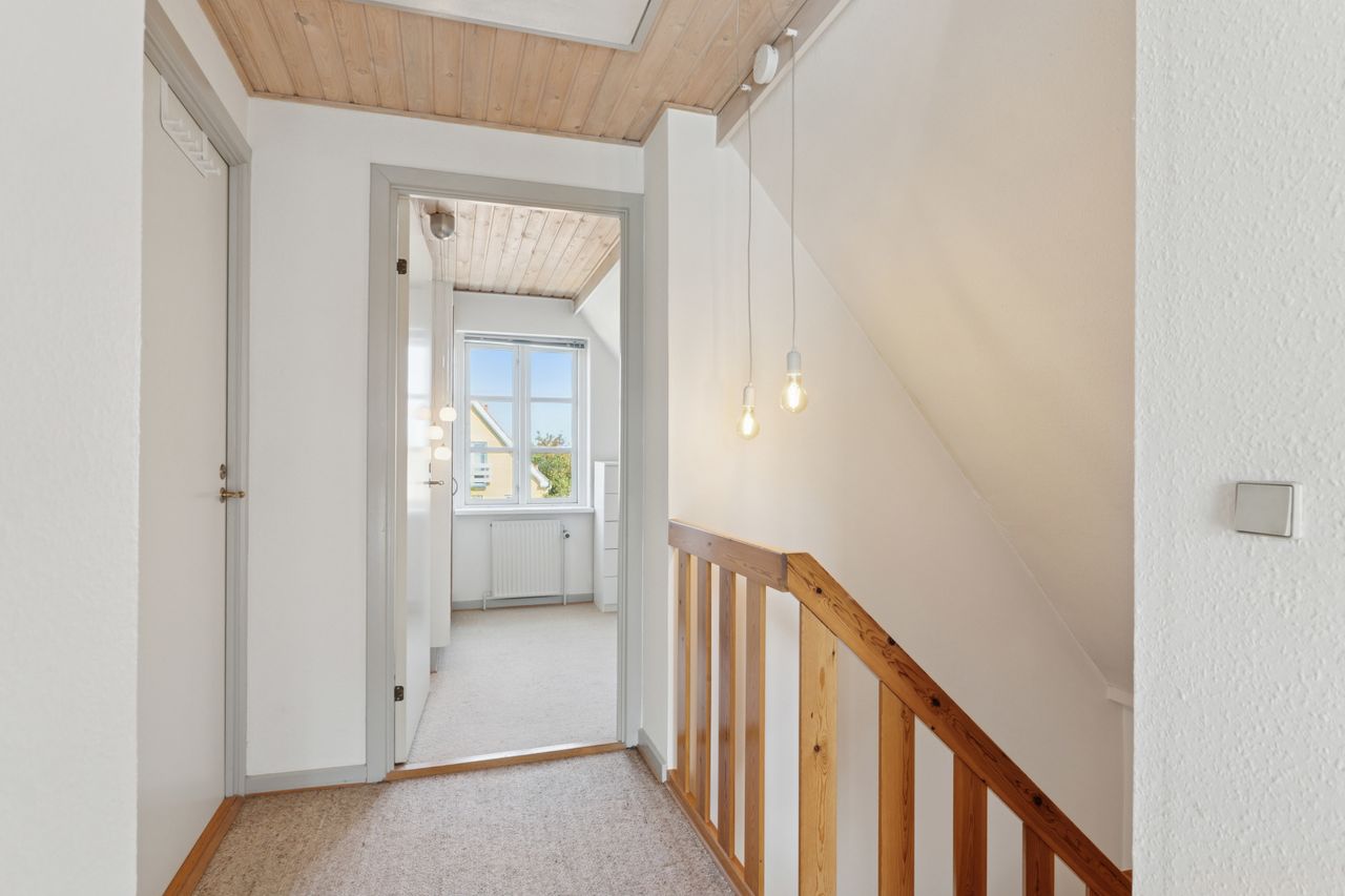 Første sal nås via en halvsvingstrappe til repos. Her finder du et badeværelse med brus samt tre gode værelser – det ene med fransk altan og udsigt til smukt grønt areal.