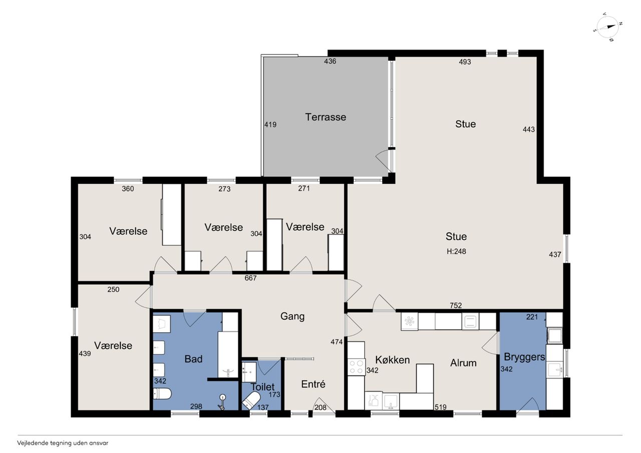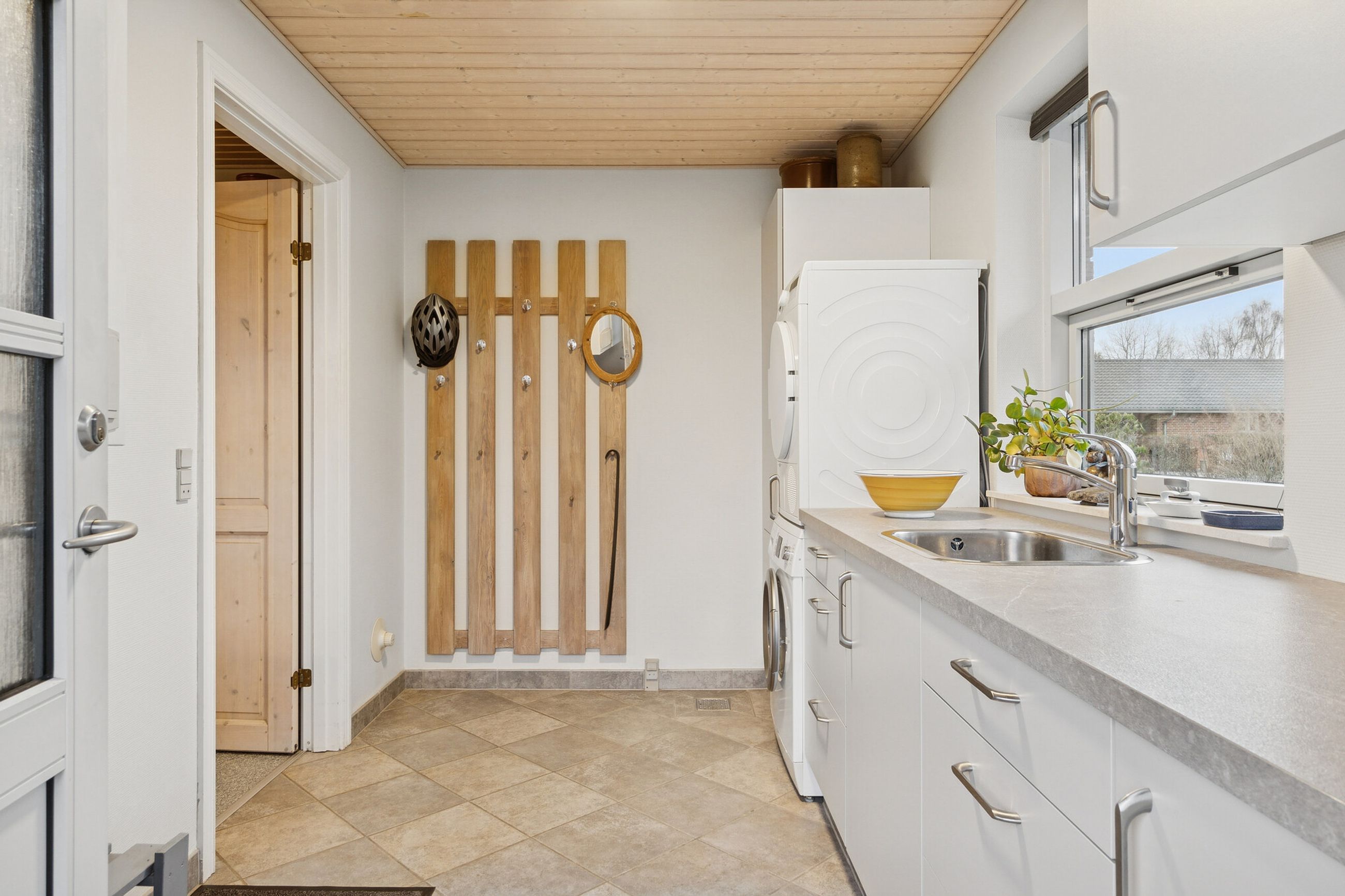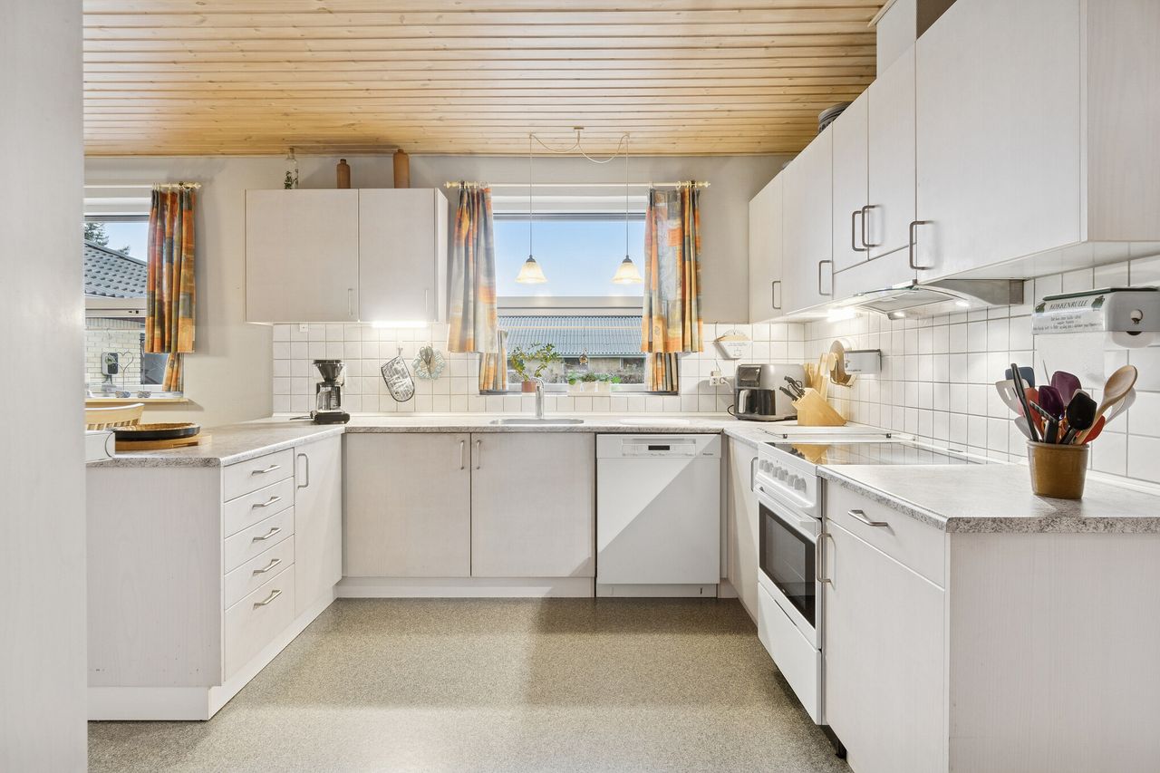 Boligens 170 m2 rummer alt, hvad den moderne familie har brug for: Et lyst og indbydende køkken med god spiseplads, en stor opholdsstue med direkte udgang til en delvist overdækket terrasse, hvor der er plads til både afslapning og hyggelige sommeraftener. Fra fordelergangen er der adgang til hele fire rummelige værelser, et badeværelse med både brus og badekar, et separat gæstetoilet samt en rummelig entré. Desuden byder boligen på et praktisk bryggers/baggang med gulvvarme – ligesom der er gulvvarme i entre, gang, toilet og badeværelse.