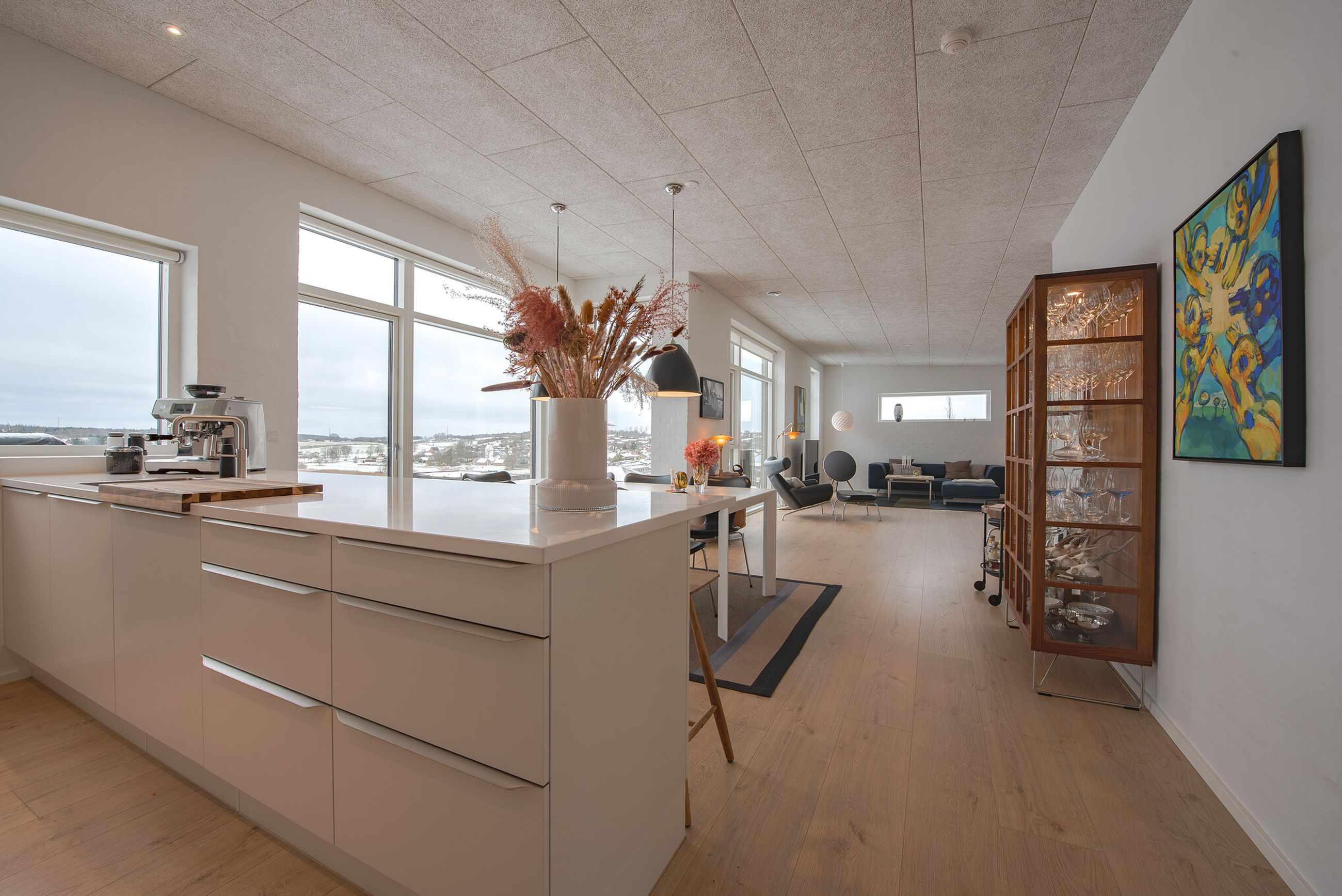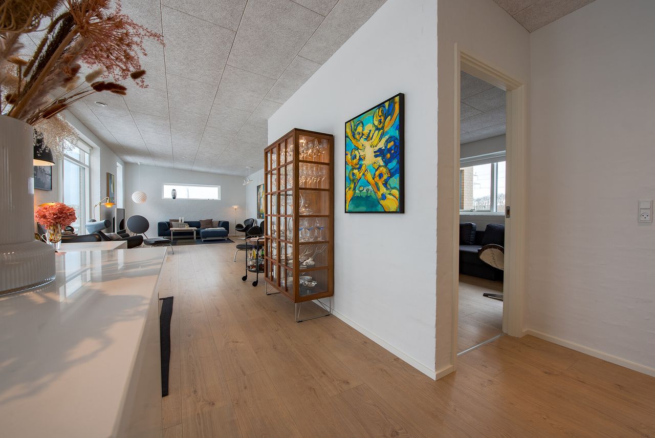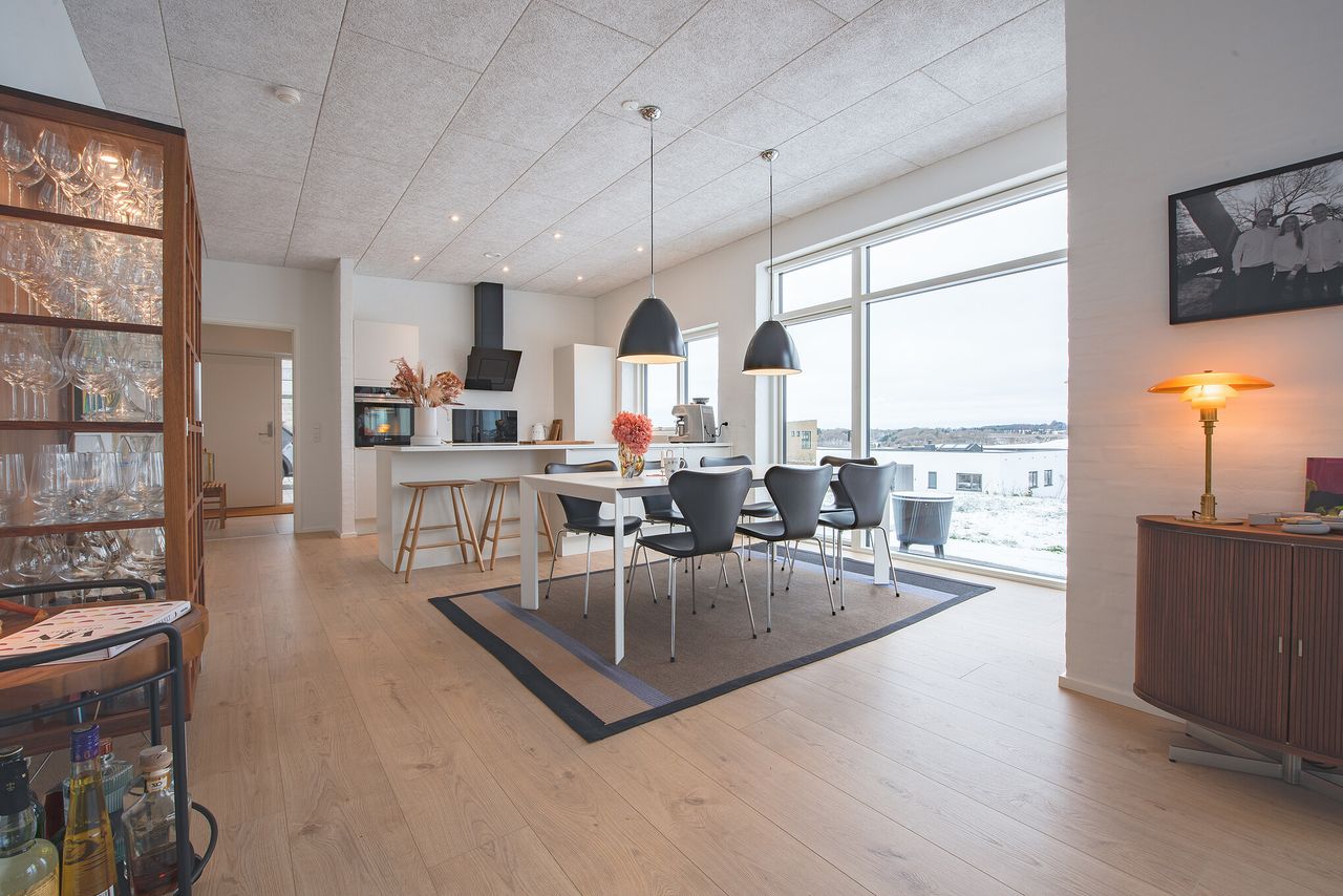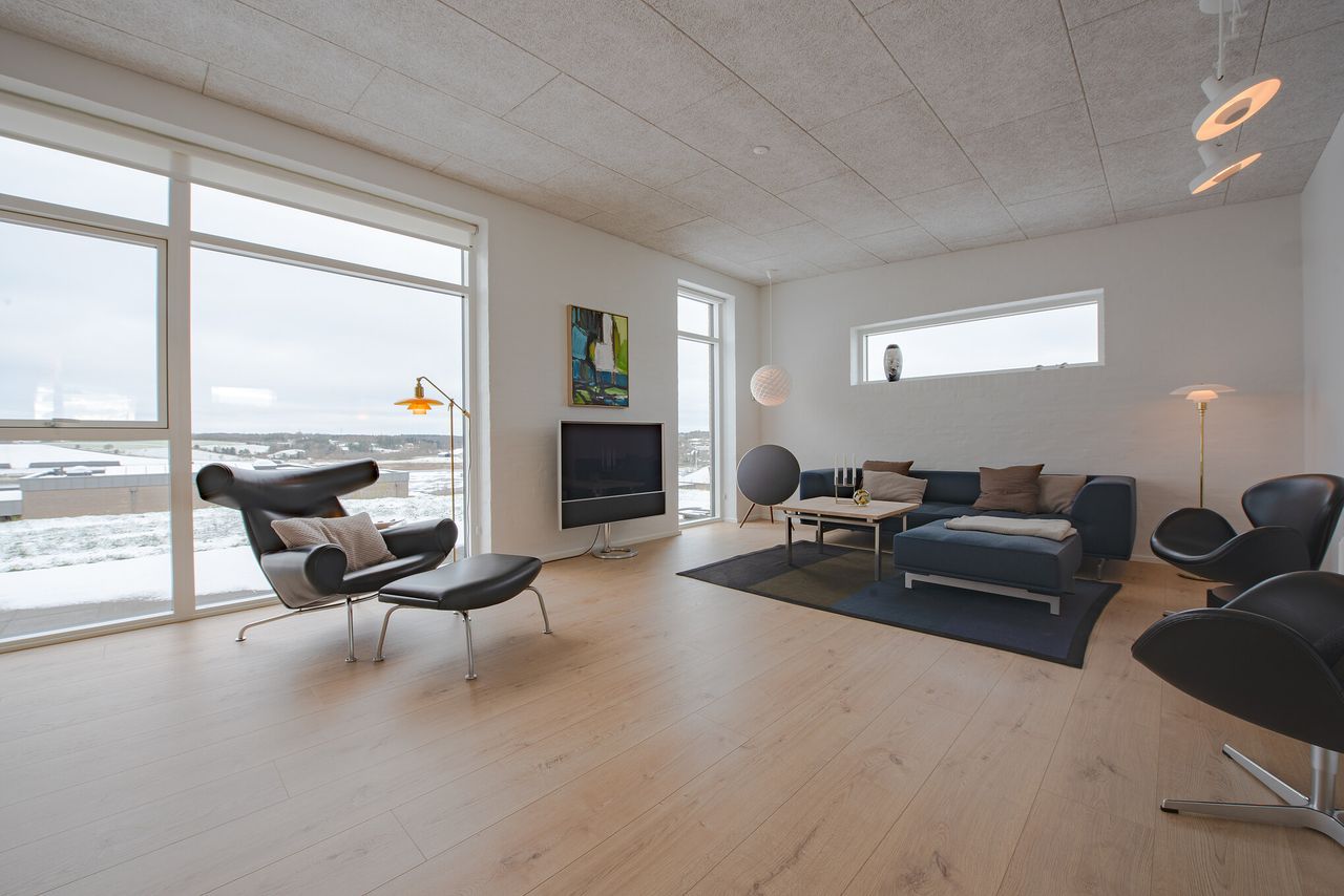 Planløsningen er gennemtænkt med lyse opholdsrum, hvor store vinduespartier inviterer udsigten og dagslyset helt indenfor. Her får man en bolig, der er ideel for både børnefamilien, parret eller seniorerne, som ønsker en nem og komfortabel hverdag i naturskønne omgivelser – men stadig med kort afstand til Viborgs mange tilbud.
