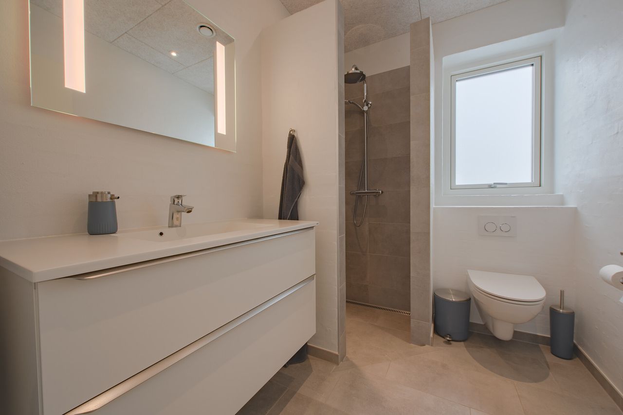 Boligen fremstår i flot og tidssvarende stand med et moderne udtryk både ude og inde. Overalt i huset er der gulvvarme, som sikrer en behagelig komfort året rundt, og det effektive Genvex-anlæg bidrager til et sundt indeklima og lave driftsomkostninger.