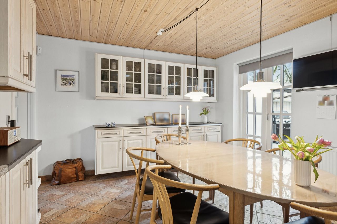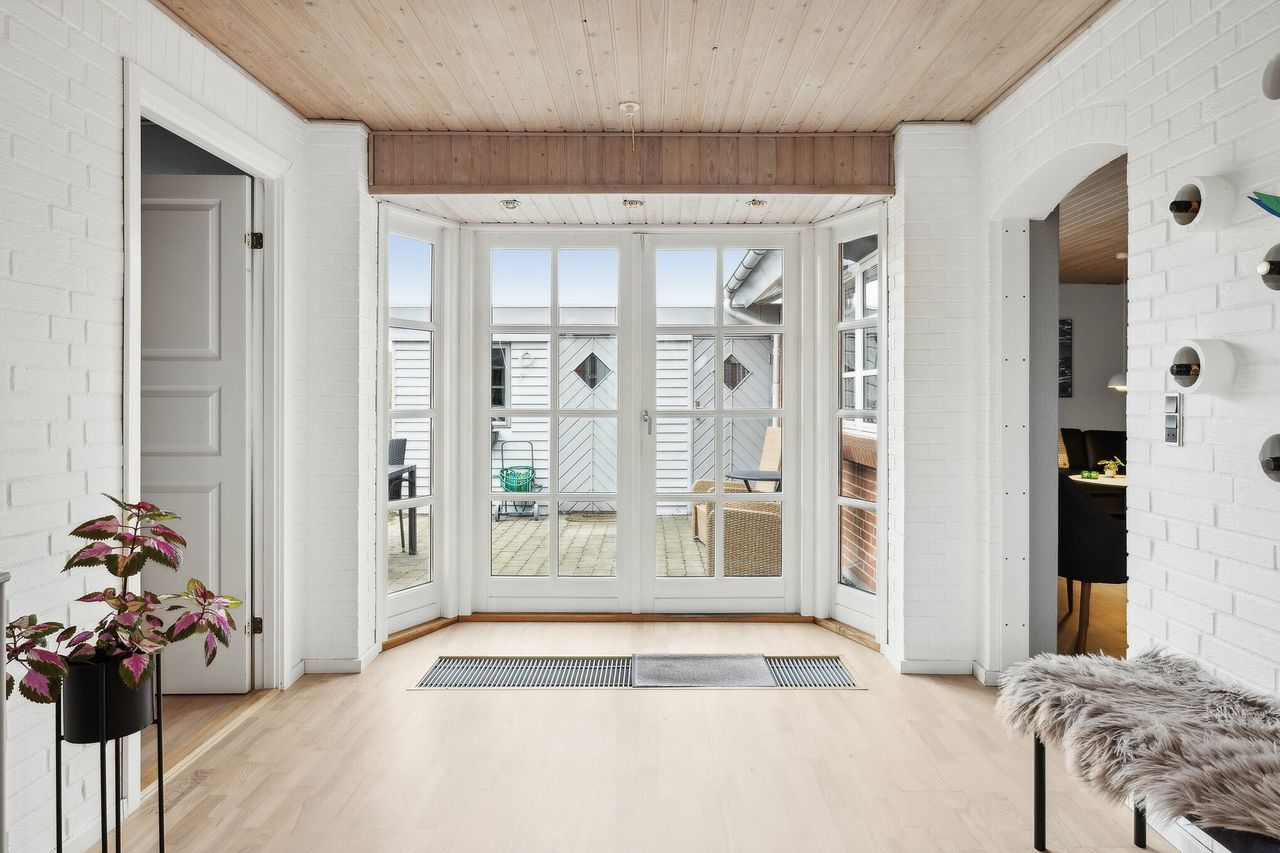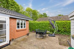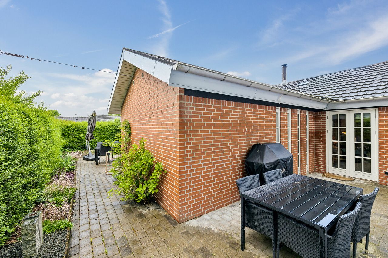 Den sydvendte terrasse er indrettet med udekøkken og flere solrige opholdsarealer, som indbyder til udeliv det meste af dagen. Derudover medfølger carport, udhus og en velanlagt forhave. Ejendommen ligger for enden af en blind vej med direkte adgang til grønne fællesarealer, stisystemer og legeplads, hvilket bidrager til en rolig og tryg hverdag.