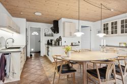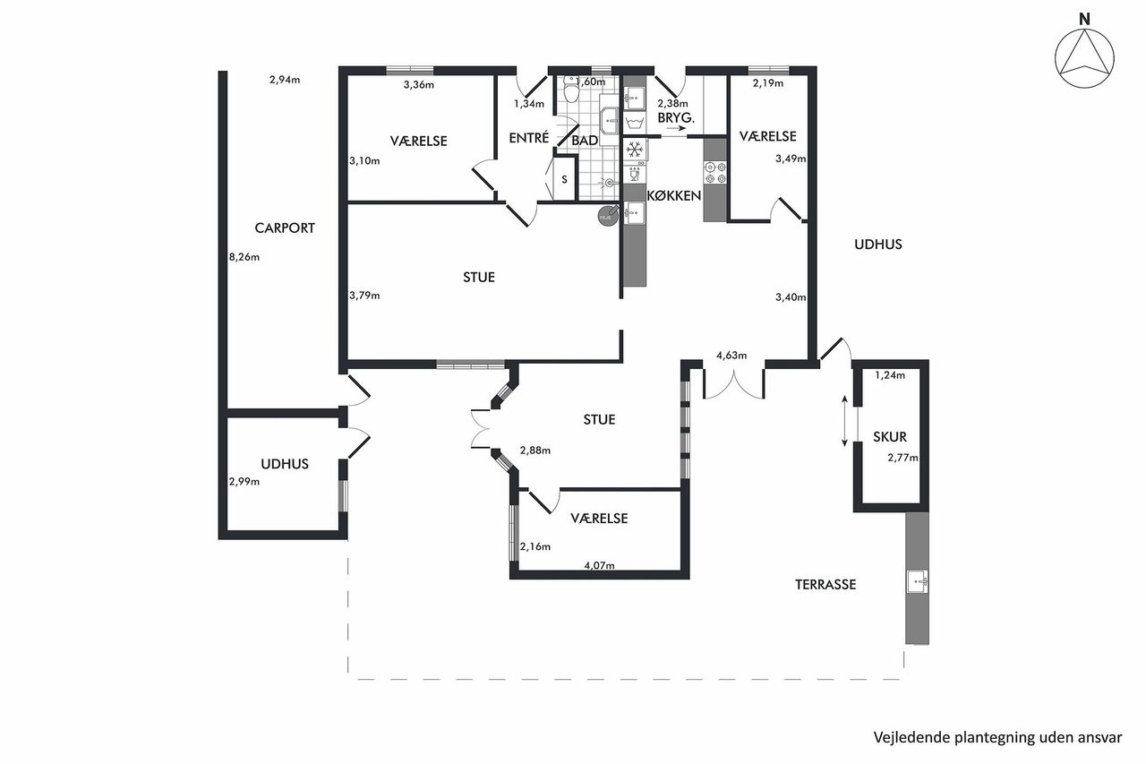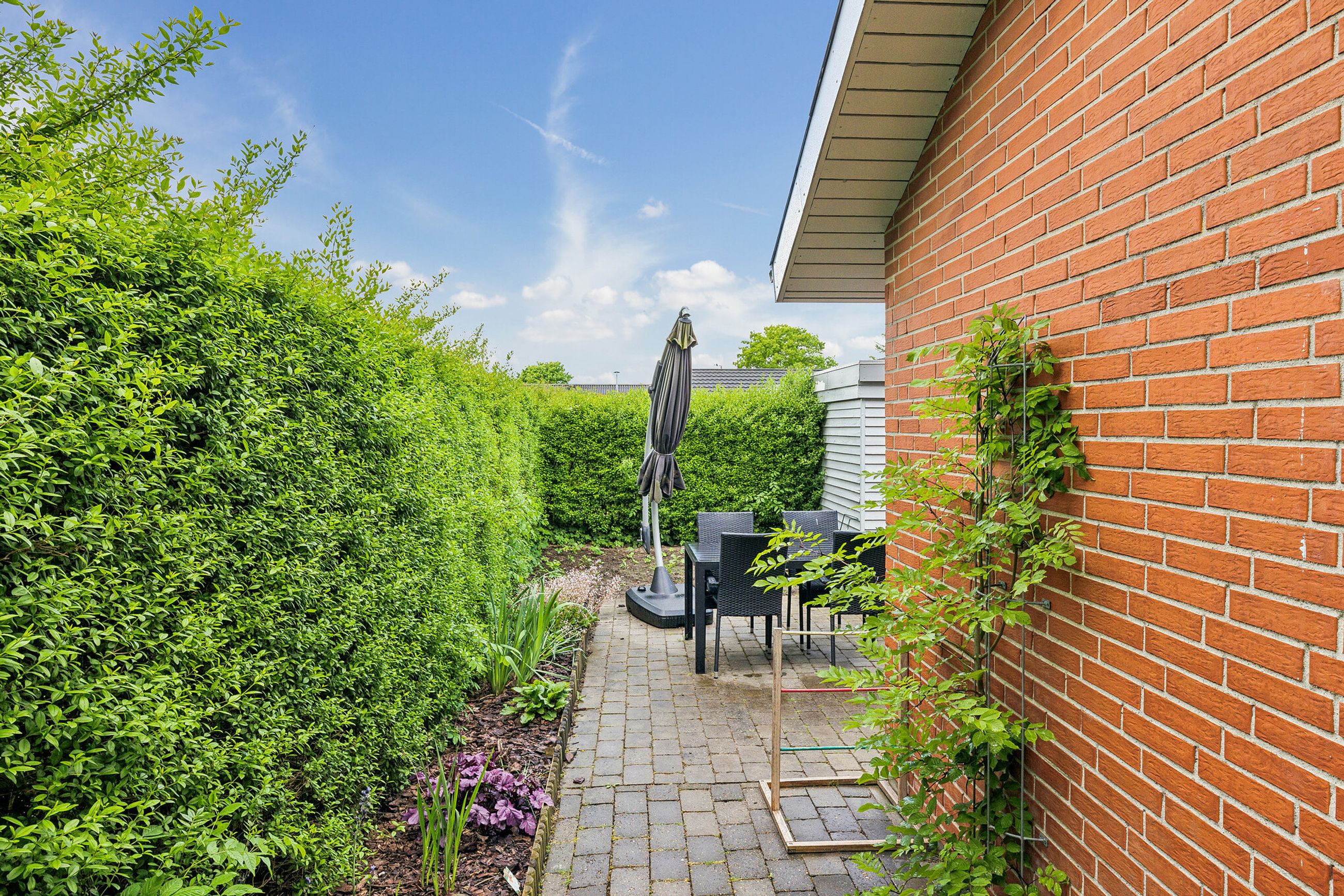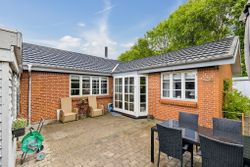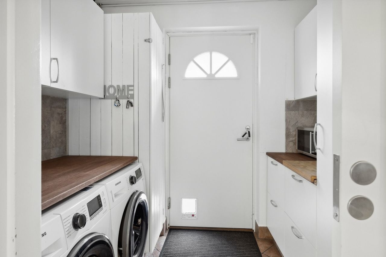 Den sydvendte terrasse er indrettet med udekøkken og flere solrige opholdsarealer, som indbyder til udeliv det meste af dagen. Derudover medfølger carport, udhus og en velanlagt forhave. Ejendommen ligger for enden af en blind vej med direkte adgang til grønne fællesarealer, stisystemer og legeplads, hvilket bidrager til en rolig og tryg hverdag.