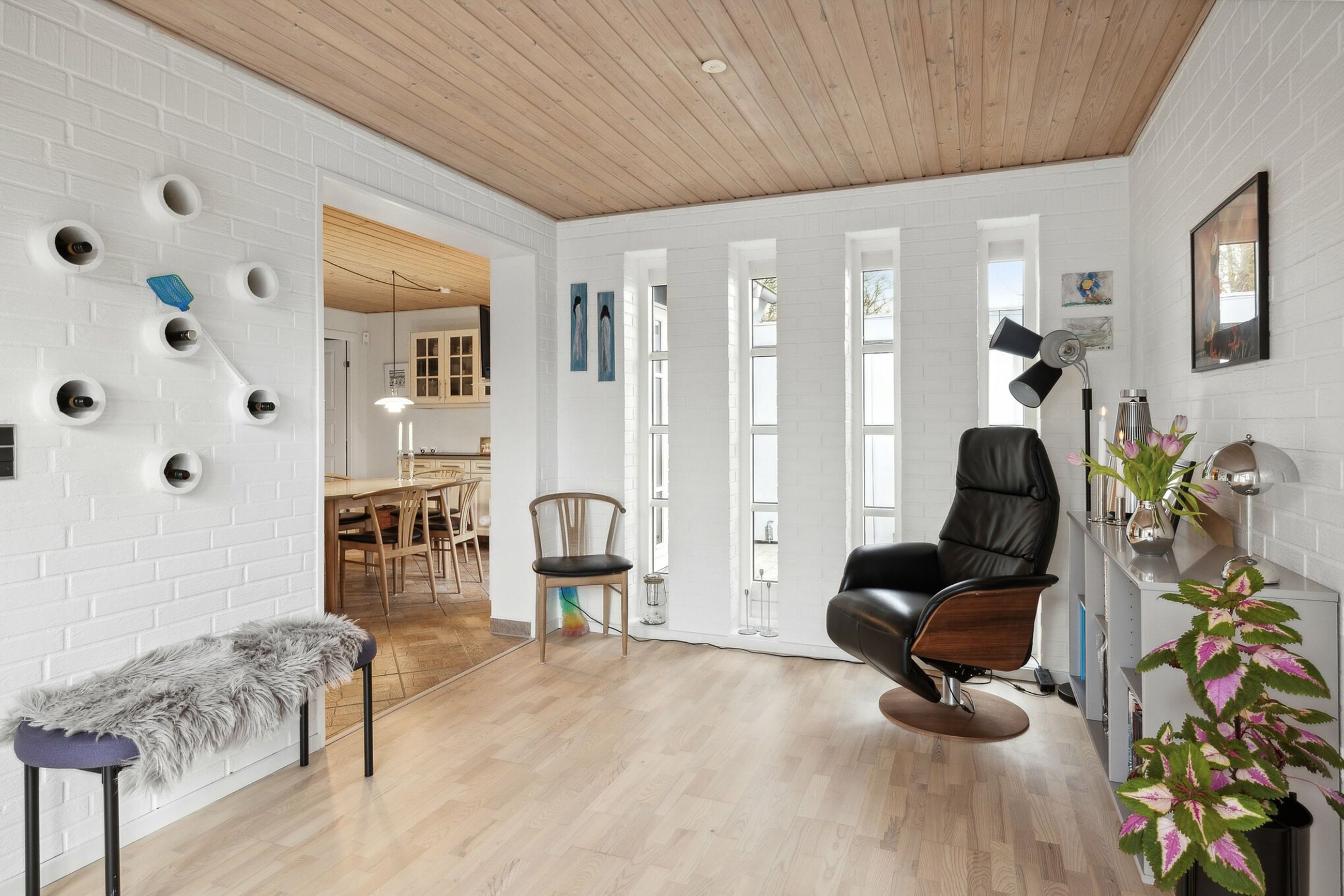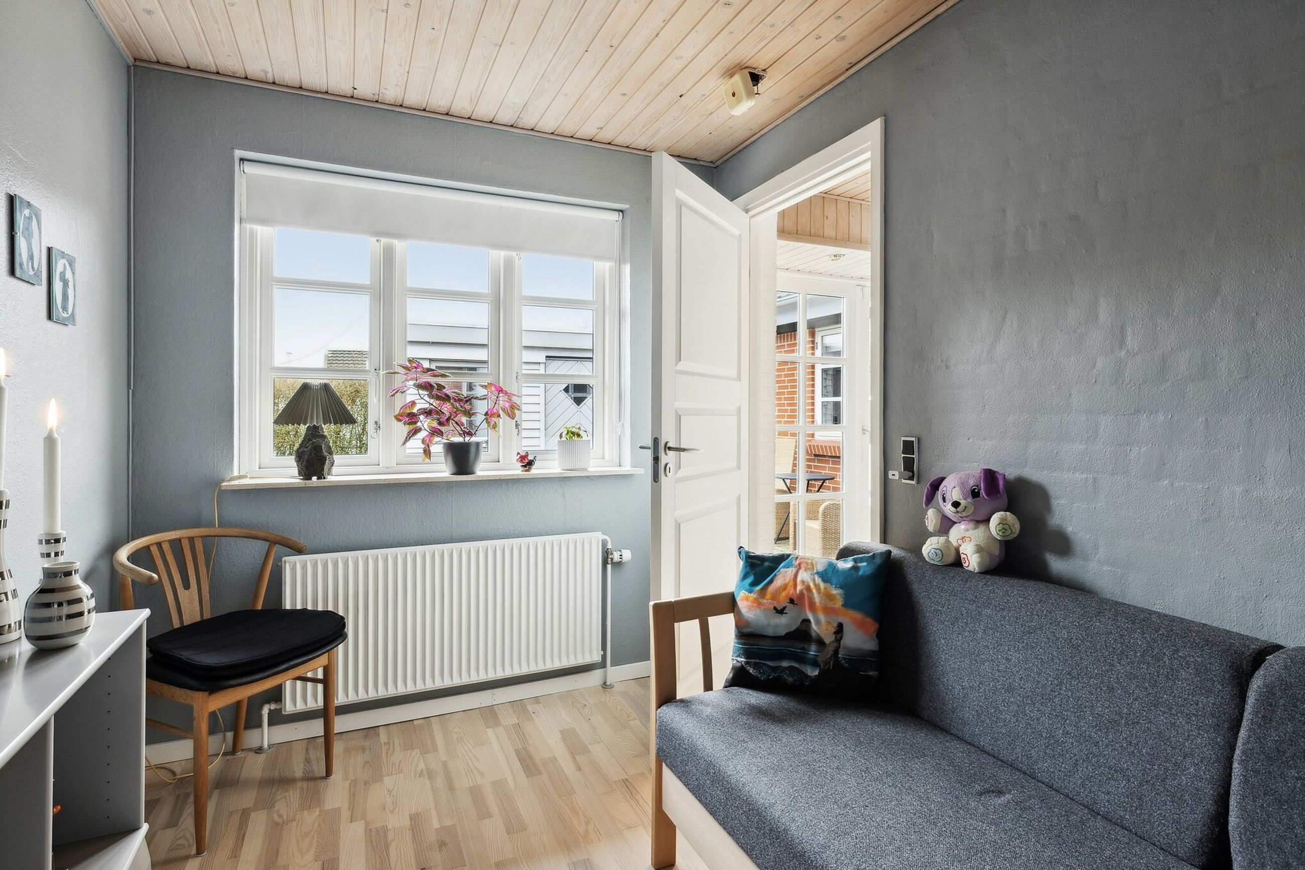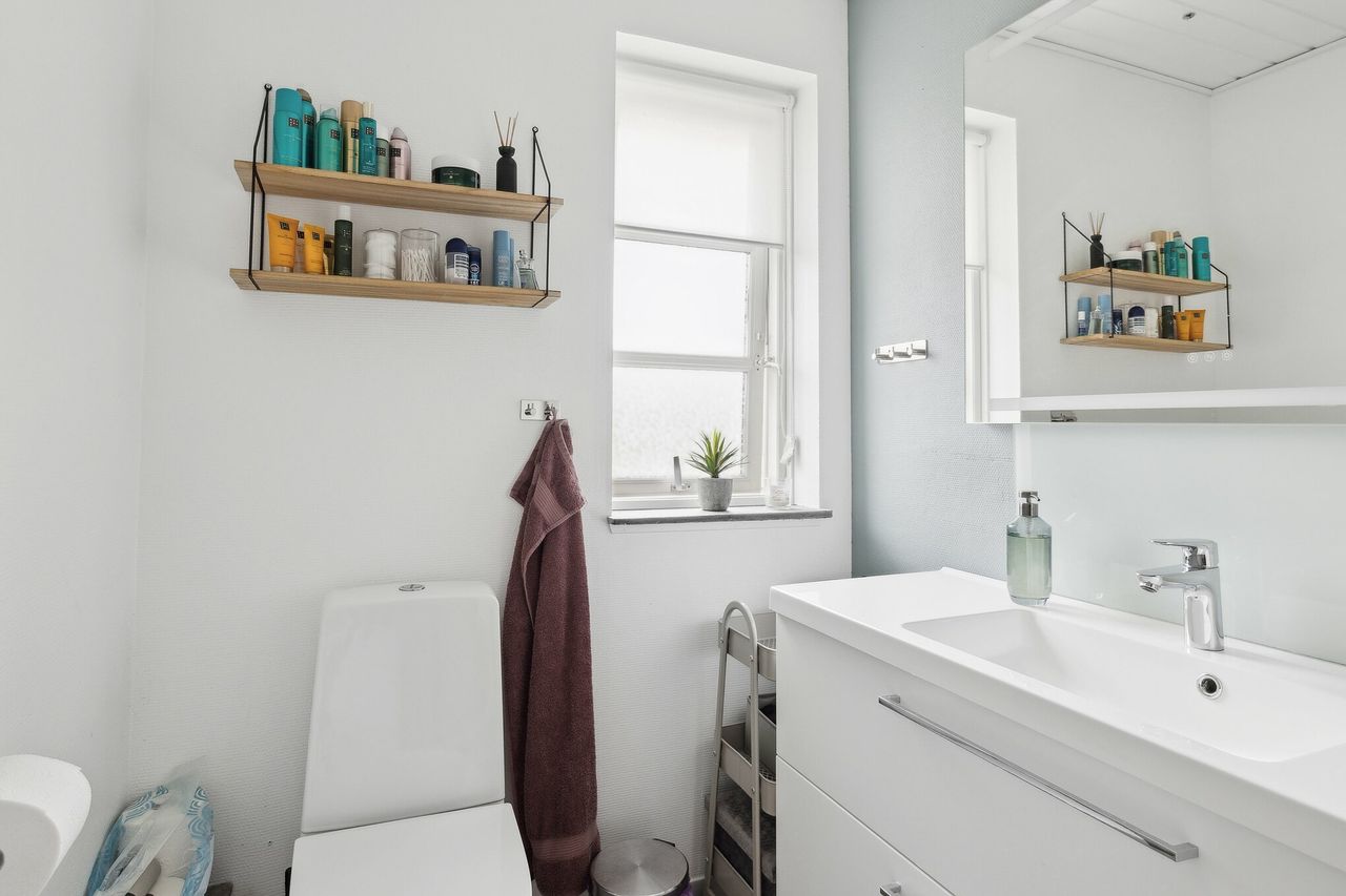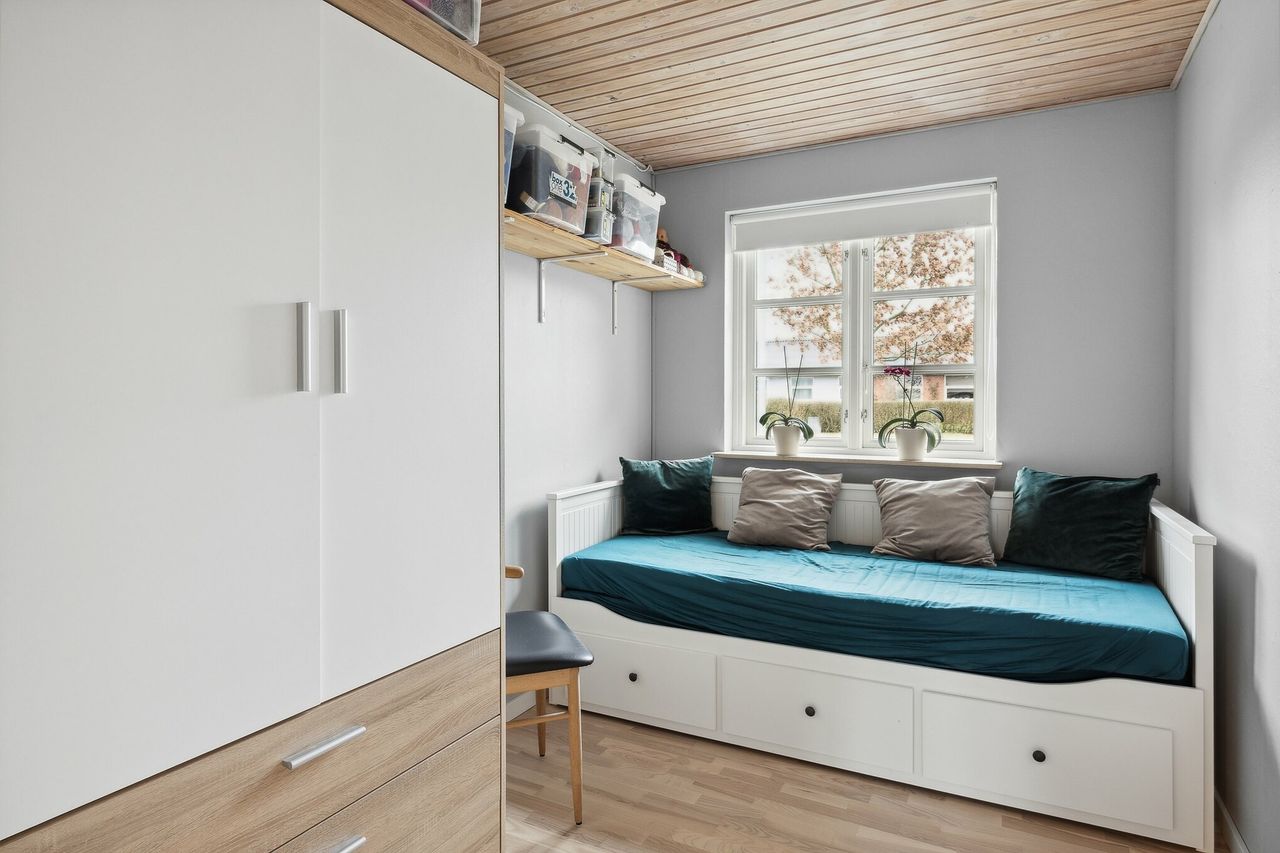 Rækkehuset er opført i 1982 og rummer 115 veldisponerede kvadratmeter, hvor pladsen er udnyttet optimalt. Planløsningen byder på tre værelser, to stuer og et rummeligt køkken samt entré, badeværelse og bryggers. Det største værelse er oplagt som soveværelse, mens de øvrige kan indrettes efter behov – til børn, gæster eller hjemmearbejde. Køkkenet har plads til spisebord og fungerer som et naturligt samlingspunkt, mens stuerne giver gode rammer for både afslapning og samvær. I den største stue bidrager brændeovnen med ekstra hygge.