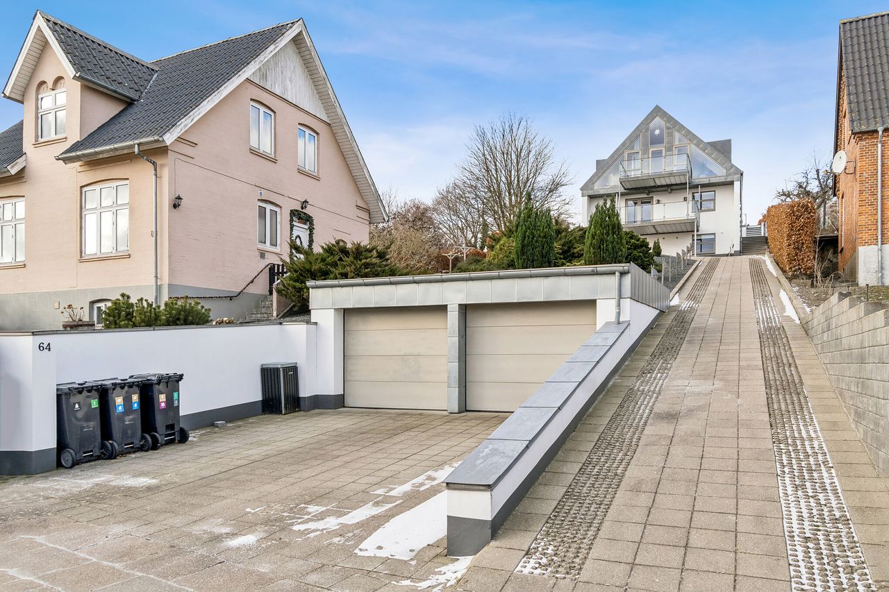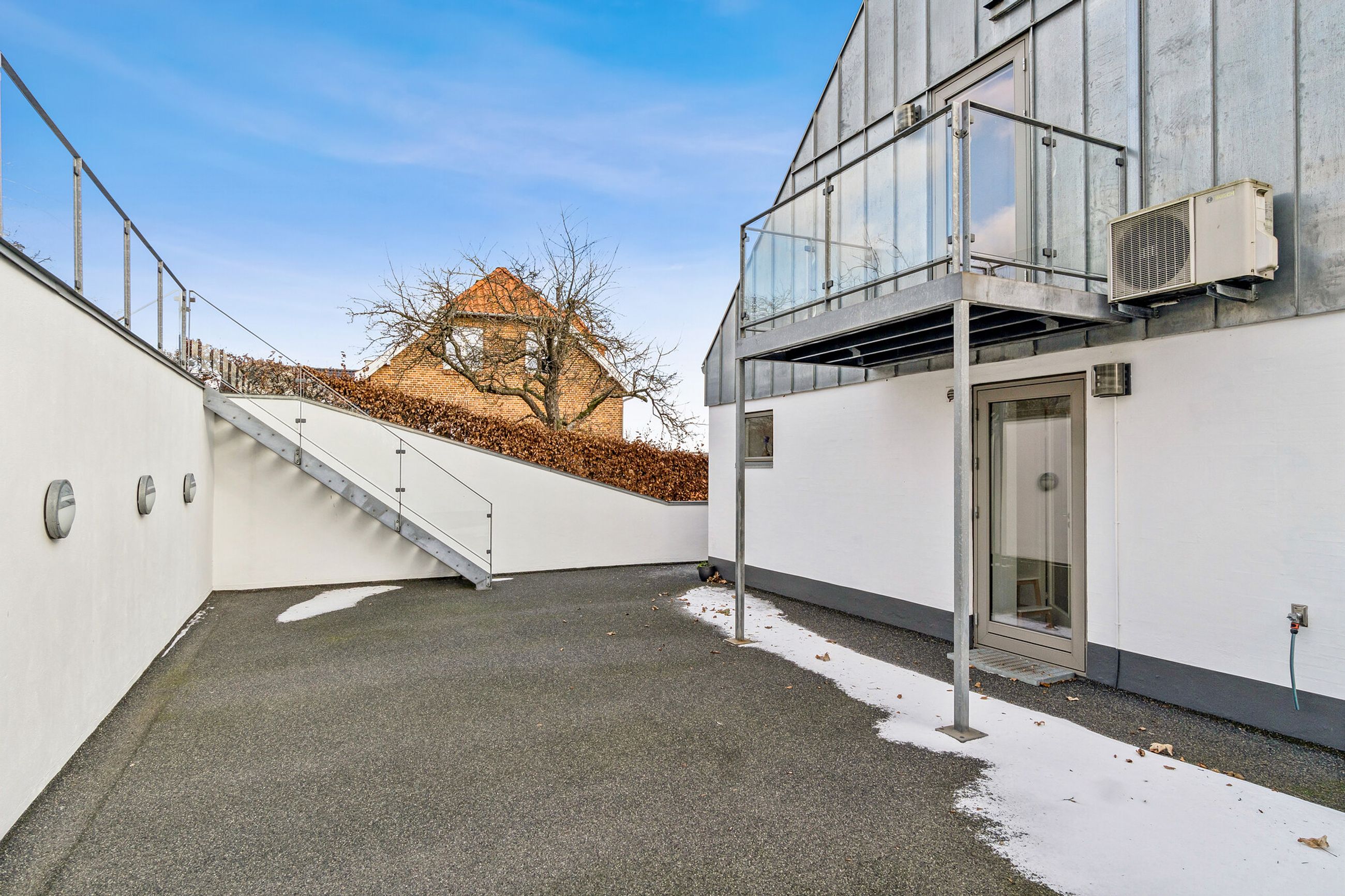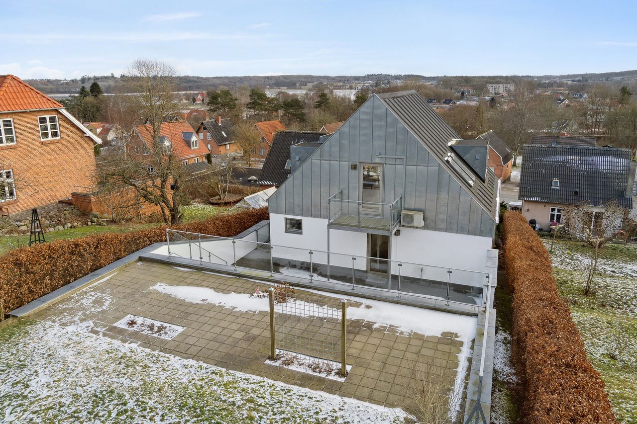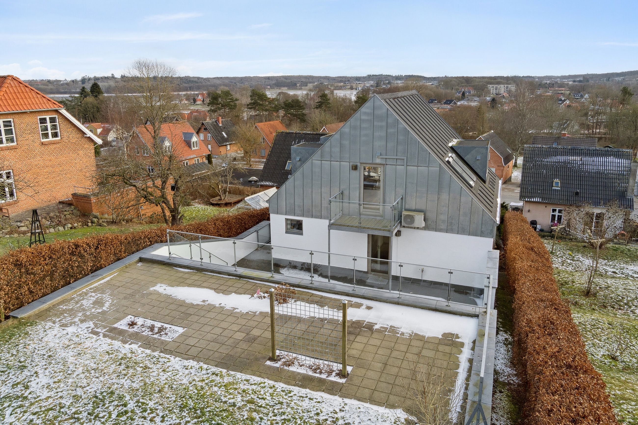 Denne imponerende villa i tre plan byder på en helt særlig kombination af arkitektonisk udtryk, høj komfort og en enestående beliggenhed med smuk udsigt over området og Søndersø. Huset er beliggende på en stejl grund, hvilket giver optimale udsigtsforhold og et flot kig ud over både landskab og sø – en udsigt, der kan nydes fra flere af boligens terrasser.