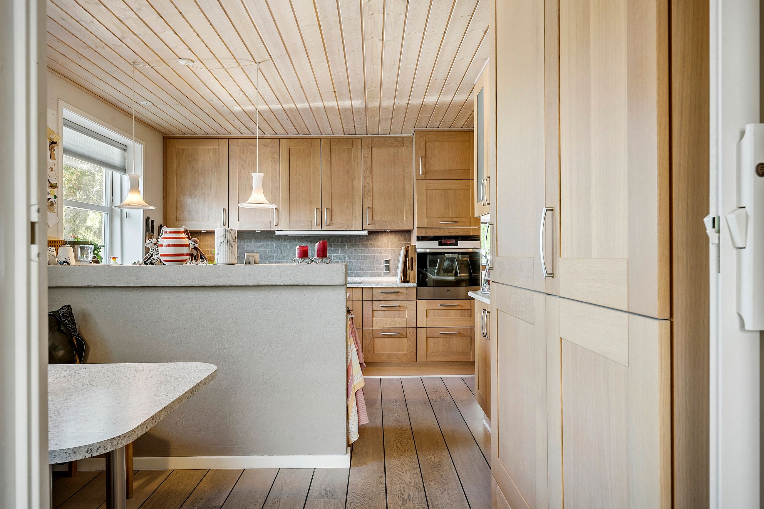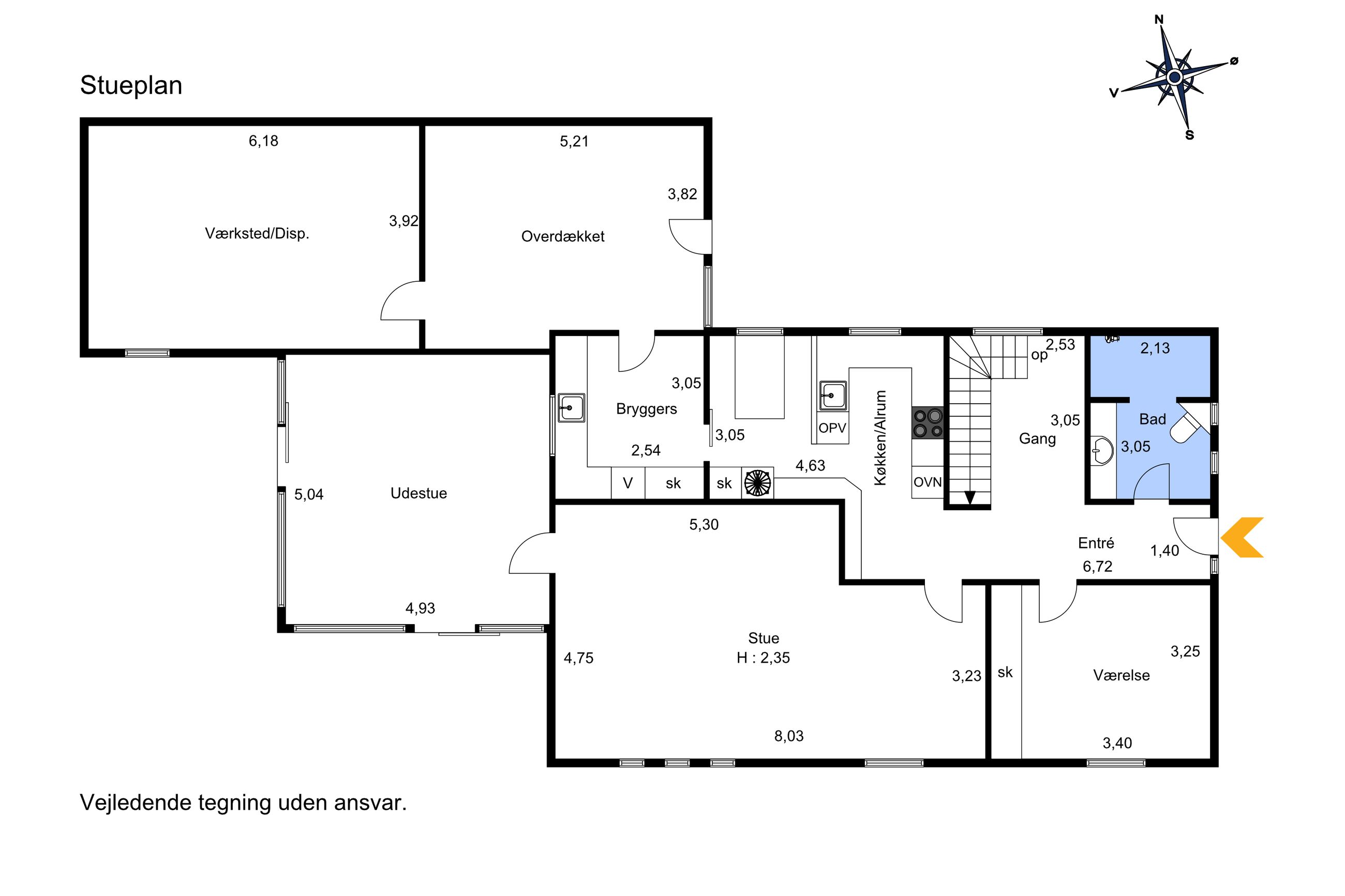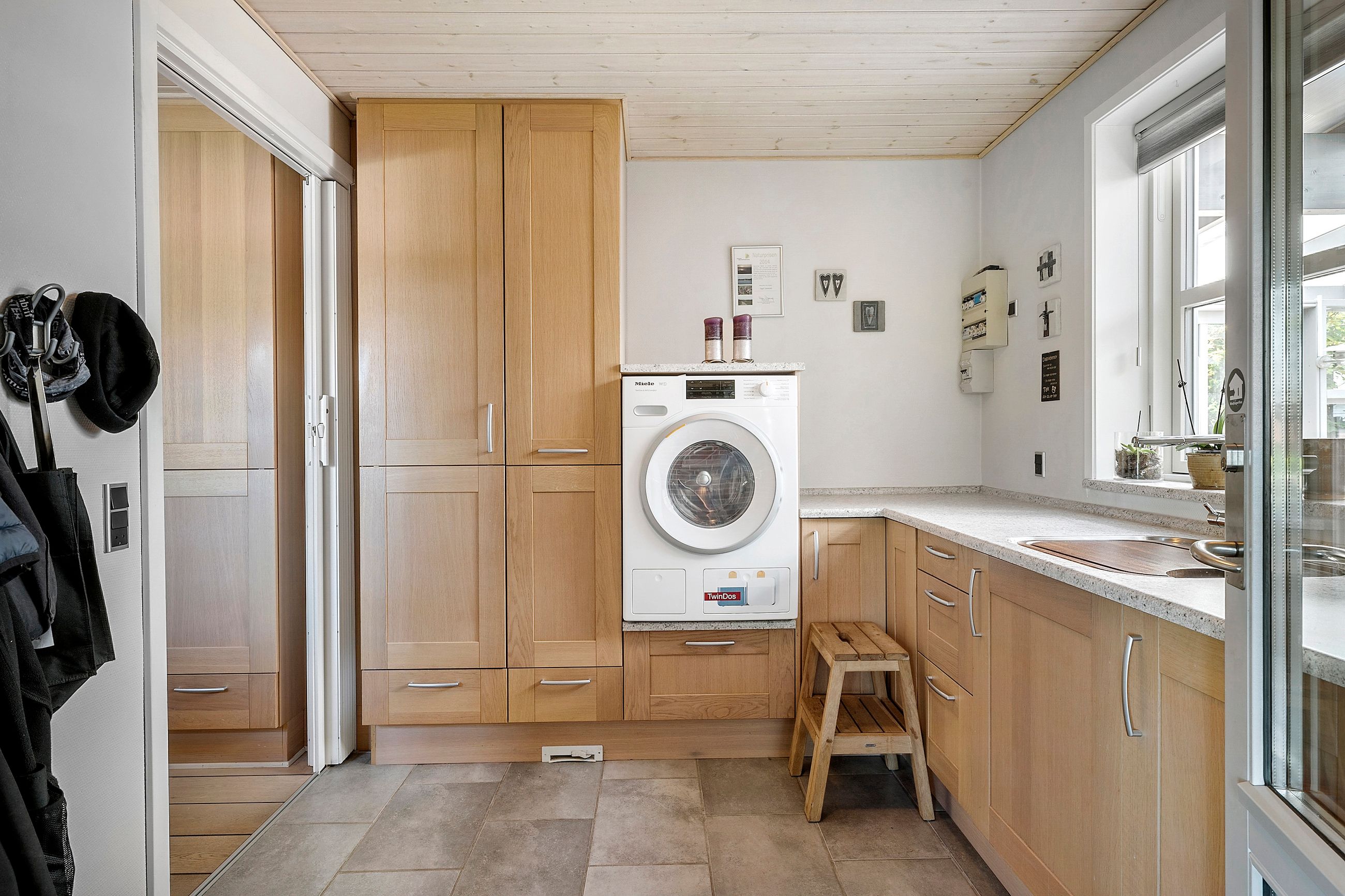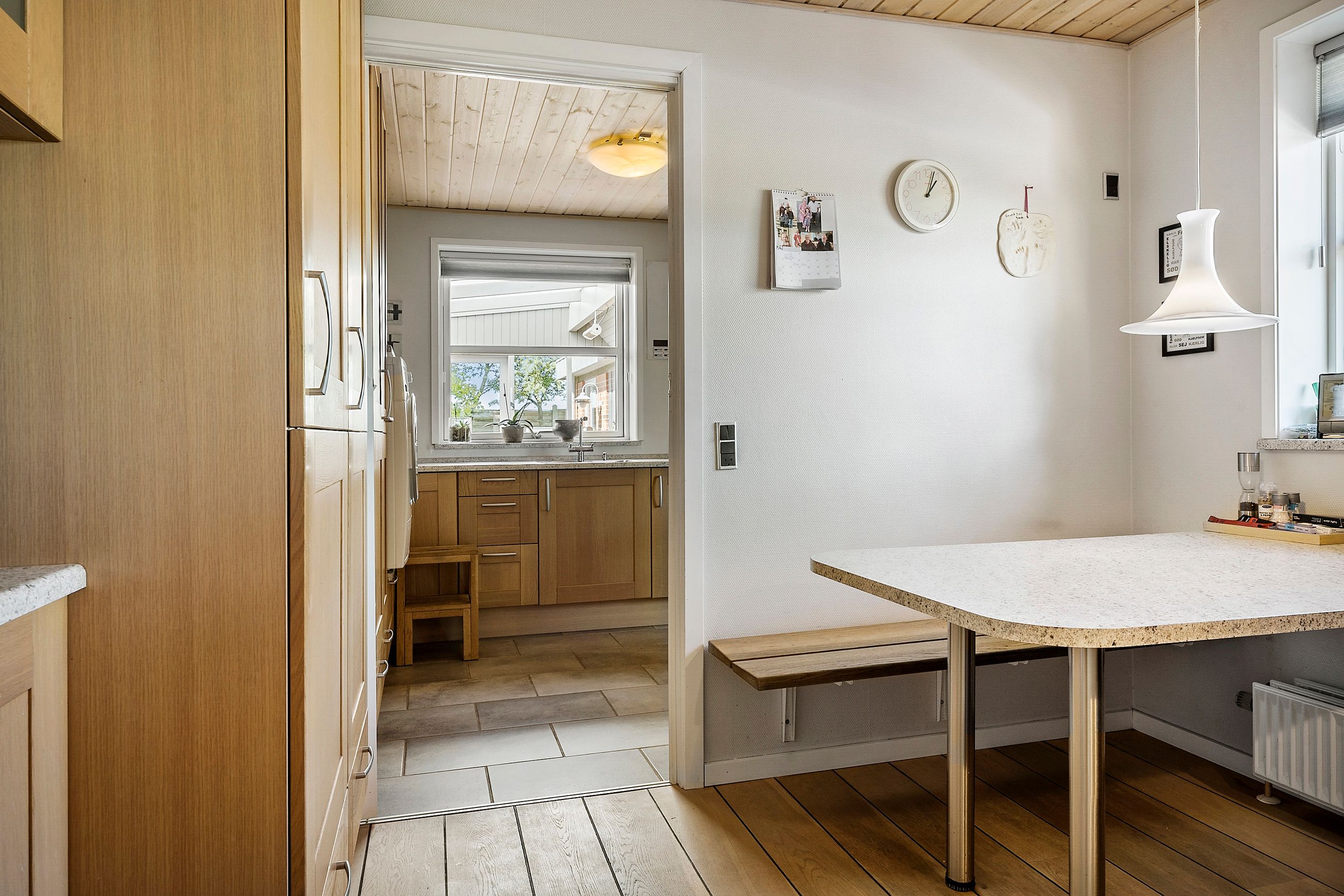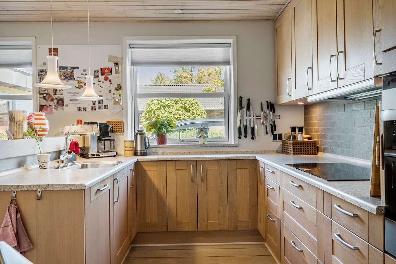 Indretningen er både funktionel og rummelig. Via entréen er der adgang til boligens øvrige rum, herunder et pænt lyst Tvis Køkken fra 2008 med god skabs- og spiseplads. I stueplan findes desuden et godt værelse, et badeværelse fra 2019 med stor bruseniche og gulvvarme, en regulær og indbydende stue med direkte udgang til den integrerede udestue og haven samt funktionelt baggang/bryggers med gulvvarme..