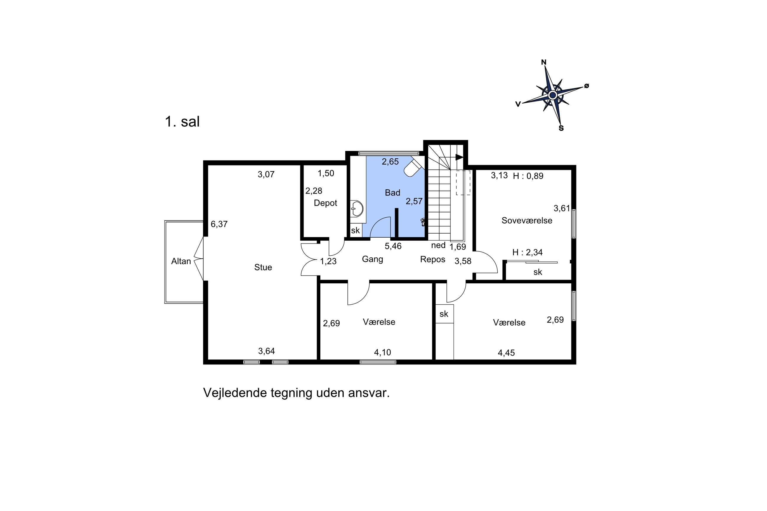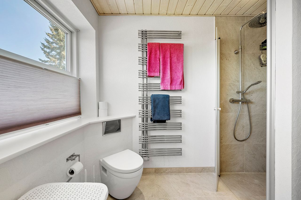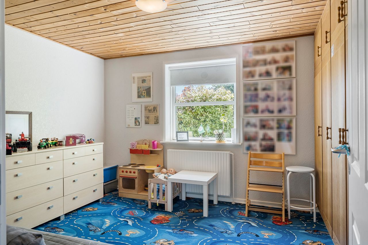 På 1. sal er der hele fire gode værelser, et depotrum samt et pænt badeværelse fra 2013 med gulvvarme og brus.