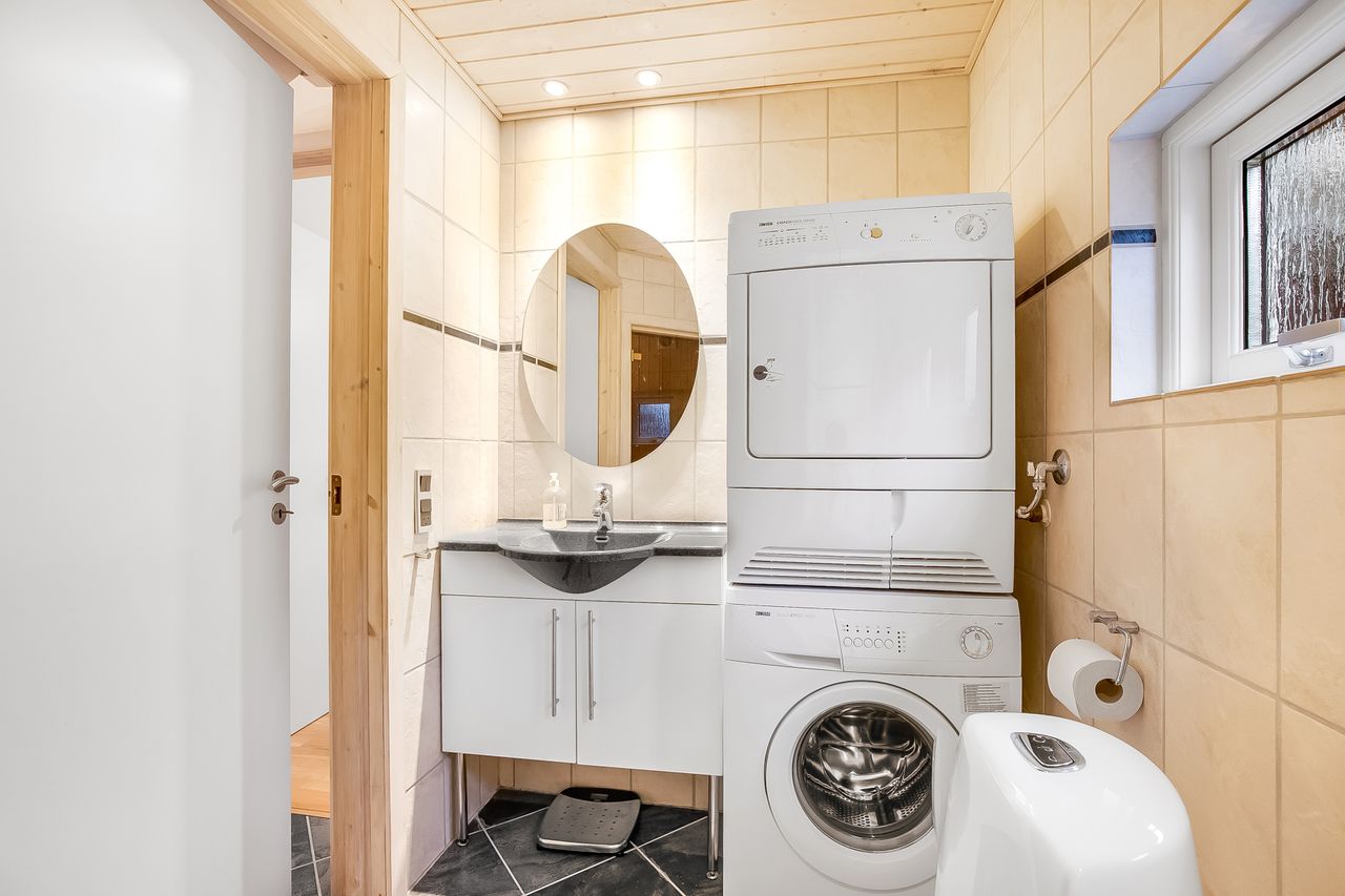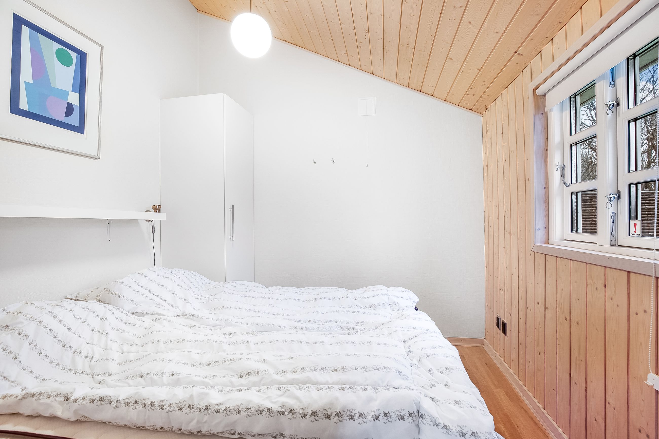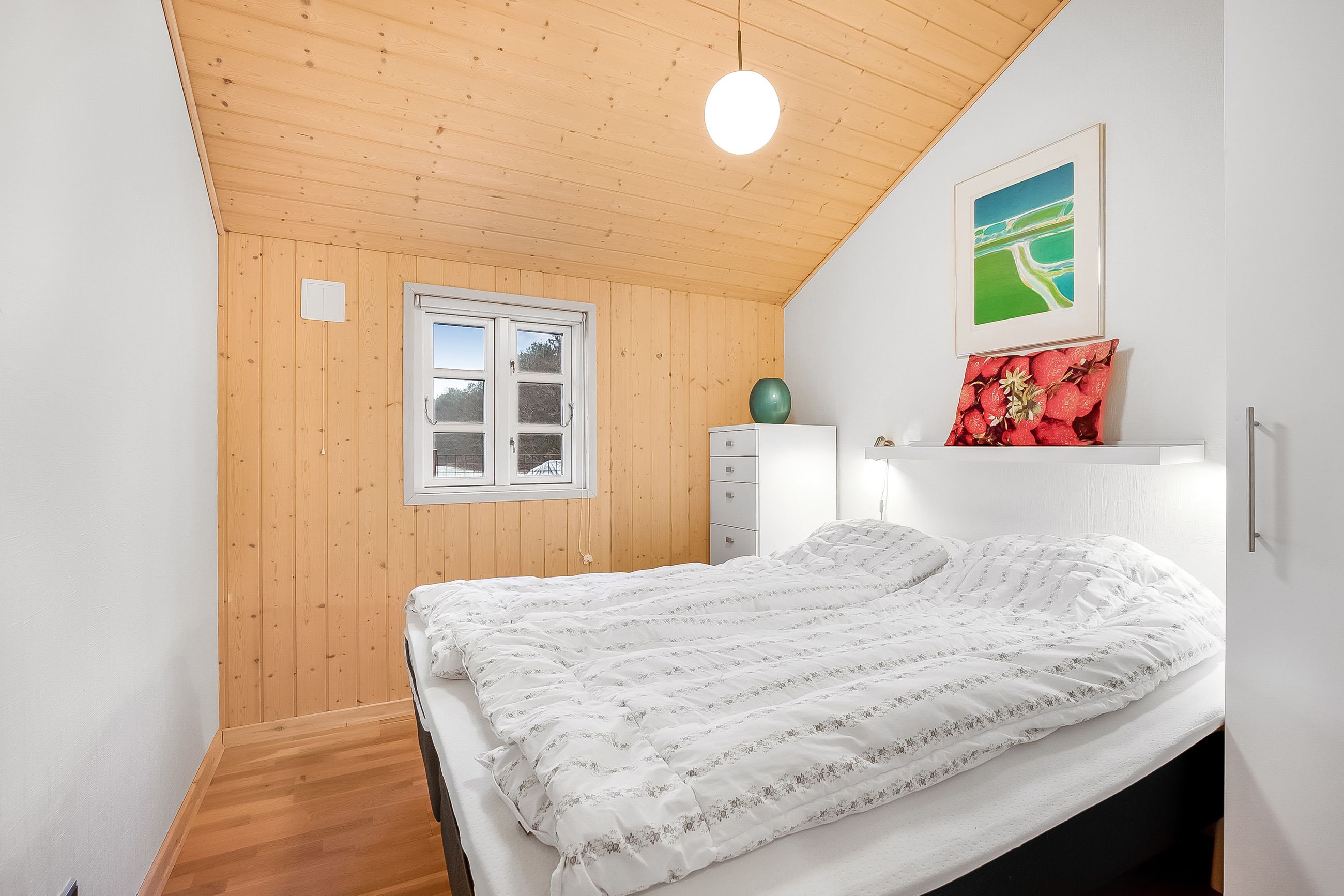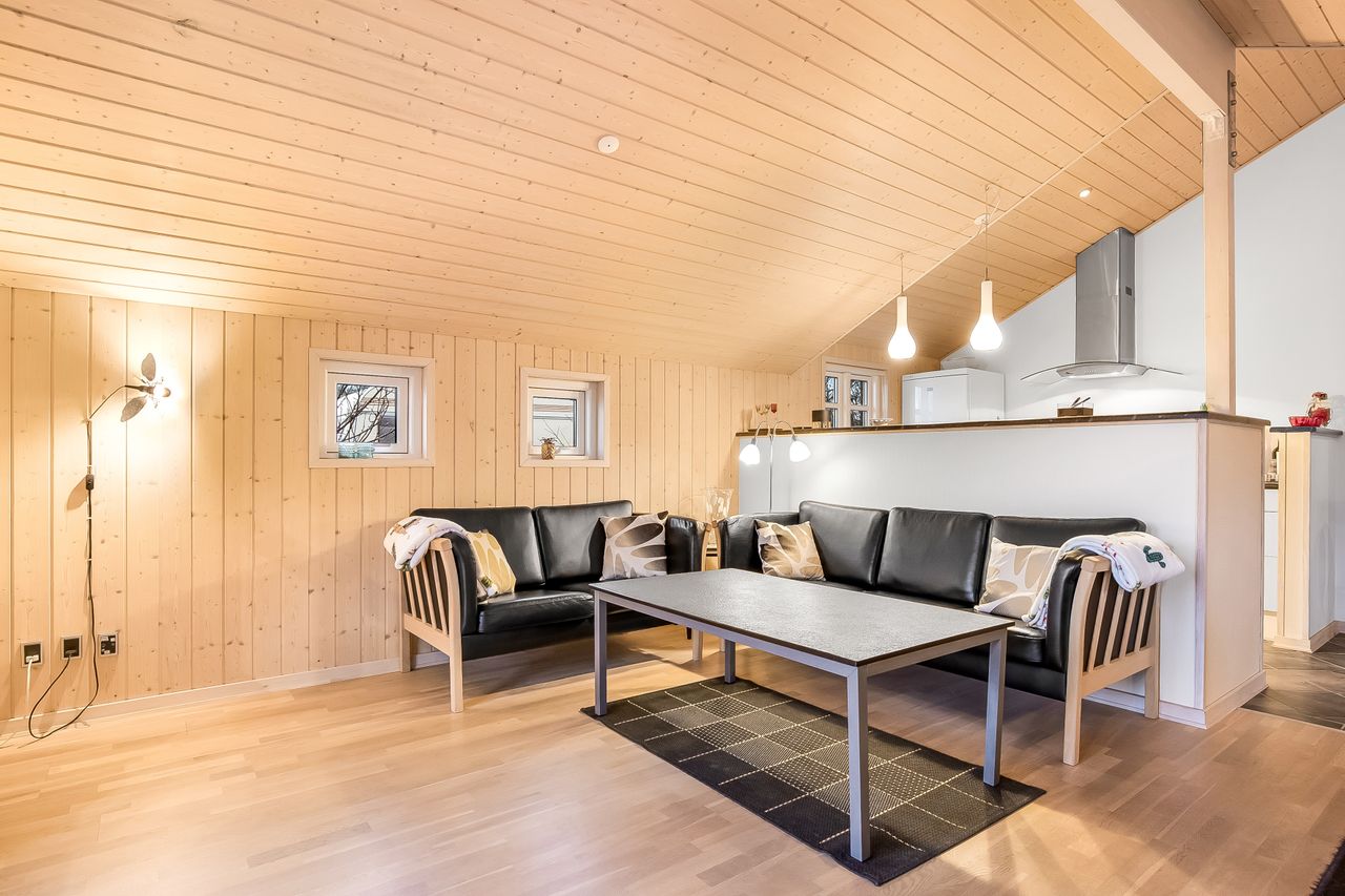 Endvidere 2 gode soveværelser med hems over det ene. Velindrettet badeværelse med brus og sauna.