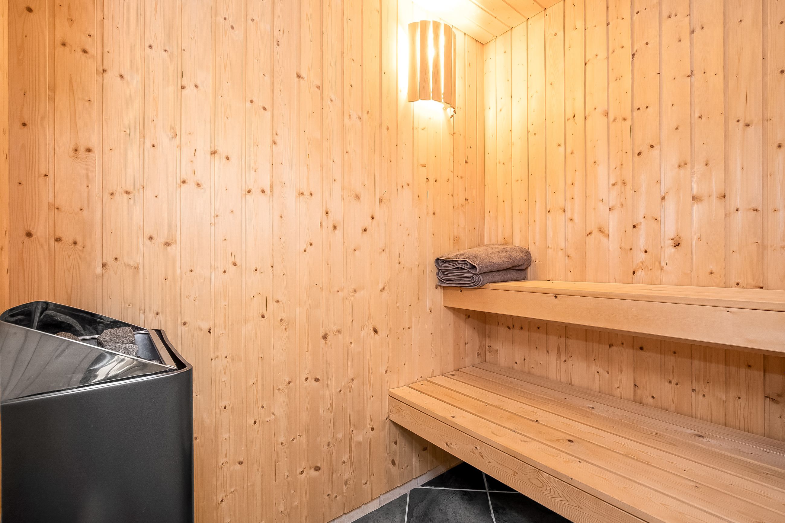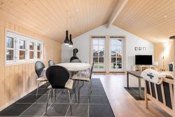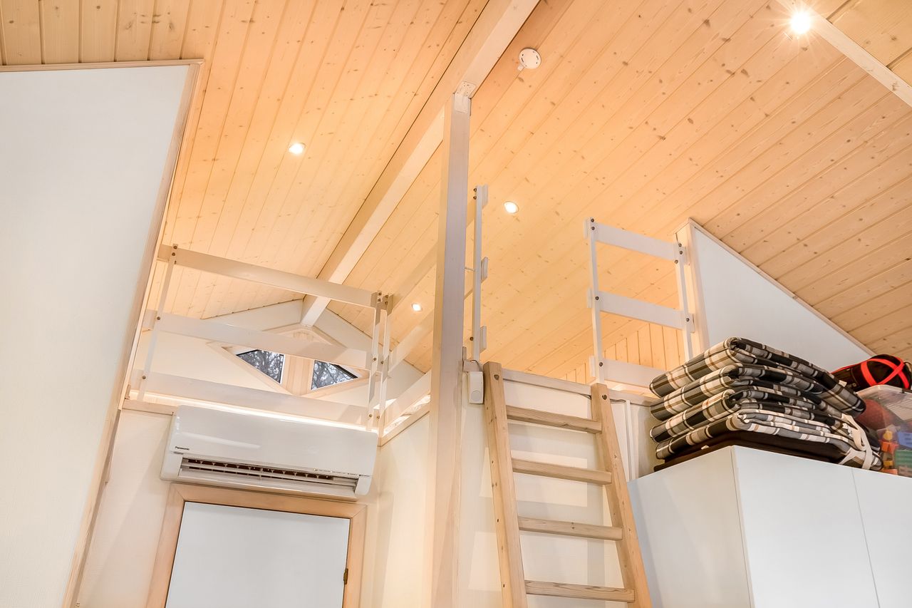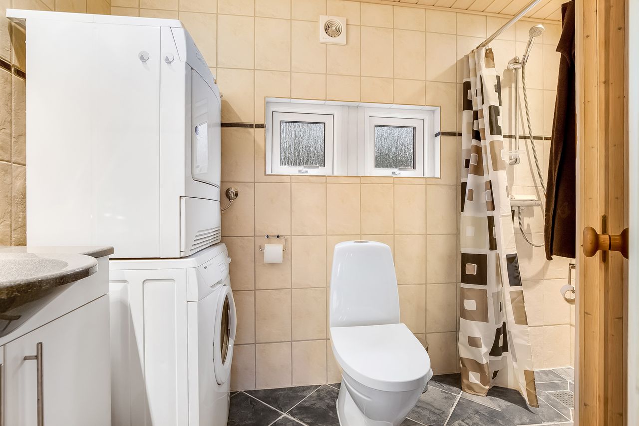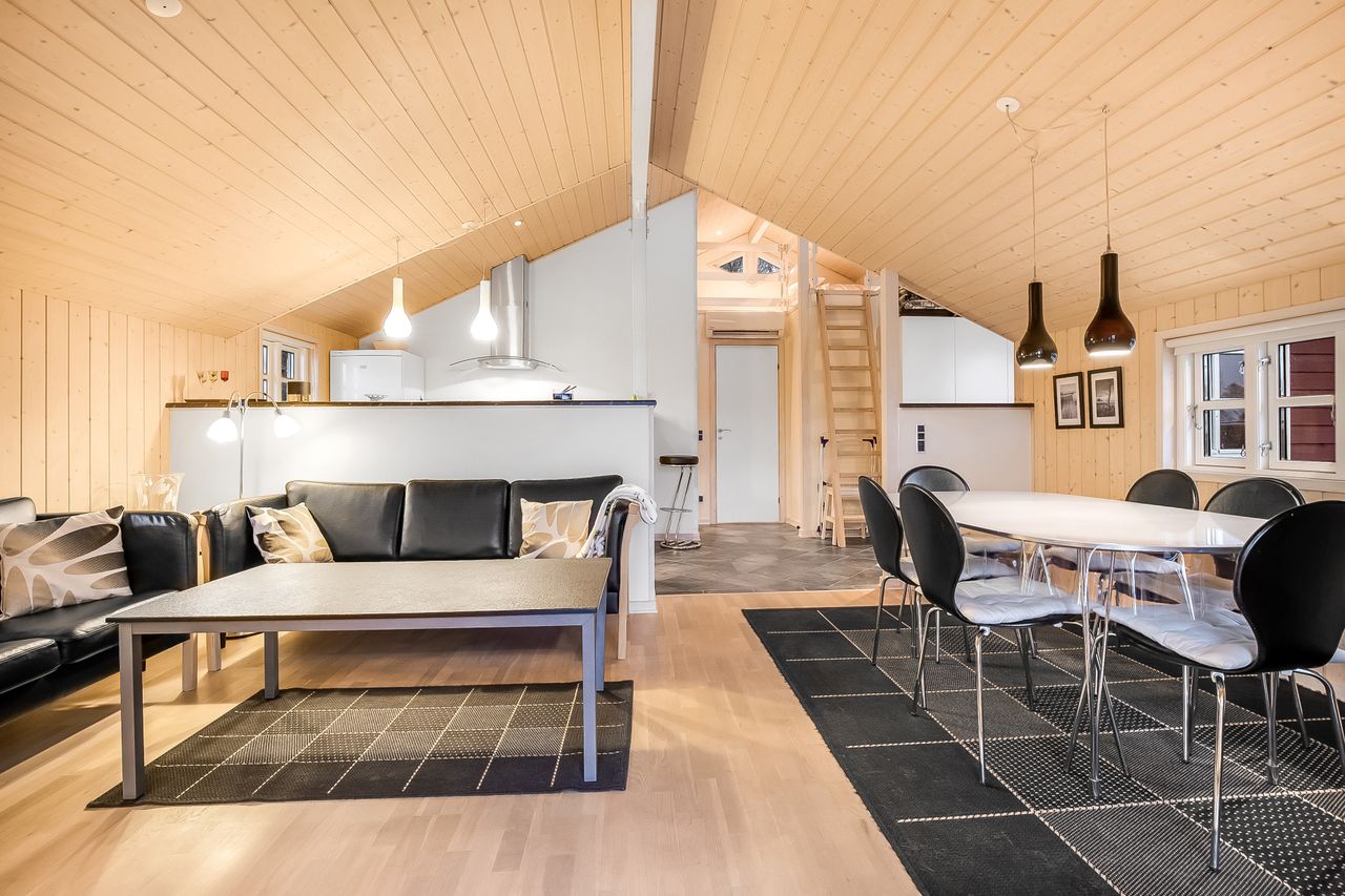 Endvidere 2 gode soveværelser med hems over det ene. Velindrettet badeværelse med brus og sauna.