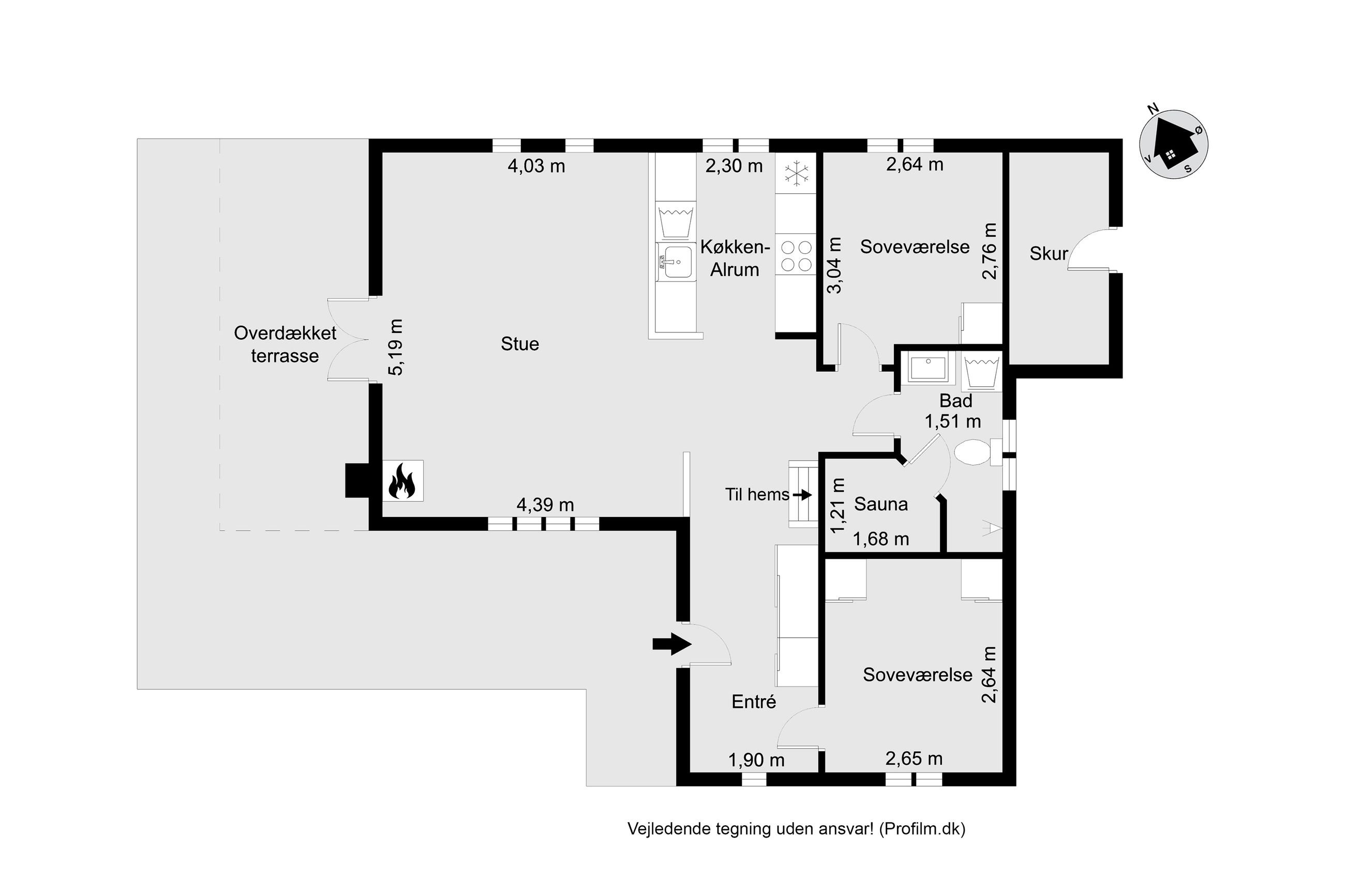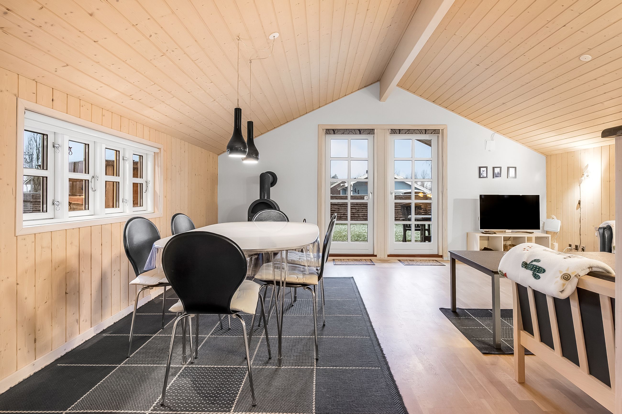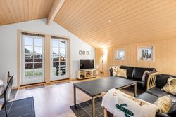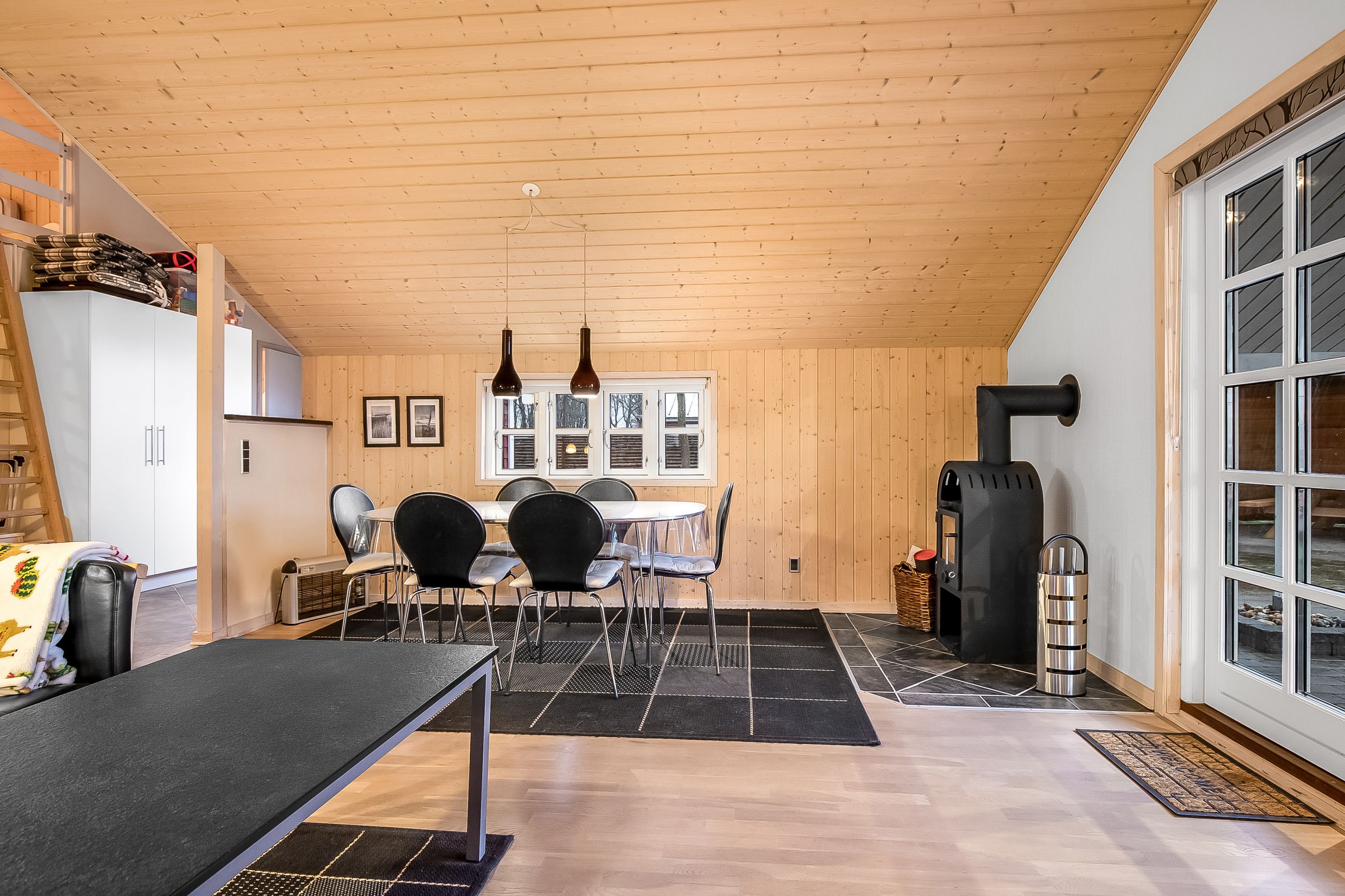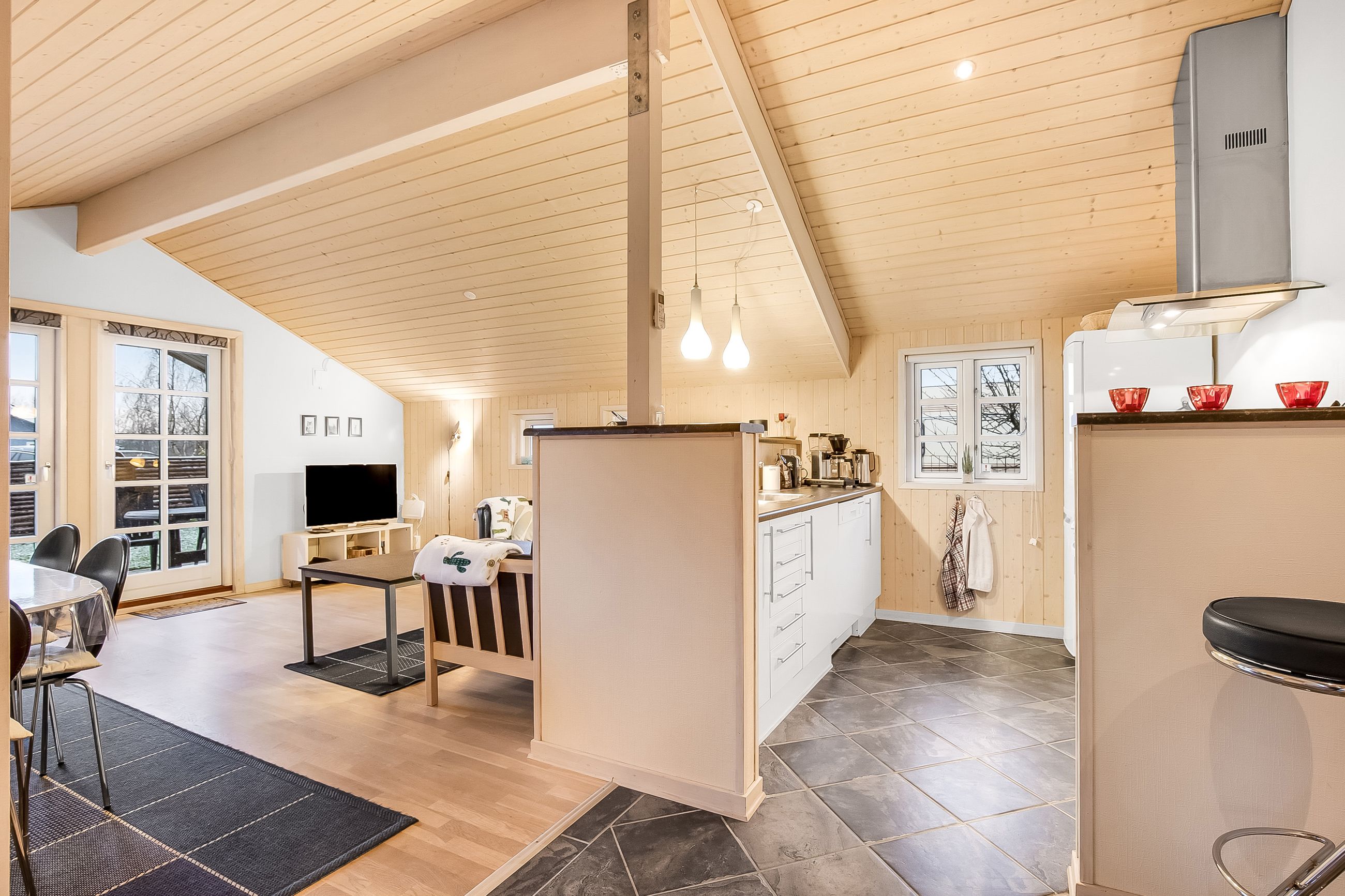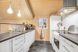 kogeområdet og trægulv i opholdsstue. Supplerende varmekilde fra brændeovn. Fra stuen udgang til