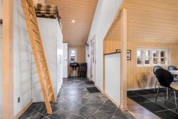 Indretningen består af entre/garderobe/vaskerum i forb. m. køkken / alrum med loft i kip, klinker i