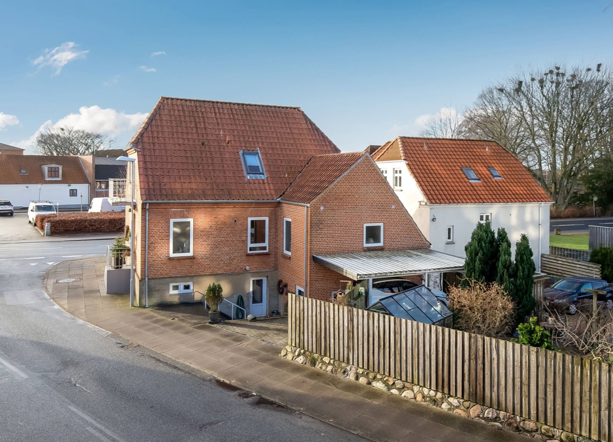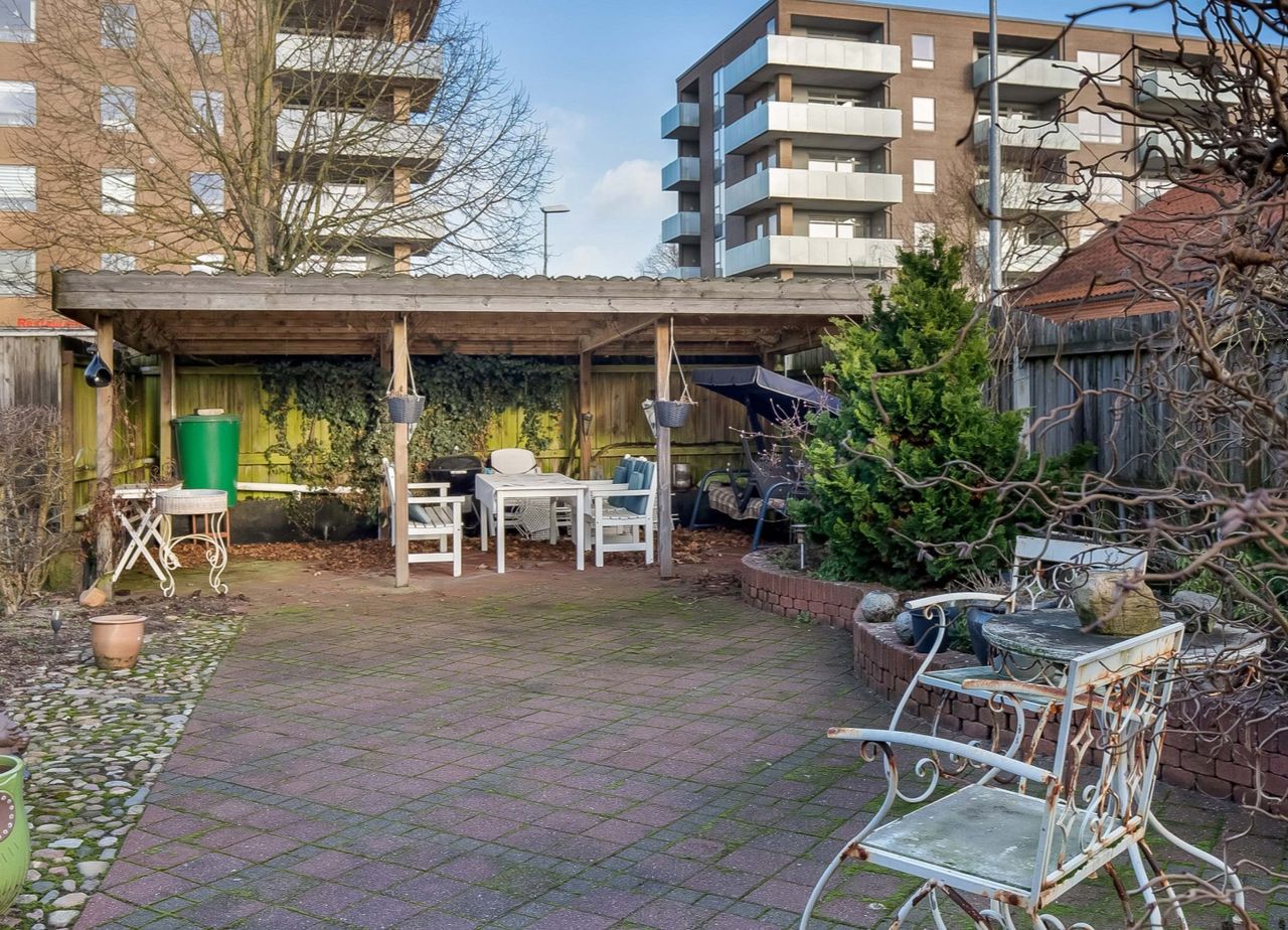 Velplejet læfuld haveparti med bl.a. stor flisebelagt terrasse og overdækket område, hvor man færdes ugeneret. Dagligvarebutikker samt et bredt udvalg af indkøbsmuligheder i umiddelbar nærhed.