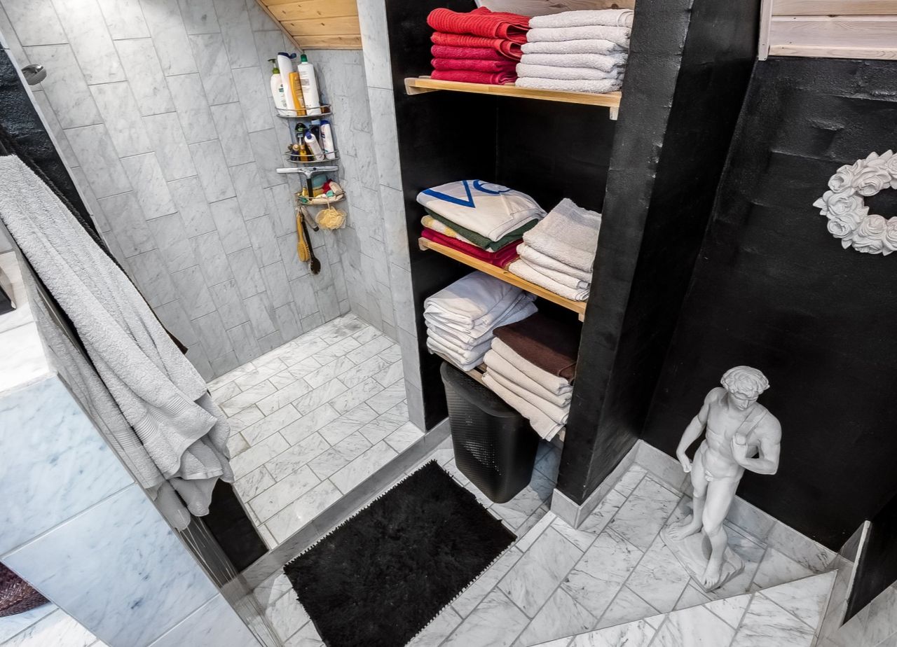 Repos / mellemgang til soveværelse m. skabsvæg, stort værelse (opr. opdelt i 2 ) samt bad m. brus.