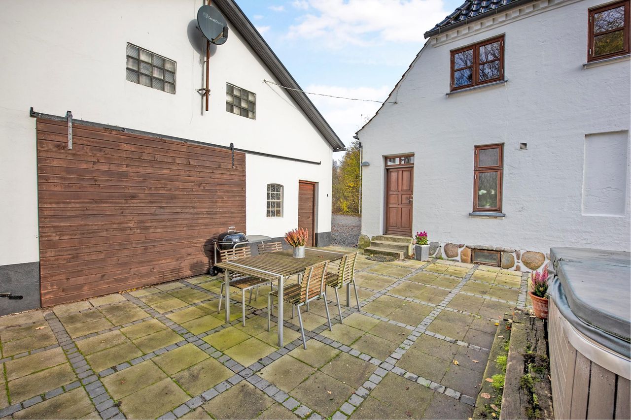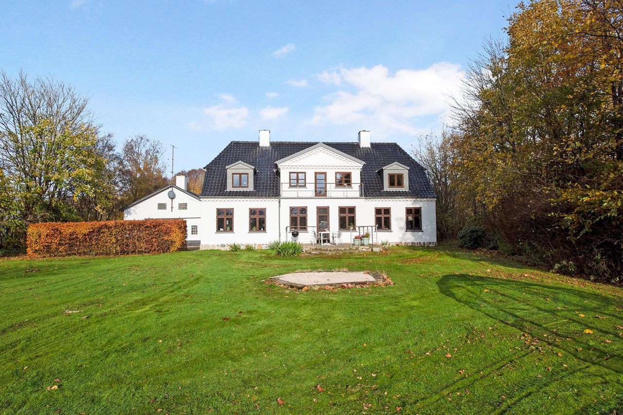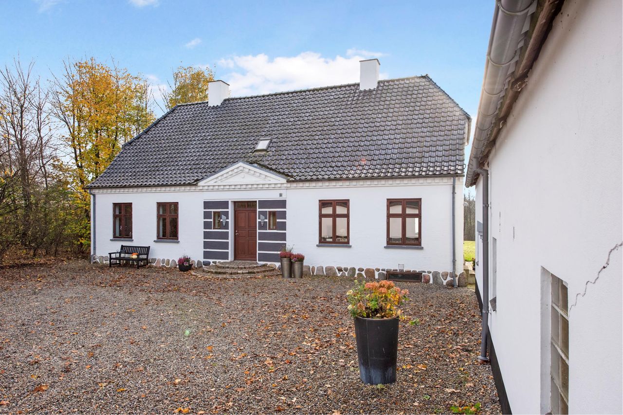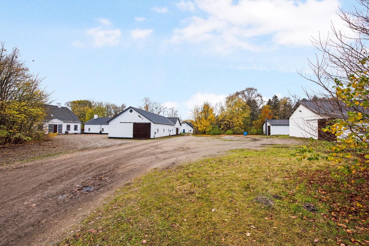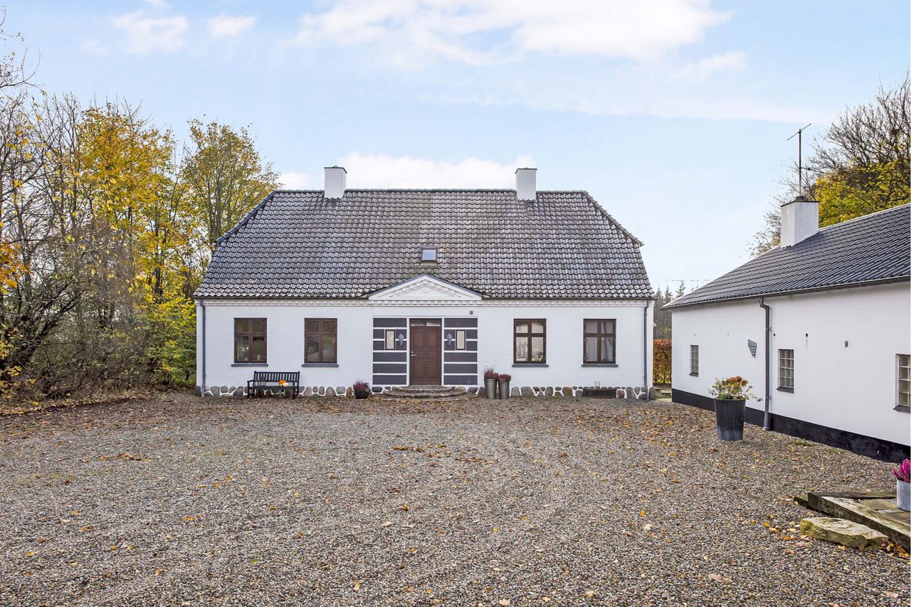 Landsted / domicilejendom med et jordtilliggende på 51.218 m2 (5.1229 ha.) hovedageligt bestående af skov af varierende træsorter. Optimale jagtforhold på ejendommen, der grænser op til store natur- / og skovområder.Bygningsfaciliteterne består af gennemrenoveret stuehus og opdaterede udhuse. Faciliteterne er placeret passende tilbagetrukket (ca. 250 m ) fra hovedfærdselsåren - Tarm Landevej. Herfra asfalteret tilkørselsvej til ejendommen. Hovedbygningen, med den parklignende have grænsende til Omme å, repræsenterer en smuk afbalanceret helhed. Der er tilsagn om tilskud på kr. 125.0000,00 salg af det bevoksede område til flisbehandling. Arealet afleveres efterfølgende rodfræst. INFRASTRUKTUR:--------------------------Ejendommen er beliggende med en afstand til 7400 Herning på ca. 40 km og 7190 Billund - med bl.a. international lufthavn - ca. 25 km. LOKALOMRÅDET:-------------------------Kort afstand - ca. 2 km - til Sdr. omme by med indkøb, dagligvarebutikker, byggemarked, Sdr. Omme Kro, børnehave, nyrenoveret skole, samt moderne kultur-/ og sportsfaciliteter med bl.a. fitnesscenter.Byen, der repræsenterer et aktivt hjørne af Billund Kommune, er kendt for et stærkt og levende lokalengagement. BYGNINGSFACILITETER:==================== STUEHUS:---------------Markant præsentabel bygning, der fremstår i absolut god vedligeholdelsesstand.Facade med pudsede murvægge, mahogni vinduer og -døre og tag af glaseret tegl.Huset har undergået en gennemgribende renovering / opdatering over de senere år. Arbejdets udførelse repræsenterer god og solid håndværksmæssig kvalitet og med anvendelse af et udsøgt materialevalg i respekt for husets oprindelige stil og karakter.Indgangsparti via den store lyse hall med den smukt svungne trappe til 1. salen. Fra hallen adgang til stort kontor / alrum, rummelig opholdsstue med udgang til sydvendt terrasse og via dobbeltdør forbundet med TV-/ opholdsstue. Plankegulve i alle opholdsrum. Fra opholdsstuen dobbeltdør til spisestue med åben bueforbindelse til veldisponeret køkken m. klingkegulv. Herfra mellemgang / baggang til bad m. brus. Gulvvarme overalt i stueetagen.1. salen er indrettet med repos / mellemgang over trappetårnet. I forb. hermed stort soveværelse i sydvendt karnap m. udgang til altan med panorama over omgivelserne. Endvidere 2 gode østvendte gavlværelser. Et kapitel for sig er det meget rummelige luksusbad / walk-in med bl.a. stor skabsvæg og centreret fritliggende bruseniche i åbent glasparti. I direkte forbindelse hermed forskudt hævet badekar ved sydvendt vinduesparti, hvorfra udsigten over landskabet kan nydes. Interiør og materialevalg fremstår fint indbyrdes afstemt. Klinkegulv ilagt varme.Samlet boligareal jfr. BBR-meddelelse: 230 m2. UDHUS:------------Facade med pudsede murvægge og tag af Lindab Stål.Indretning med fyrrum, vaskerum, grovkøkken samt værksted /maskinhus.Areal jfr. BBR-medd.: 383 m2 + 162 m2 tagetage. UDHUS:-----------Facade med pudsede letbetonsten og tag af Lindab Stål.Indretning som ladebygning / magasin.Areal jfr. BBR-medd.: 232 m2. UDHUS:------------Facade af pudsede letbetonsten og tag af Lindab Stål.Anvendelse oplag af træpiller m.v.Areal jfr. BBR-medd.: 129 m2.