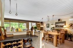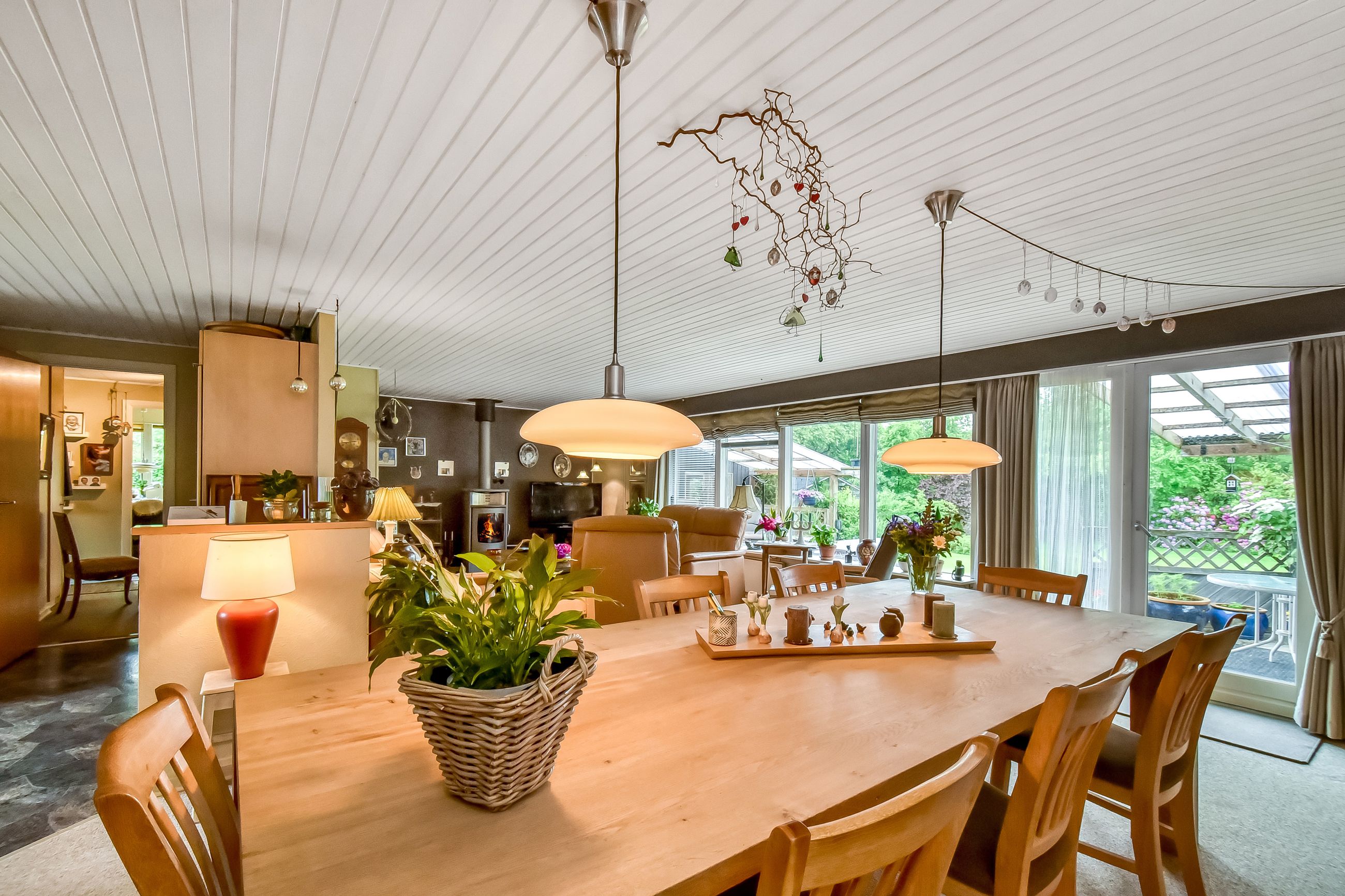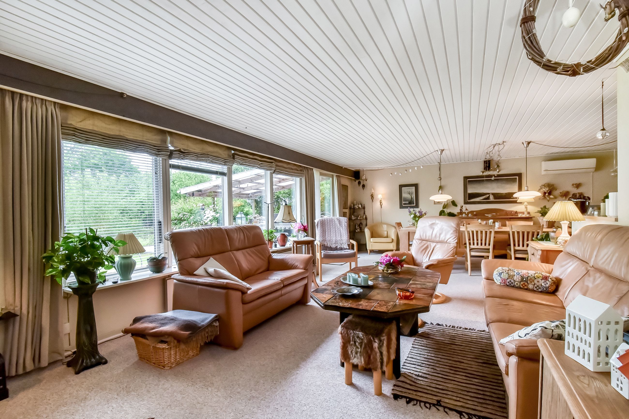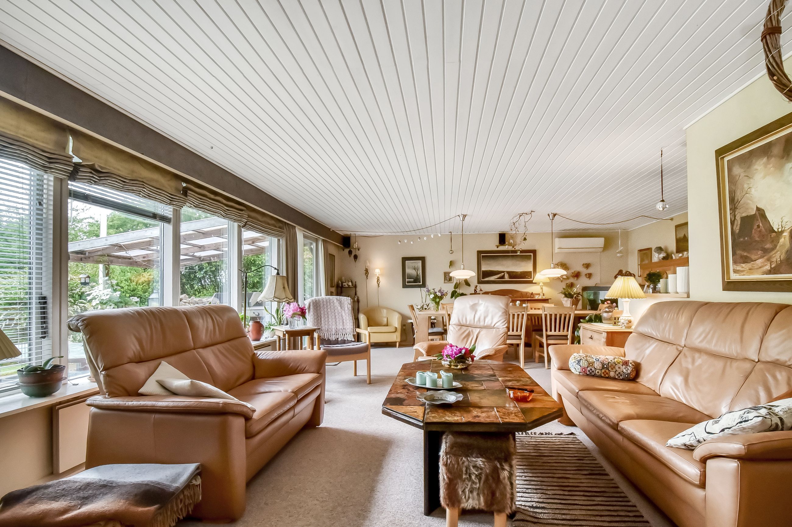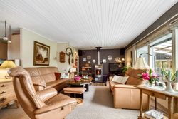 åben forbindelse med køkken. Stuen har brændeovn, og store vinduesfacader mod haven, ligesom der er