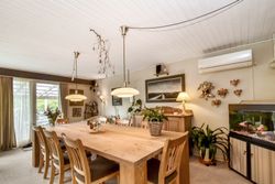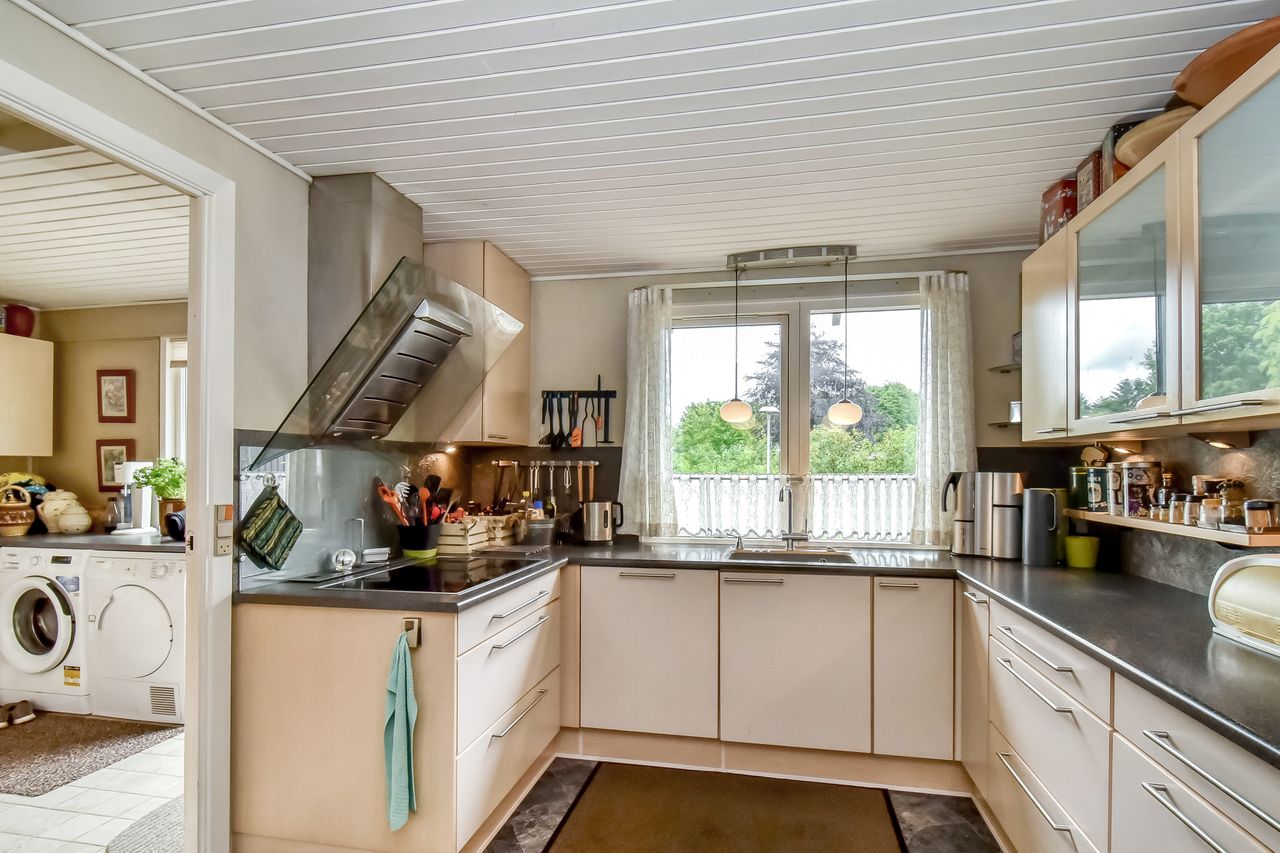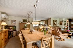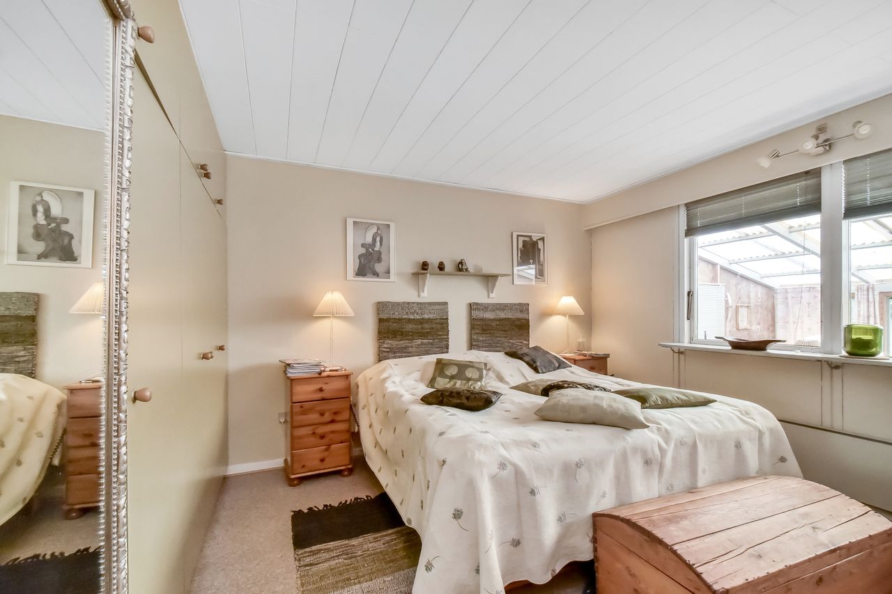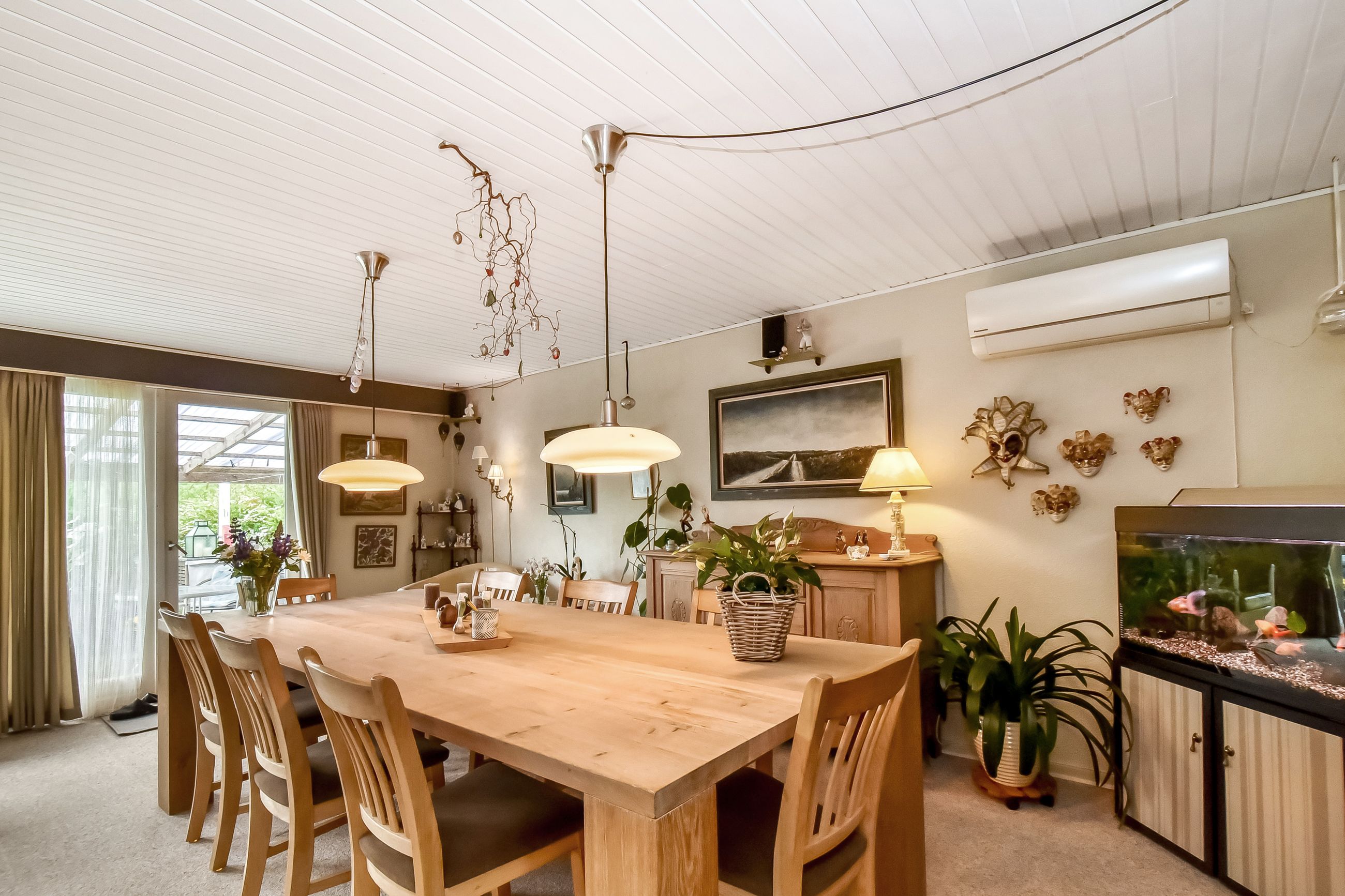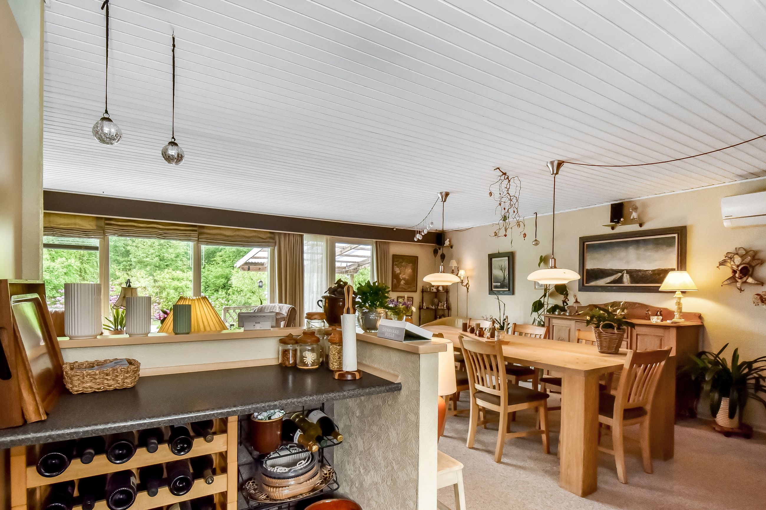 åben forbindelse med køkken. Stuen har brændeovn, og store vinduesfacader mod haven, ligesom der er