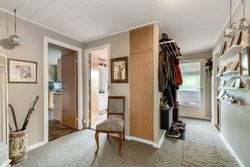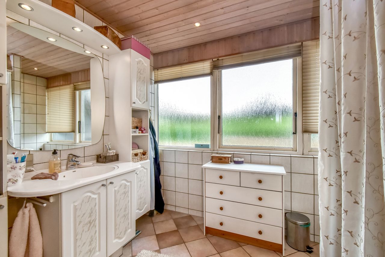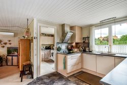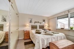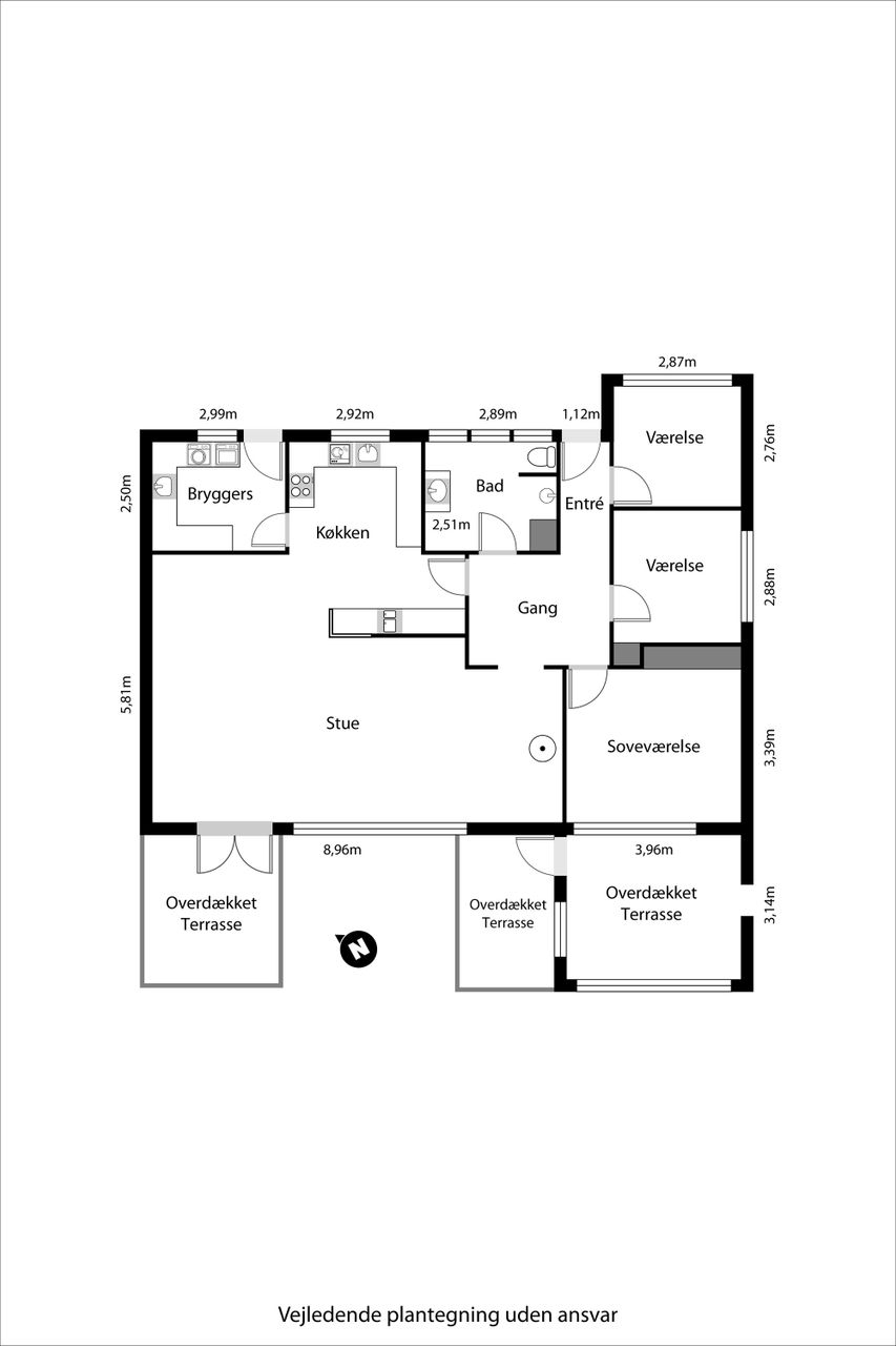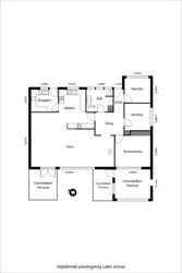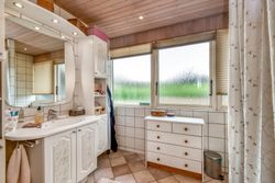 faste skabe, yderligere to værelser. Badeværelset har bruseniche og hvidt inventar og hvide klinker.