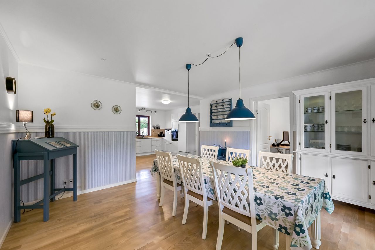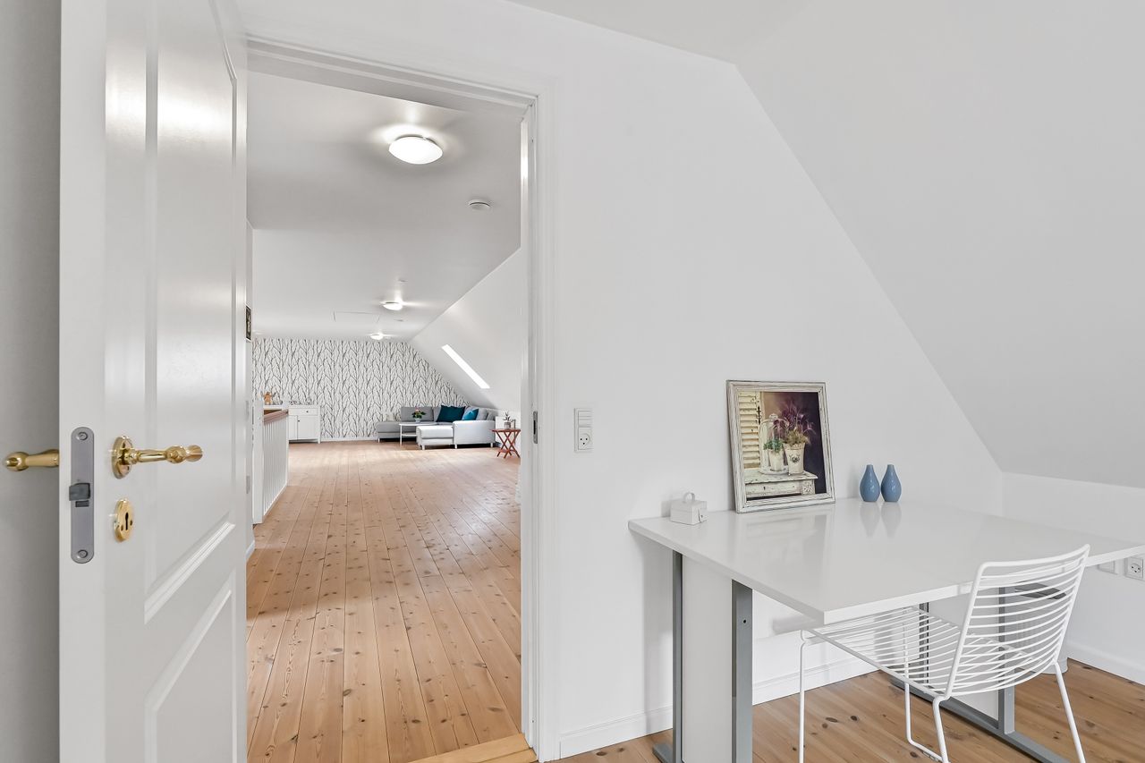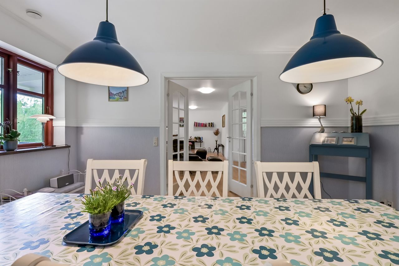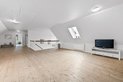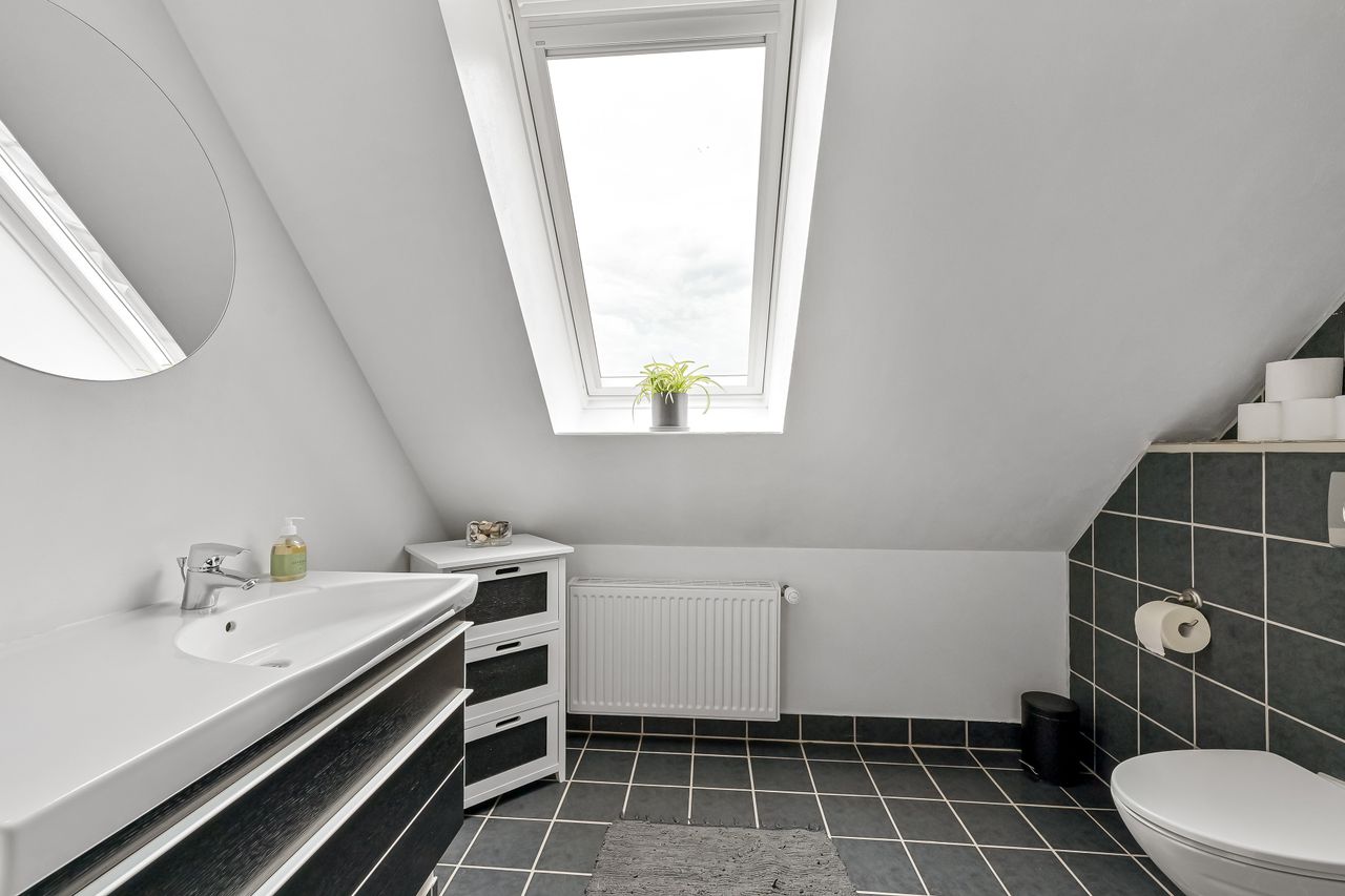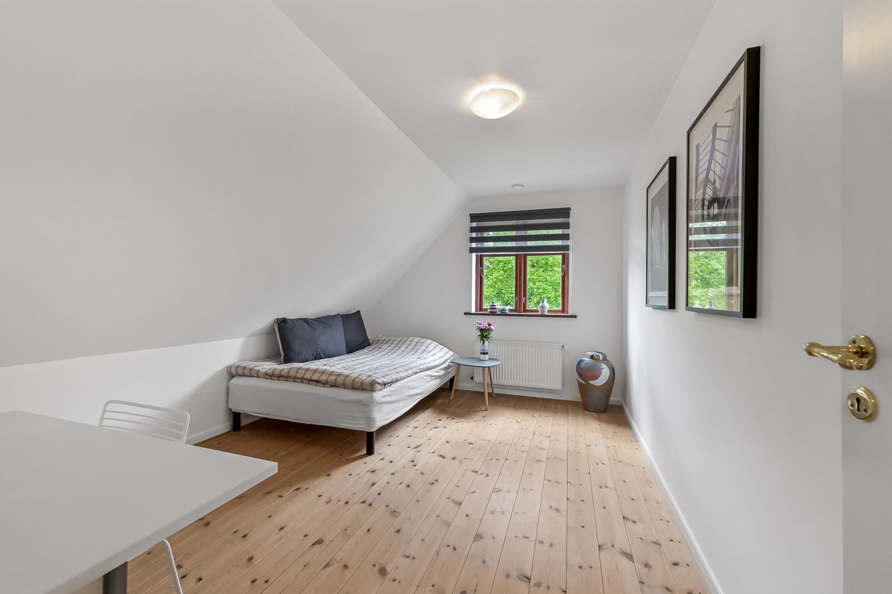 På første sal venter to store værelser samt endnu et badeværelse med bruseniche. En stor stue giver ekstra plads til afslapning eller leg for familiens yngste medlemmer. Hele stueetagen har behagelig gulvvarme, mens radiatorerne på første sal sikrer en jævn varmefordeling i vintermånederne.