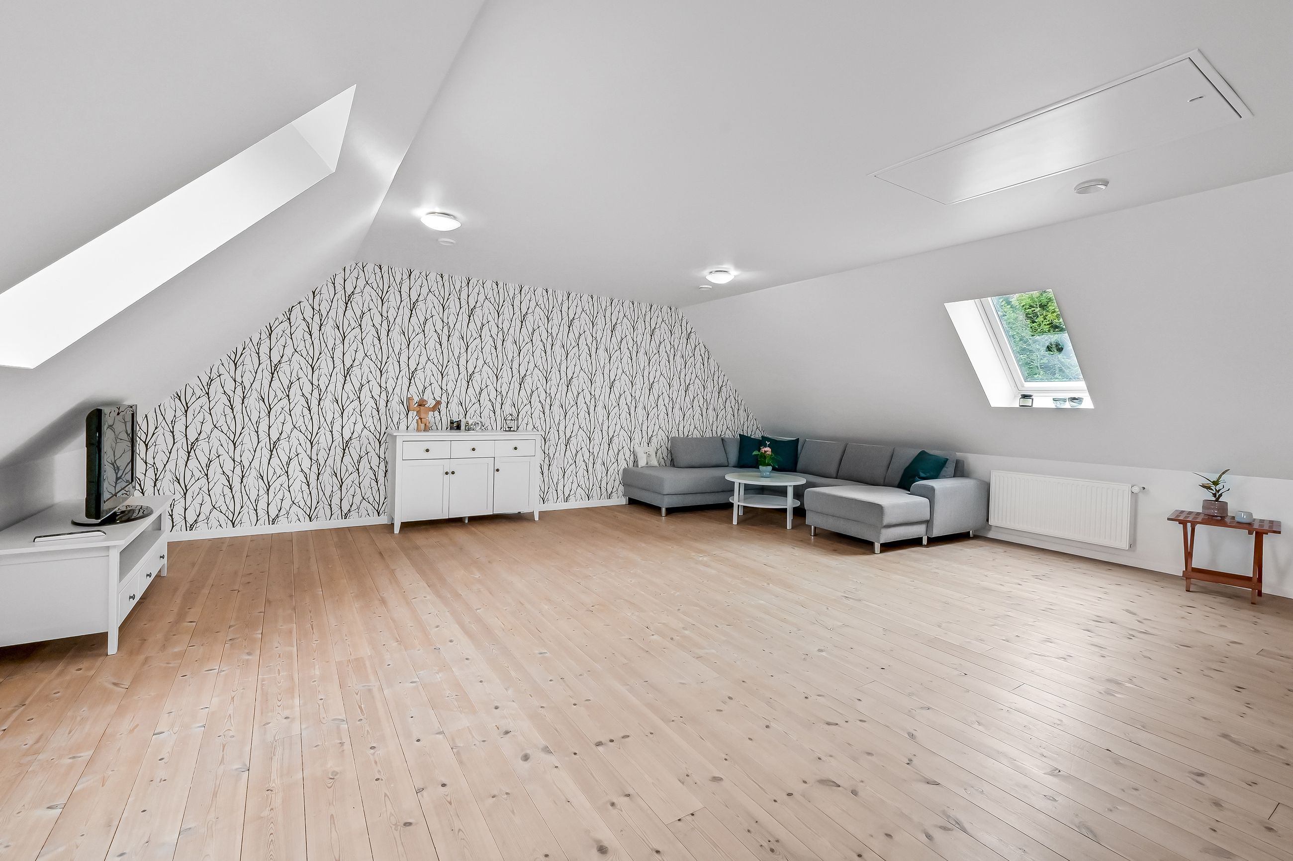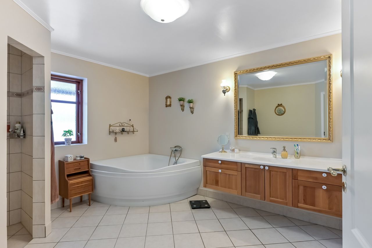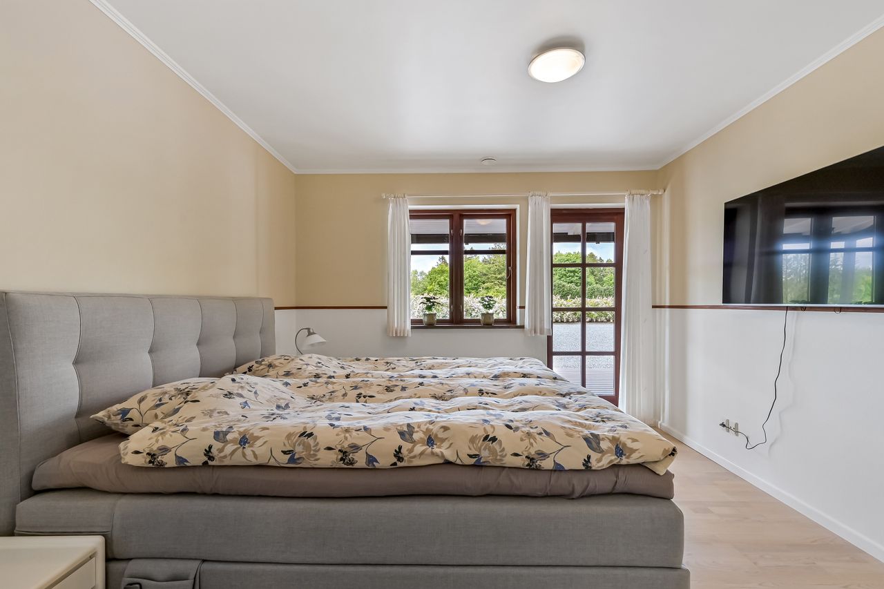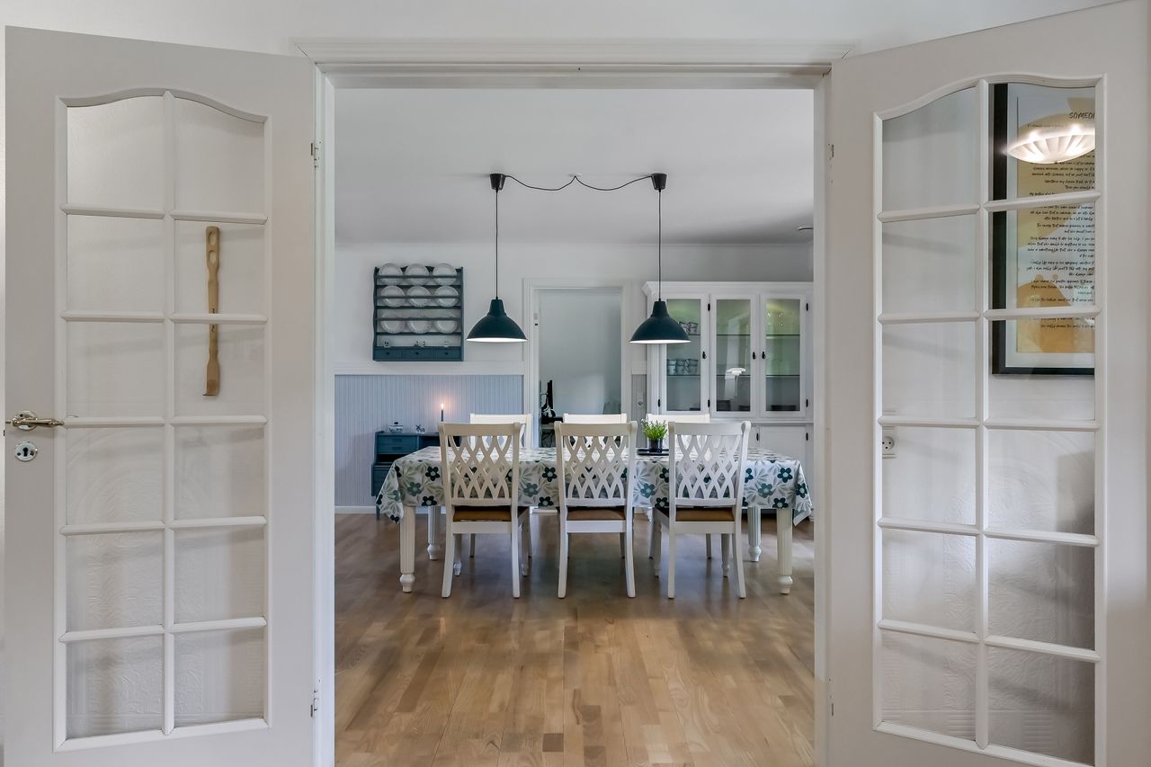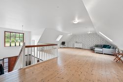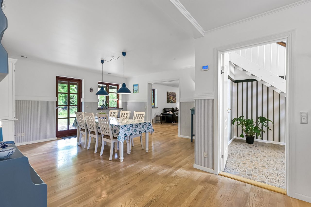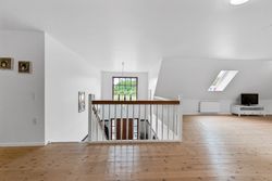 På første sal venter to store værelser samt endnu et badeværelse med bruseniche. En stor stue giver ekstra plads til afslapning eller leg for familiens yngste medlemmer. Hele stueetagen har behagelig gulvvarme, mens radiatorerne på første sal sikrer en jævn varmefordeling i vintermånederne.