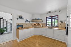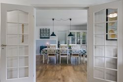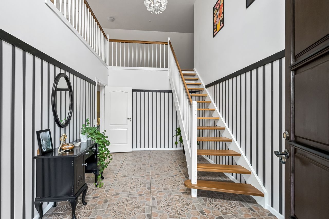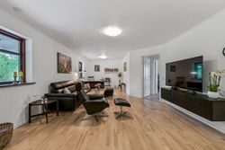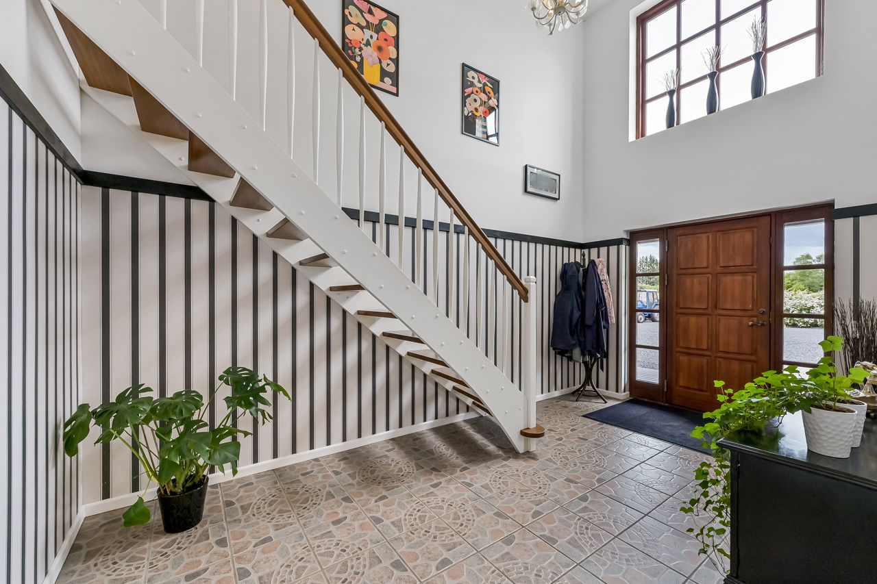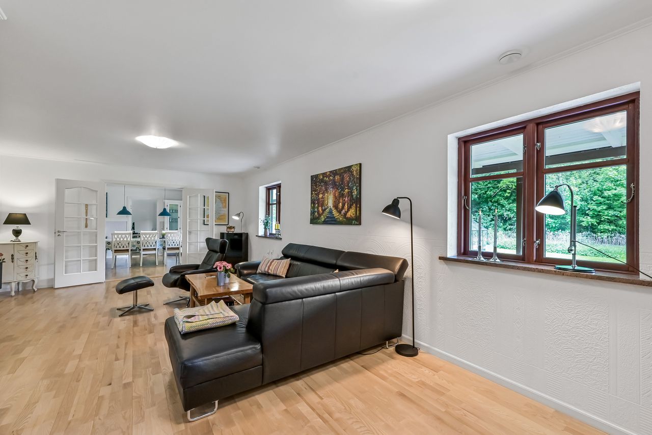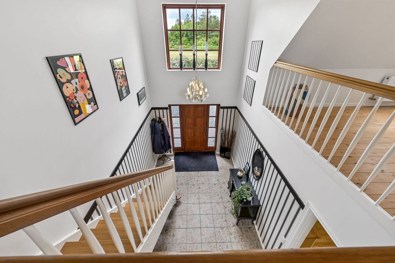 Via en dobbelt fransk dør kommer man fra køkkenet og ind i den hyggelige stue, som fører videre til forældreafsnittet. Her finder man et skønt badeværelse med spa og bruseniche samt et soveværelse med egen udgang til haven og adgang til en åben walk-in garderobe. Den imponerende hall er et perfekt sted at byde gæster velkommen og den forbinder på bedste vis husets over- og underetage.