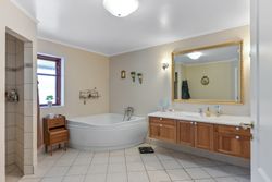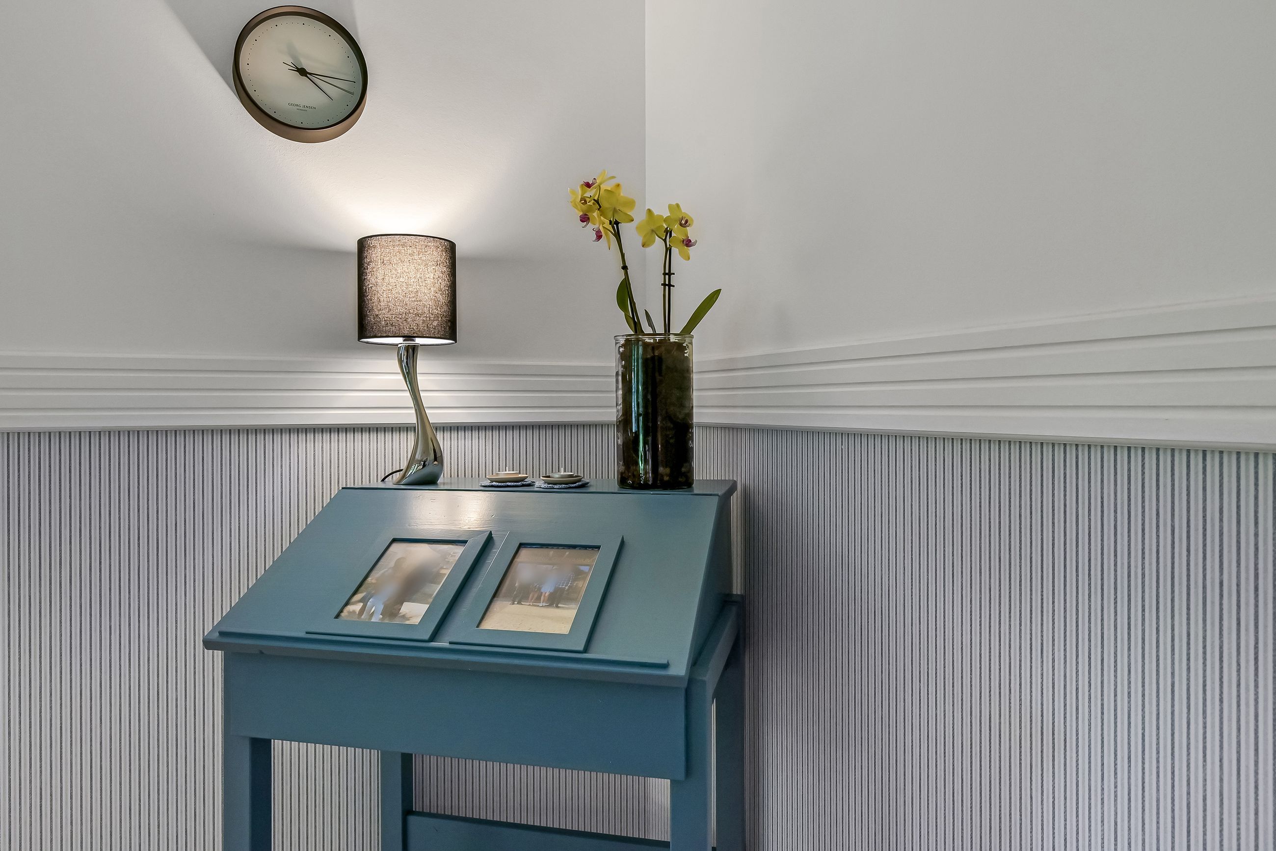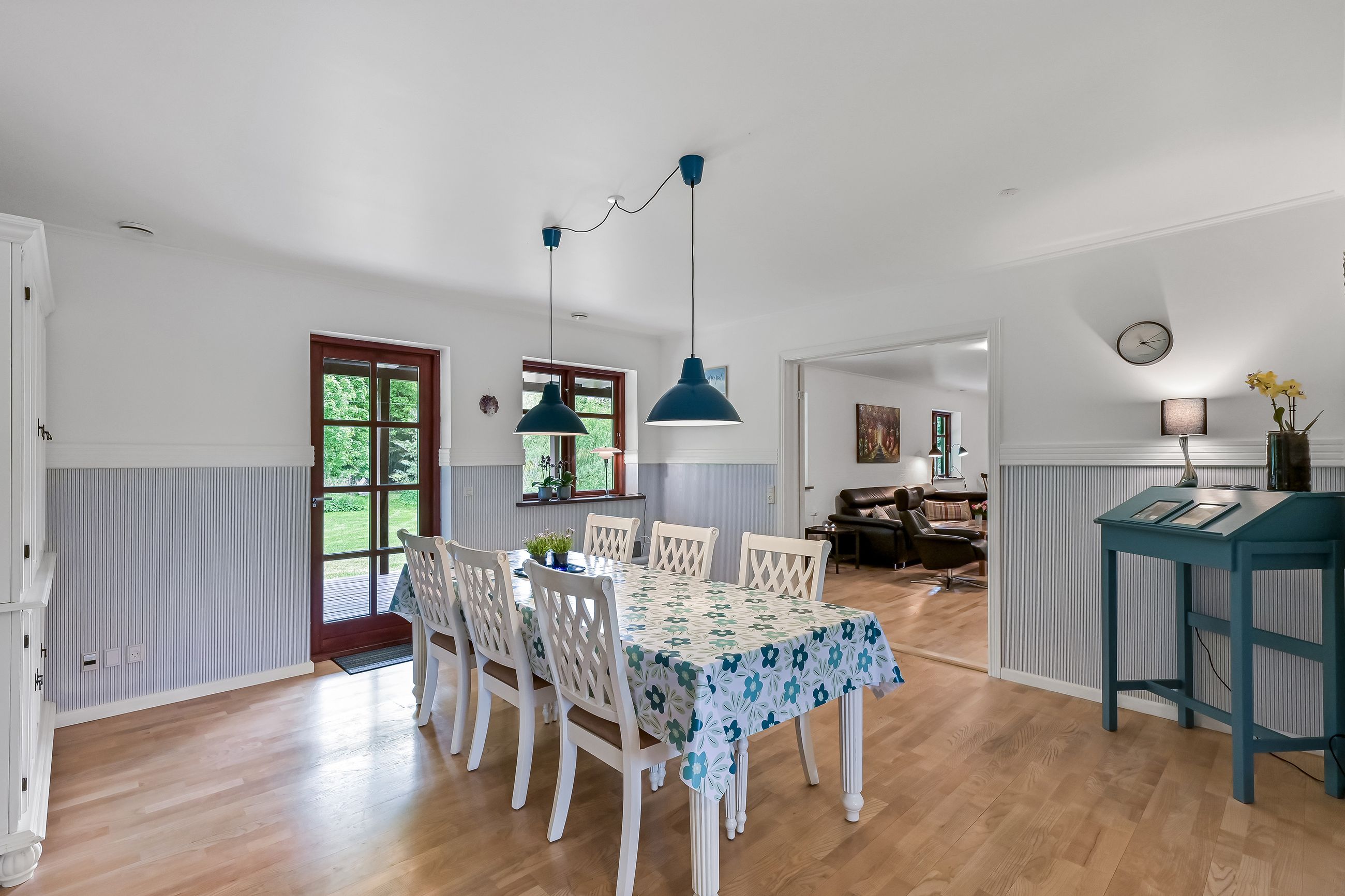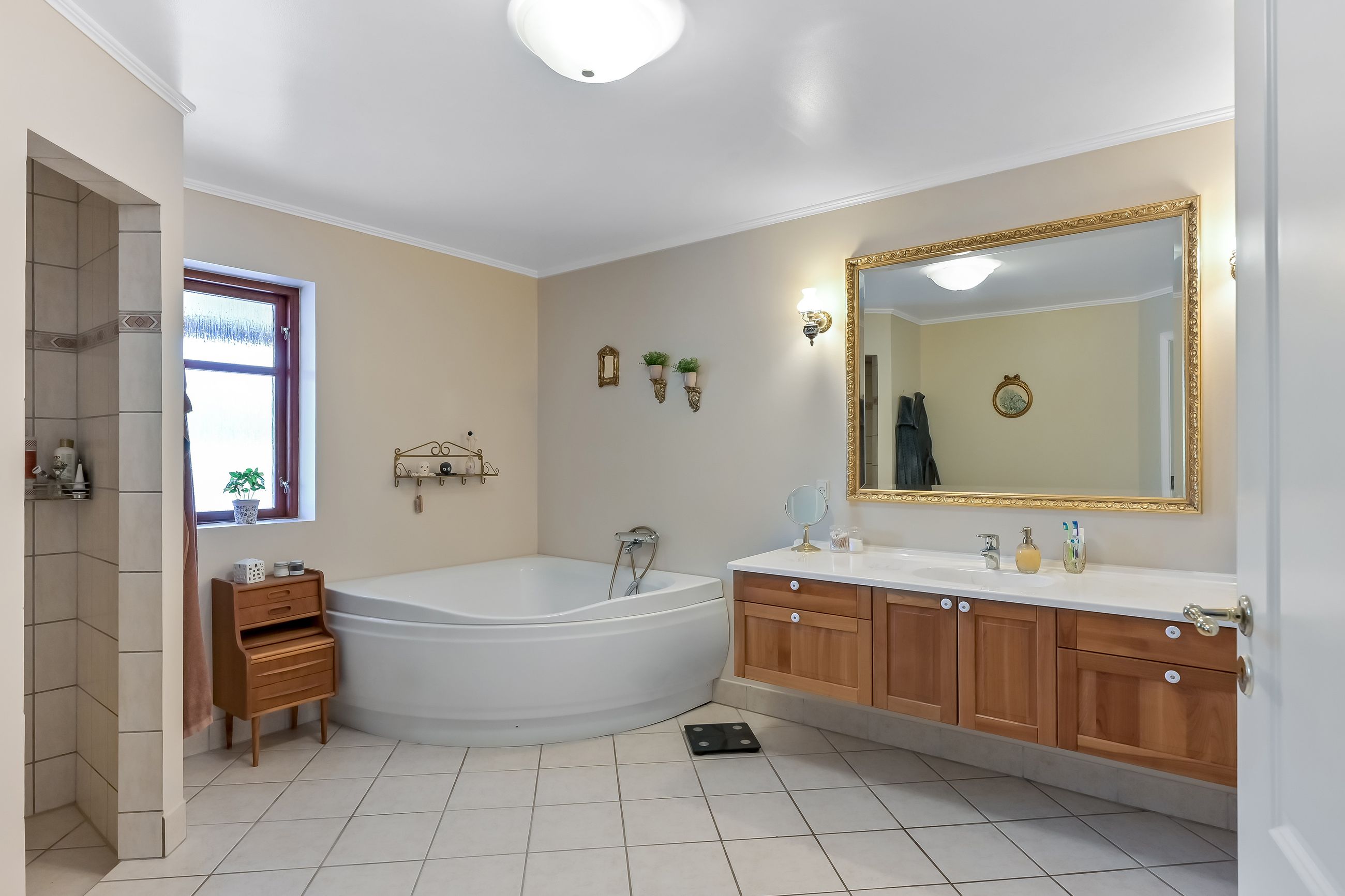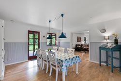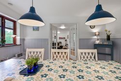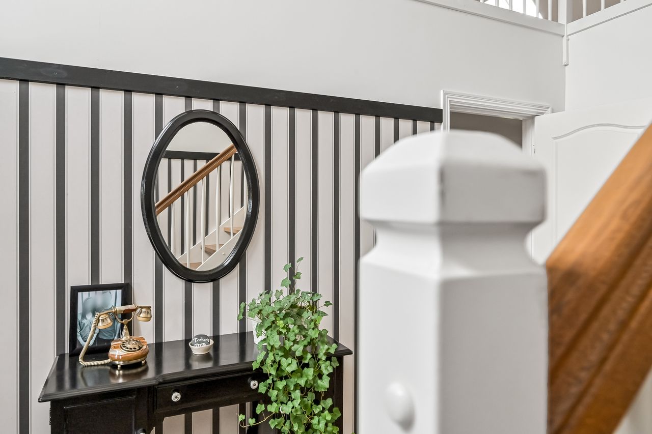 Via en dobbelt fransk dør kommer man fra køkkenet og ind i den hyggelige stue, som fører videre til forældreafsnittet. Her finder man et skønt badeværelse med spa og bruseniche samt et soveværelse med egen udgang til haven og adgang til en åben walk-in garderobe. Den imponerende hall er et perfekt sted at byde gæster velkommen og den forbinder på bedste vis husets over- og underetage.
