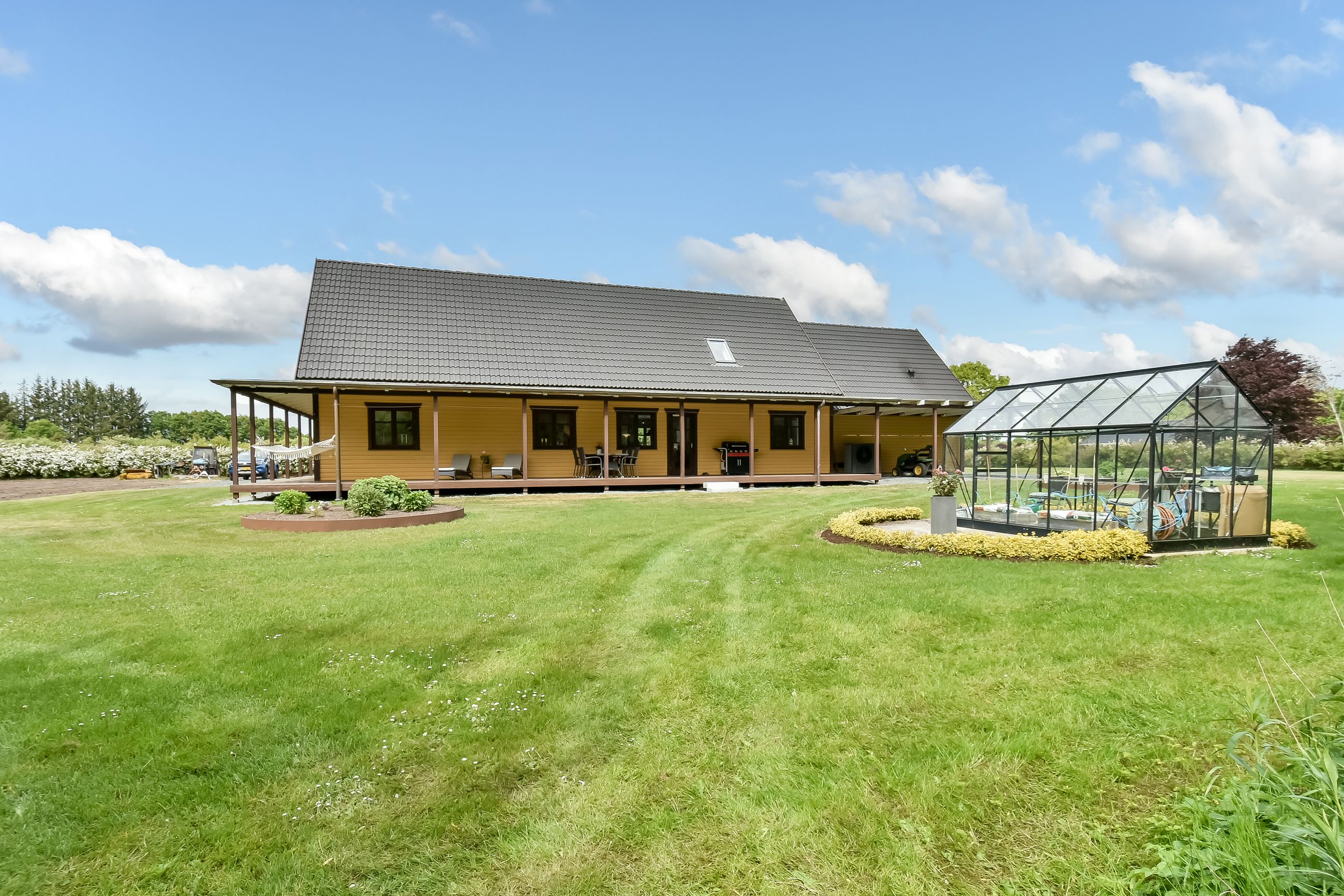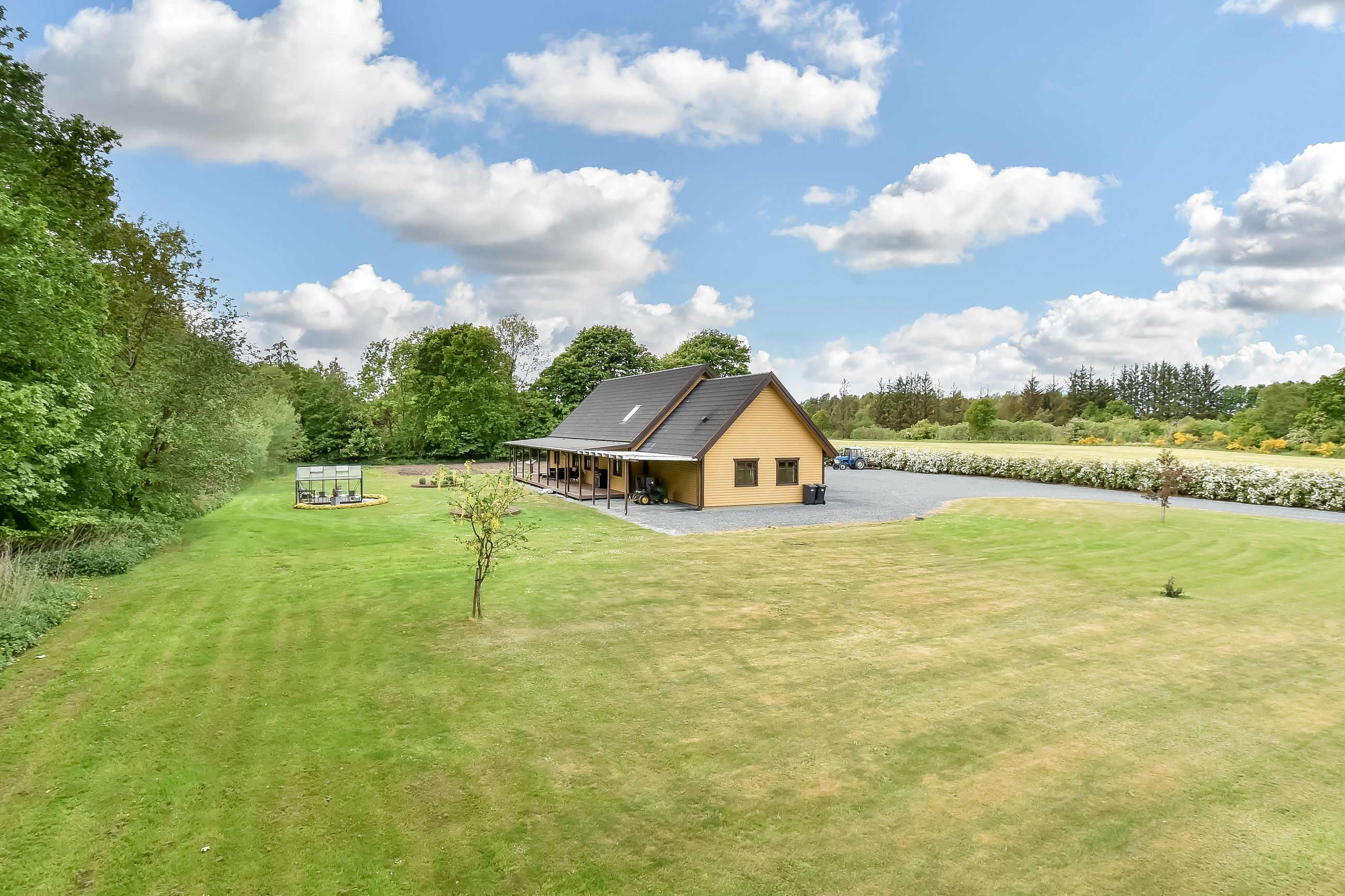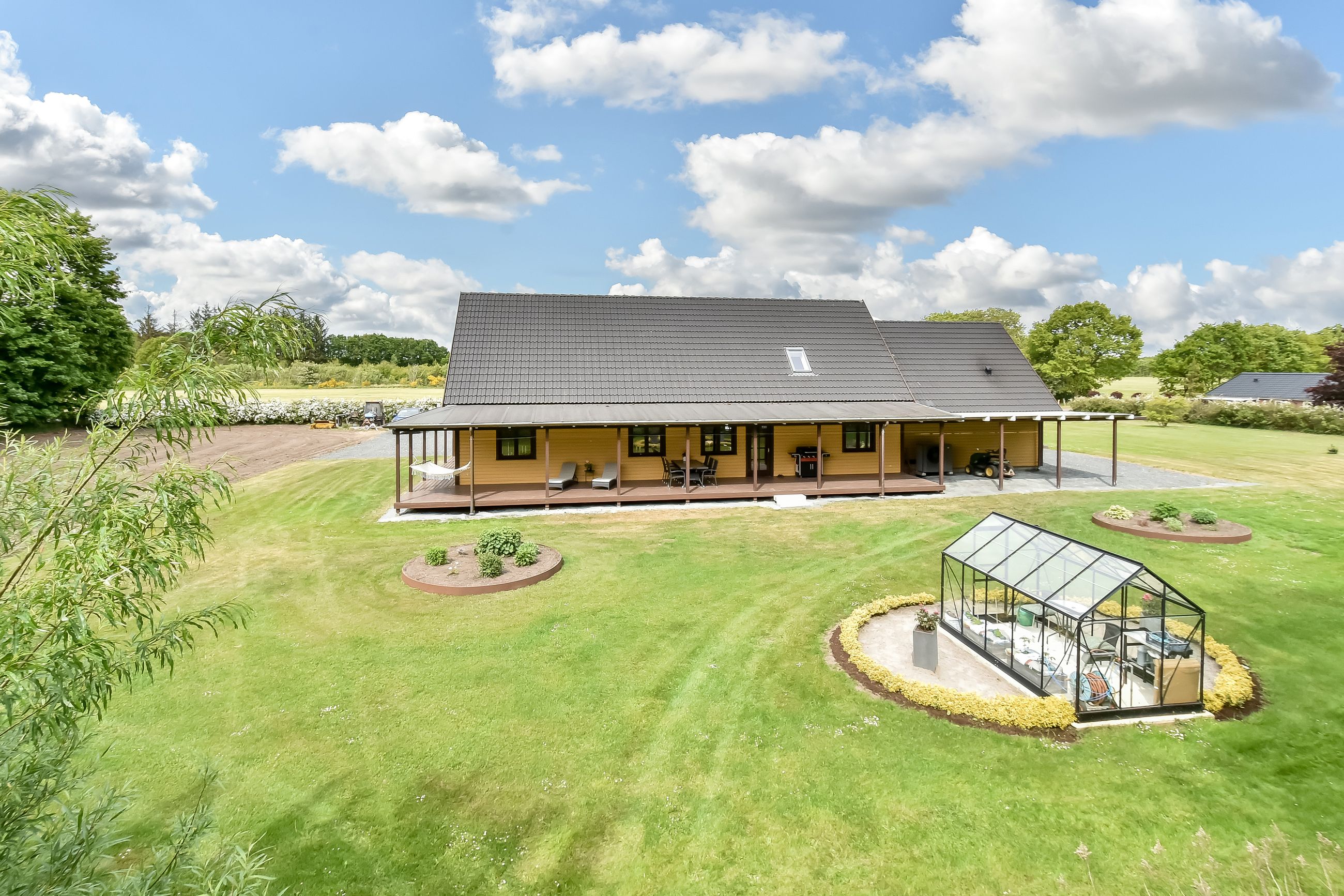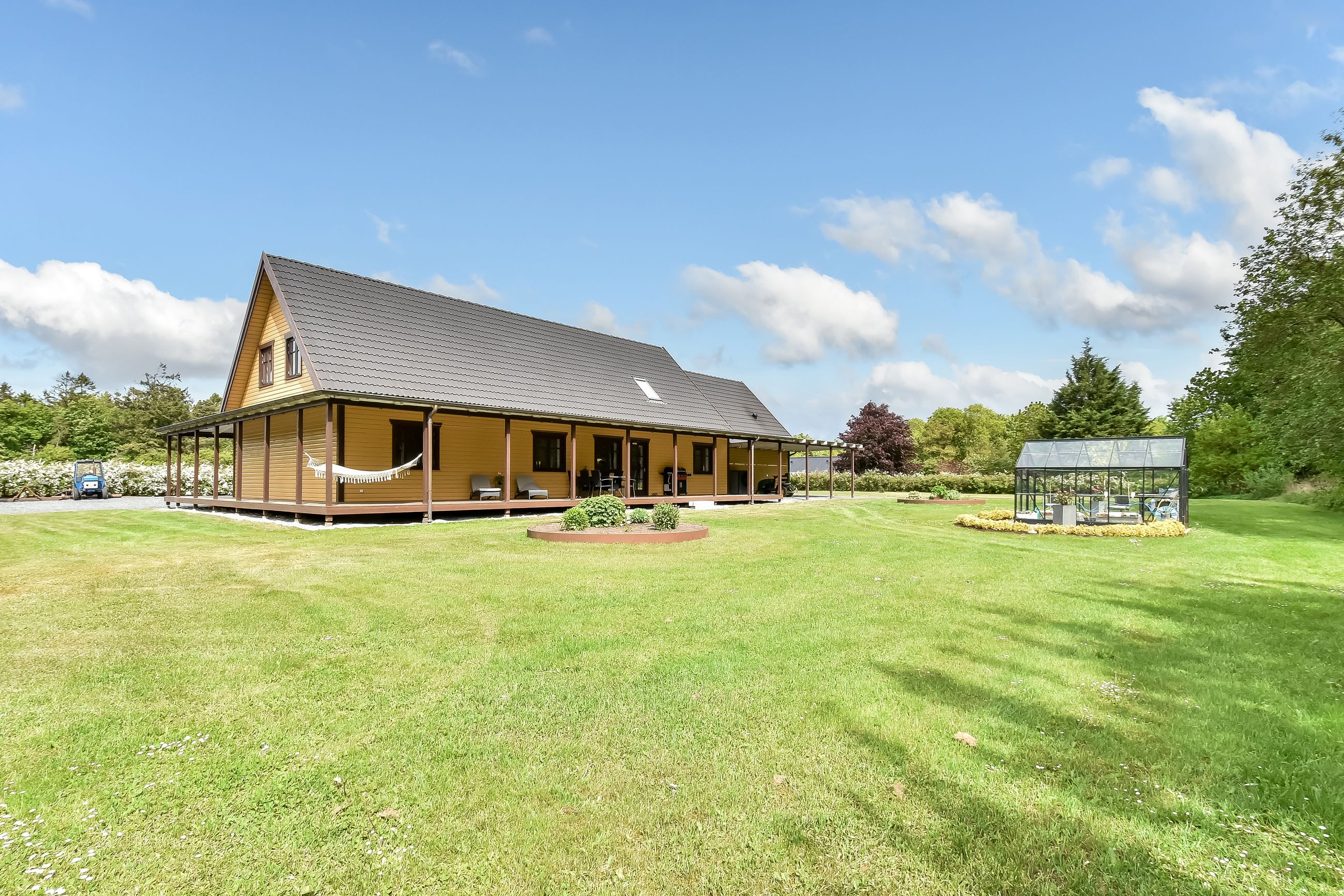 Udenfor breder sig en stor gårdsplads foran ejendommen, mens baghaven tilbyder masser af muligheder for både pryd- og køkkenhaveentusiaster – komplet med drivhus. Med en beliggenhed lige udenfor byskiltet i Thyregod får du her det bedste fra begge verdener: Landlig idyl tæt på landsbyens bekvemmeligheder såsom indkøbsmuligheder, folkeskole, børnehave samt togstation.