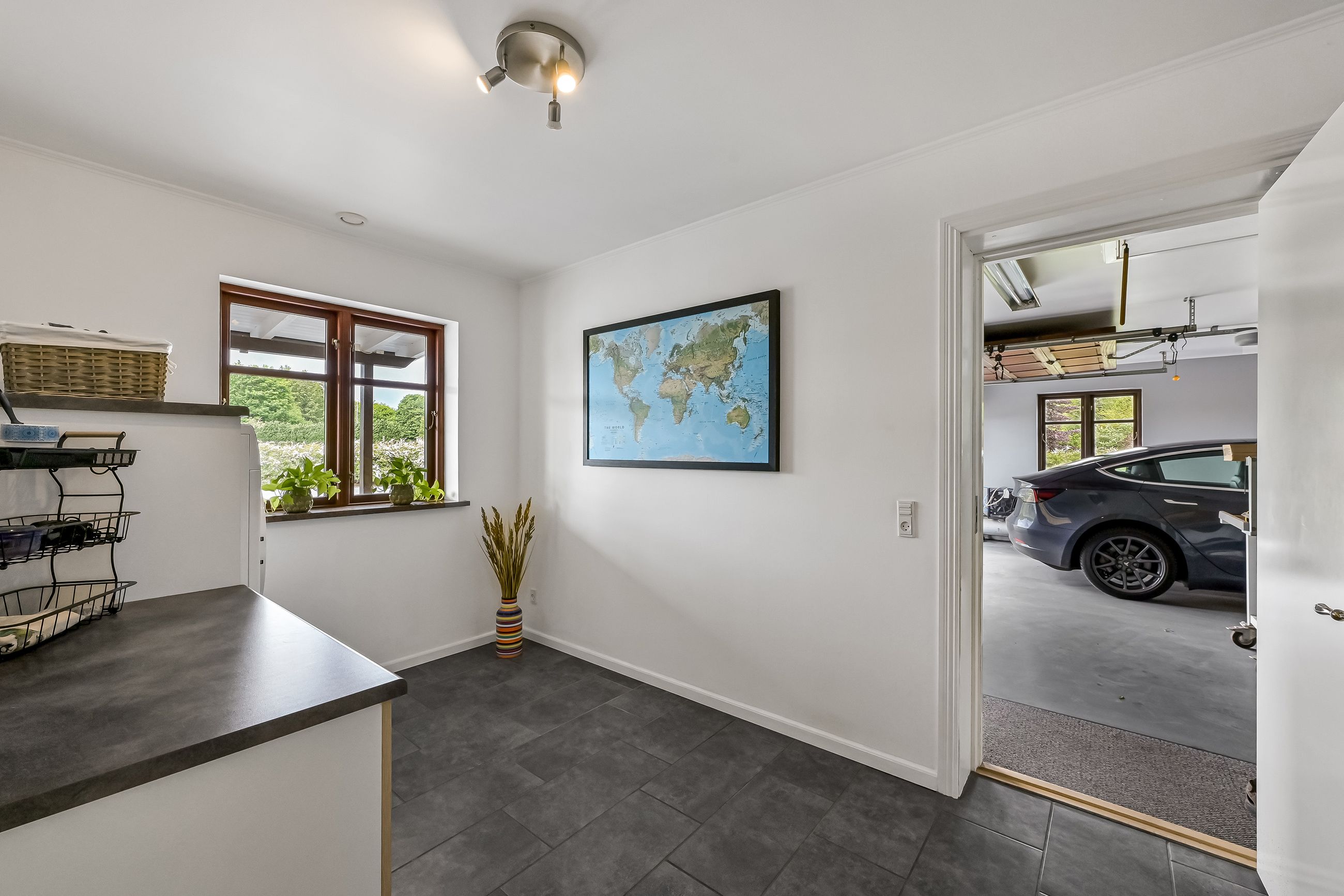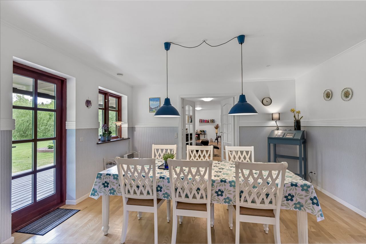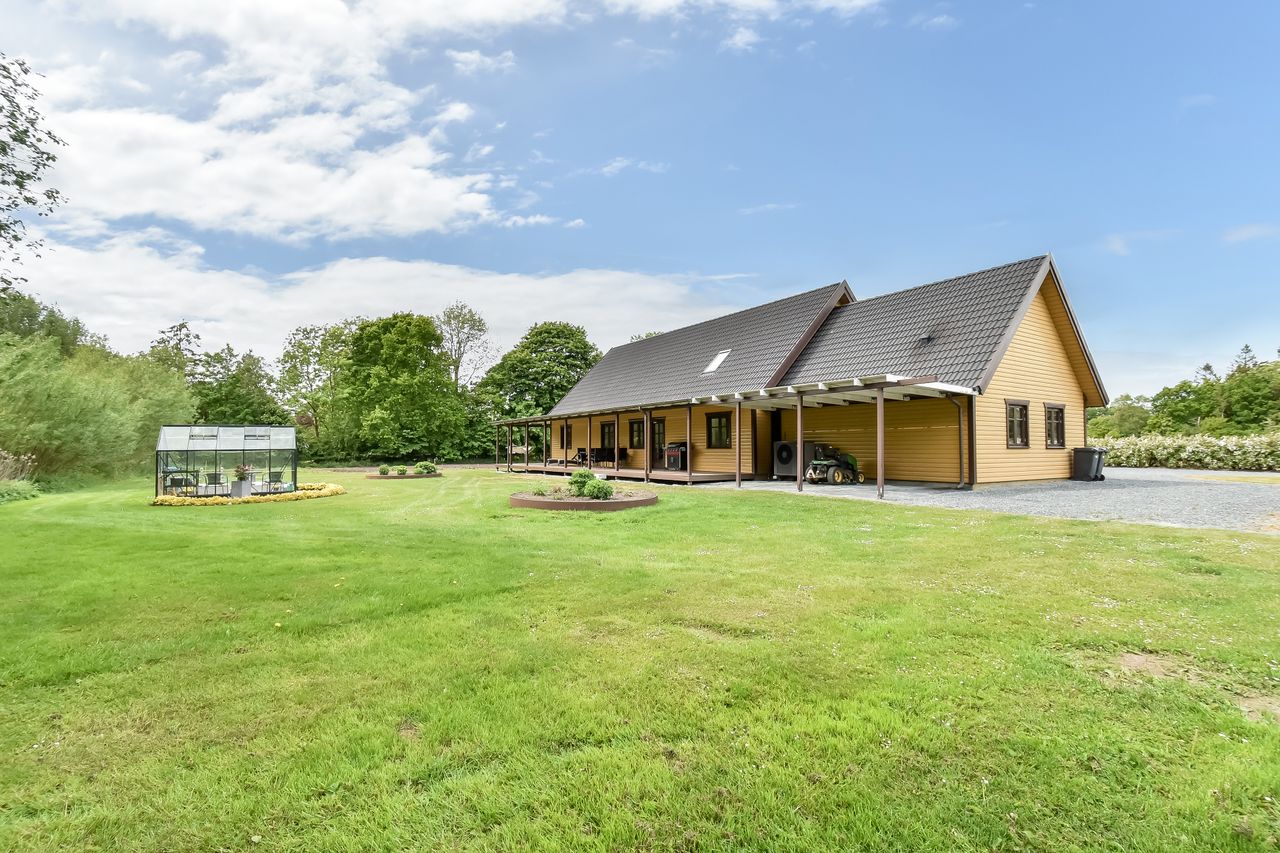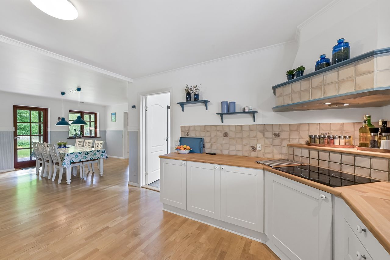 Den integrerede garage på 49 m2 er udstyret med et slidstærkt epoxygulv og elport og herfra er der direkte adgang til teknikrummet, hvor en effektiv luft-til-vand varmepumpe sørger for husets opvarmning. Indenfor byder baggangen på et praktisk vaskerum, mens det store landkøkken imponerer med rigelig plads til både madlavning og samvær omkring spisebordet. Herfra kan man træde direkte ud på verandaen og nyde udsigten over den ugenerte have. Endvidere forefindes der et godt kontor eller børneværelse ved siden af køkkenet.