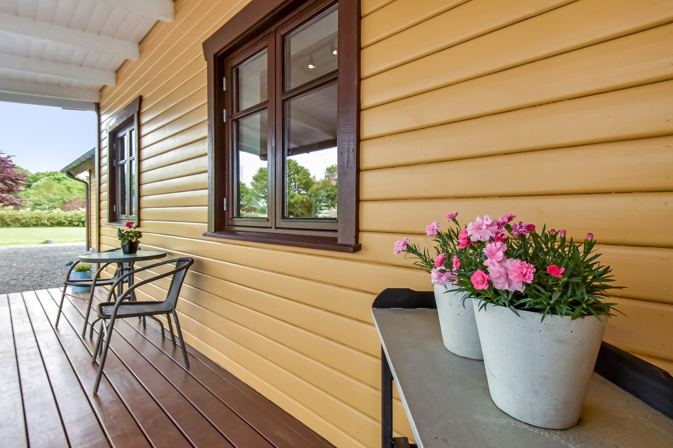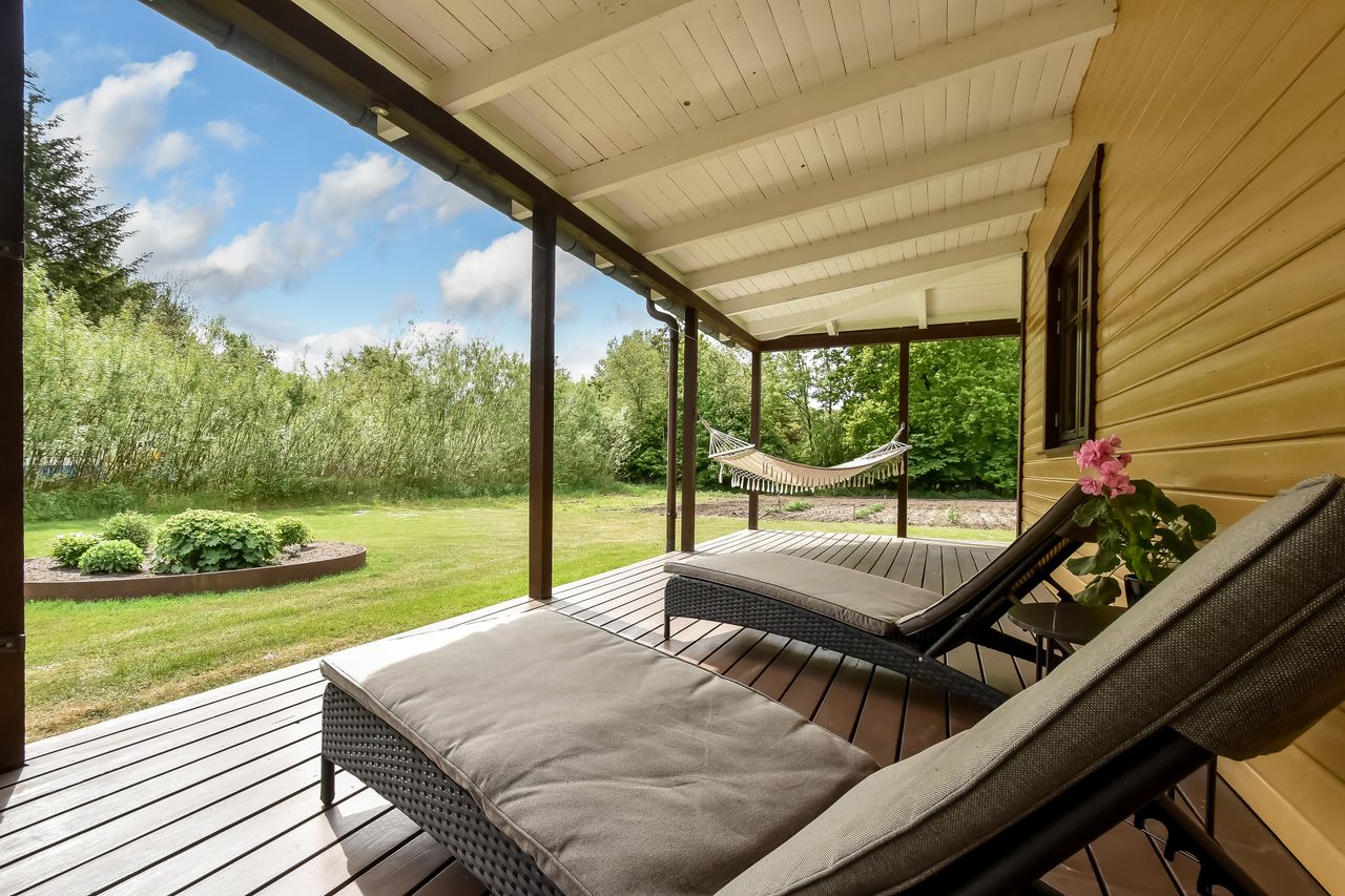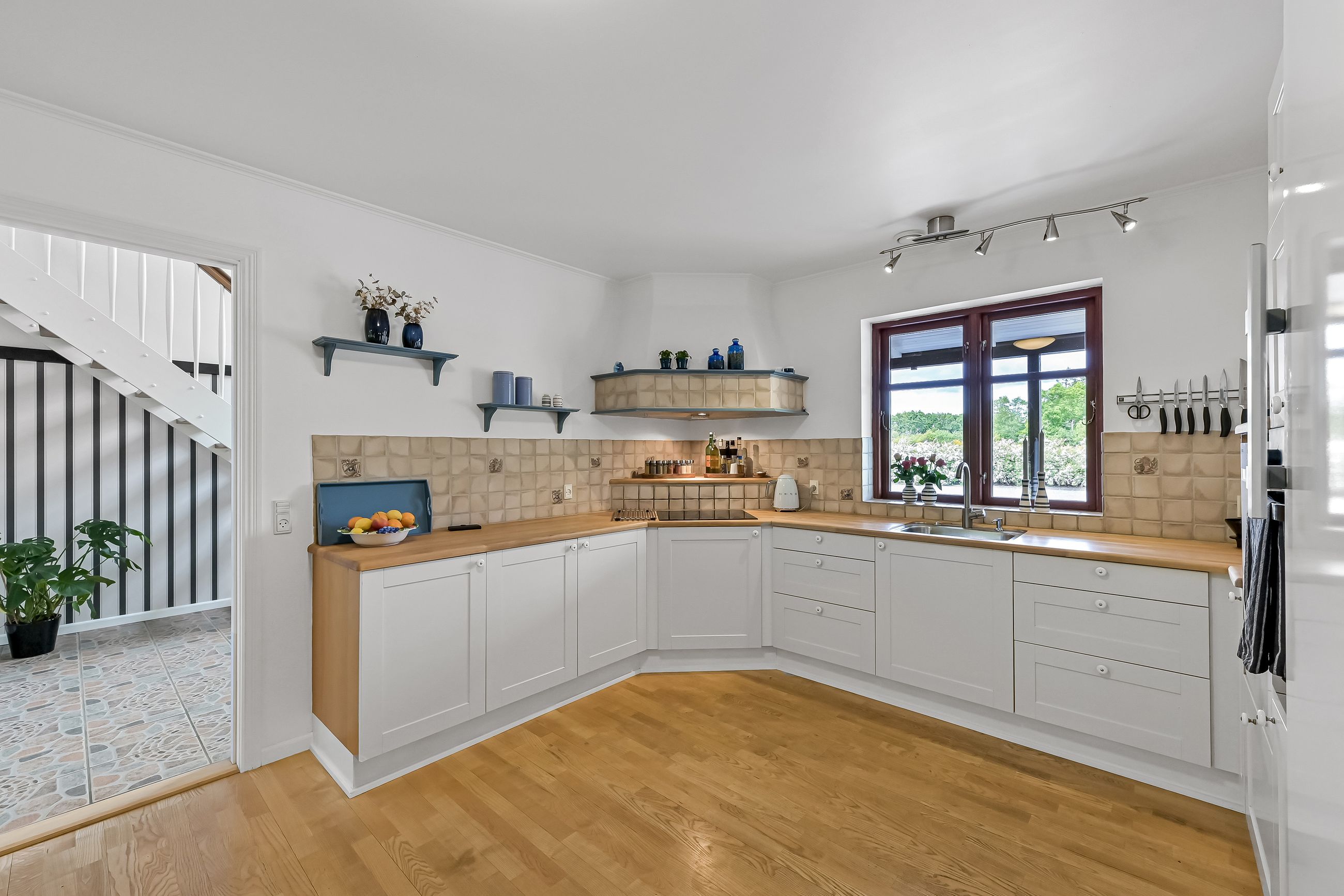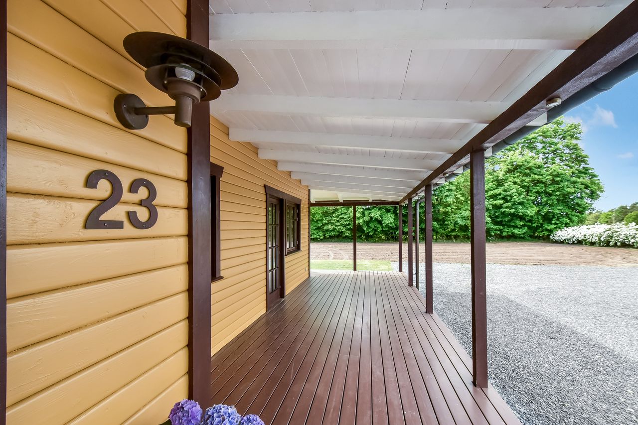 Den integrerede garage på 49 m2 er udstyret med et slidstærkt epoxygulv og elport og herfra er der direkte adgang til teknikrummet, hvor en effektiv luft-til-vand varmepumpe sørger for husets opvarmning. Indenfor byder baggangen på et praktisk vaskerum, mens det store landkøkken imponerer med rigelig plads til både madlavning og samvær omkring spisebordet. Herfra kan man træde direkte ud på verandaen og nyde udsigten over den ugenerte have. Endvidere forefindes der et godt kontor eller børneværelse ved siden af køkkenet.