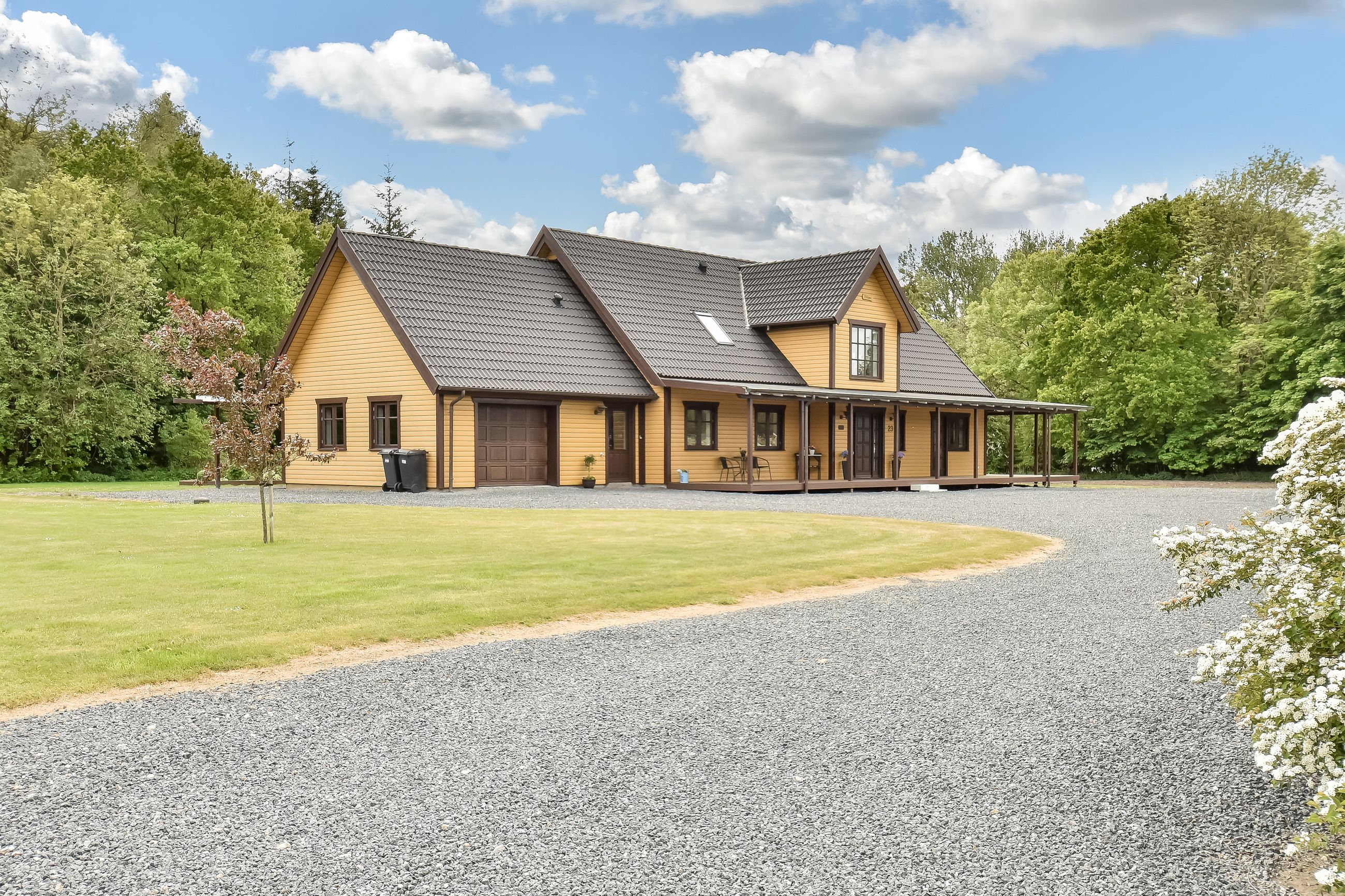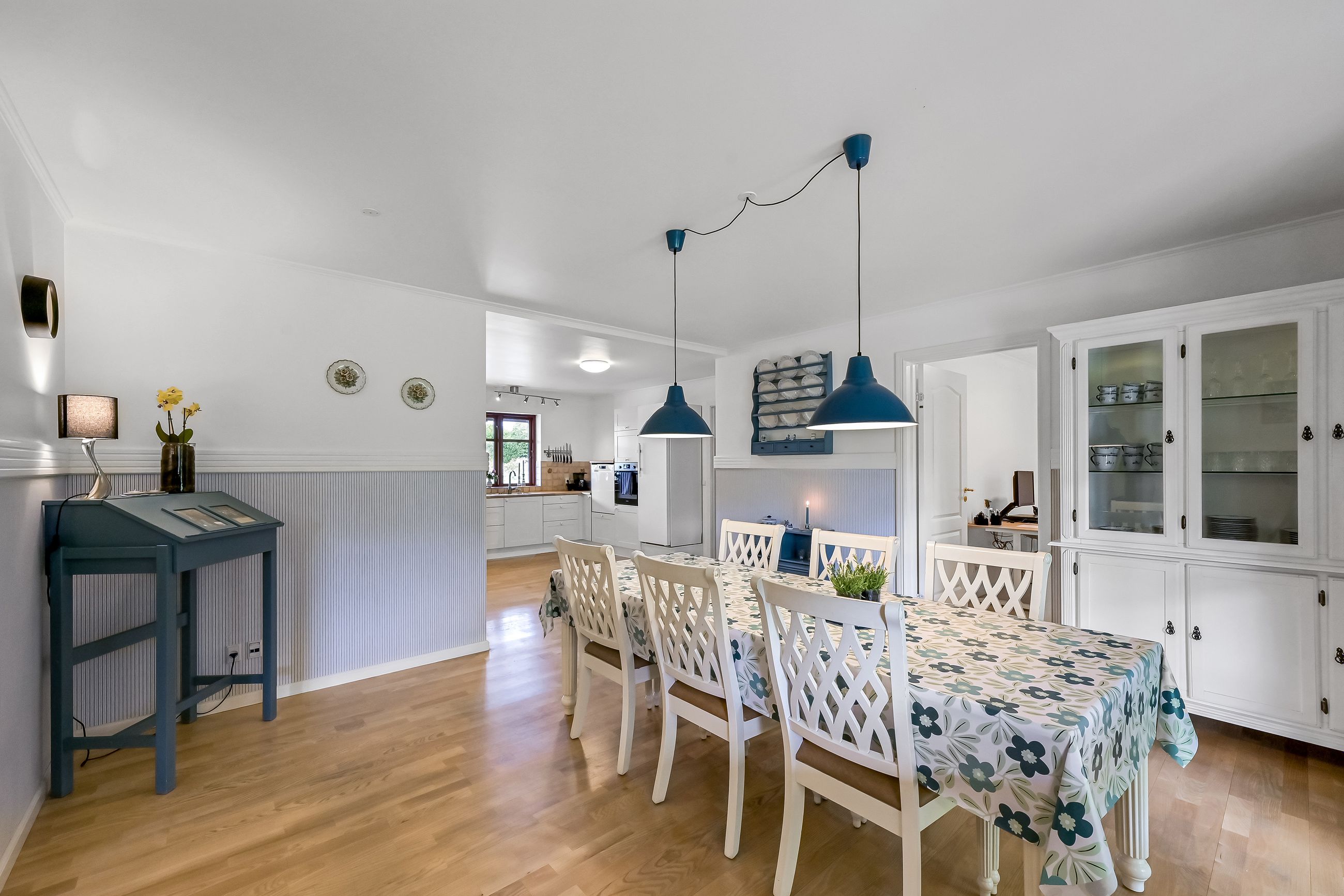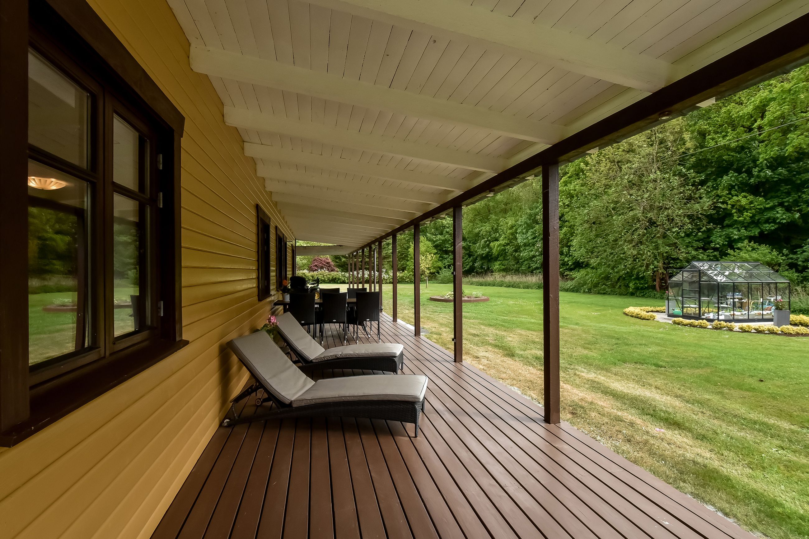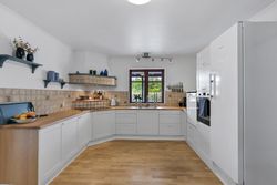 Den integrerede garage på 49 m2 er udstyret med et slidstærkt epoxygulv og elport og herfra er der direkte adgang til teknikrummet, hvor en effektiv luft-til-vand varmepumpe sørger for husets opvarmning. Indenfor byder baggangen på et praktisk vaskerum, mens det store landkøkken imponerer med rigelig plads til både madlavning og samvær omkring spisebordet. Herfra kan man træde direkte ud på verandaen og nyde udsigten over den ugenerte have. Endvidere forefindes der et godt kontor eller børneværelse ved siden af køkkenet.